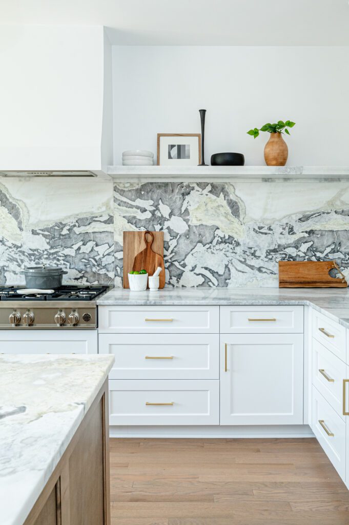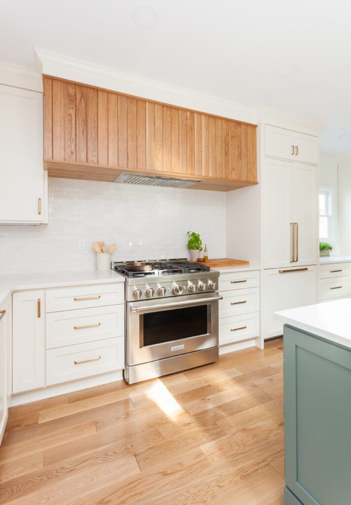 A great way to introduce mixed materials in a kitchen design is with a statement range hood.
