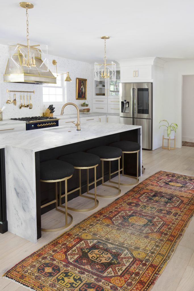 Accessories can completely transform a space. A bold vintage runner and unique artwork bring some drama to this stunning kitchen.