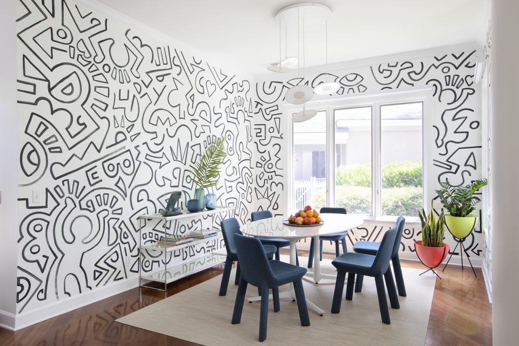 Dining rooms are continuations of kitchens and deserve just as much character. This space was elevated with a geometric mural painted by Carrie Beth Waghorn.
