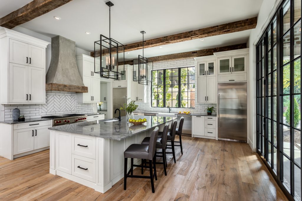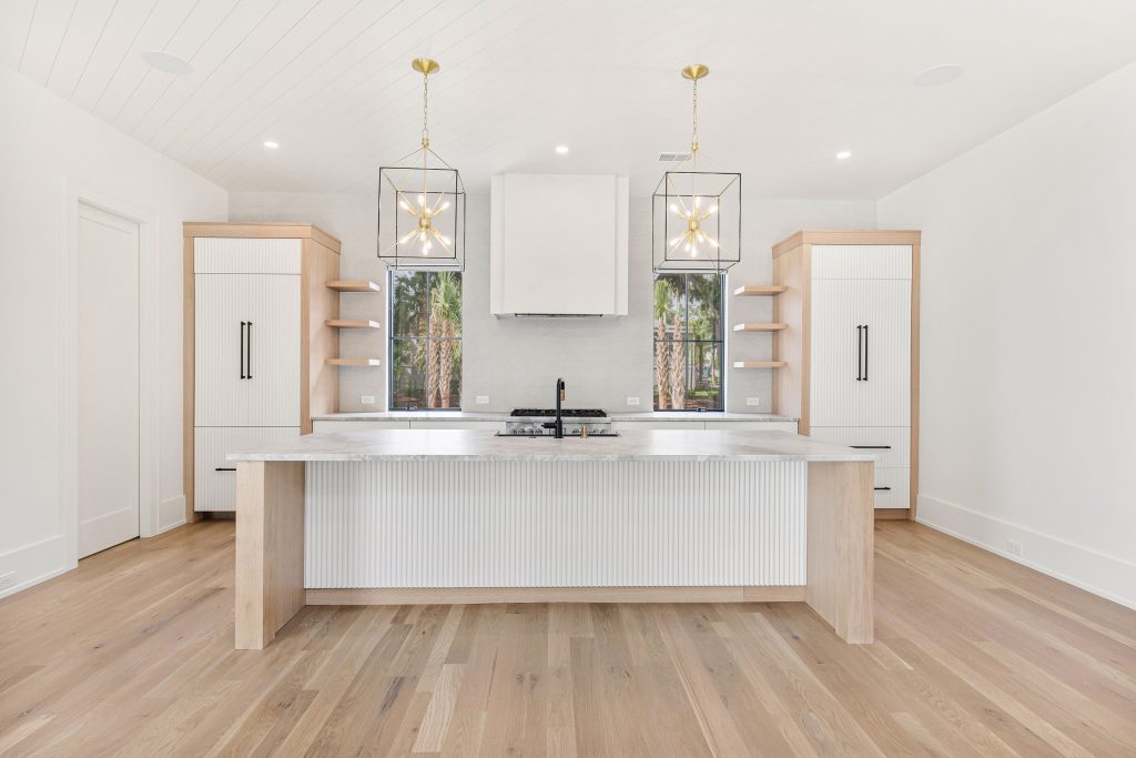 A white palette doesn’t have to be boring. Upgrade white kitchens with modern finishes and unique features such as the wood panels surrounding the cabinetry and the texture on the island.