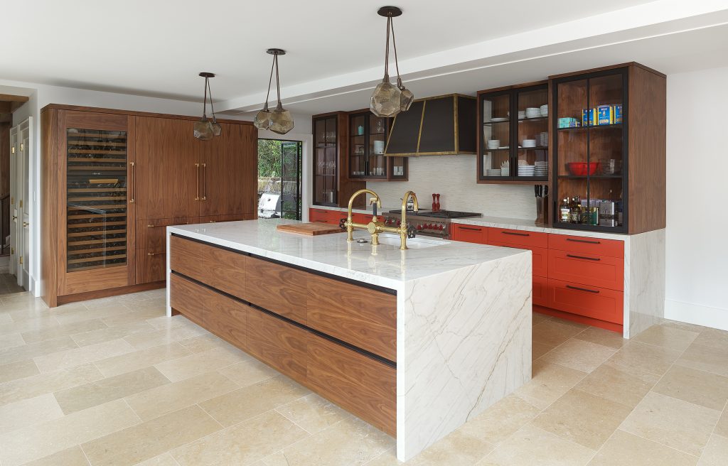 Clearly, we love a good pop of color in kitchens. Natural hues in this modern space were accented with bright red slab cabinetry.