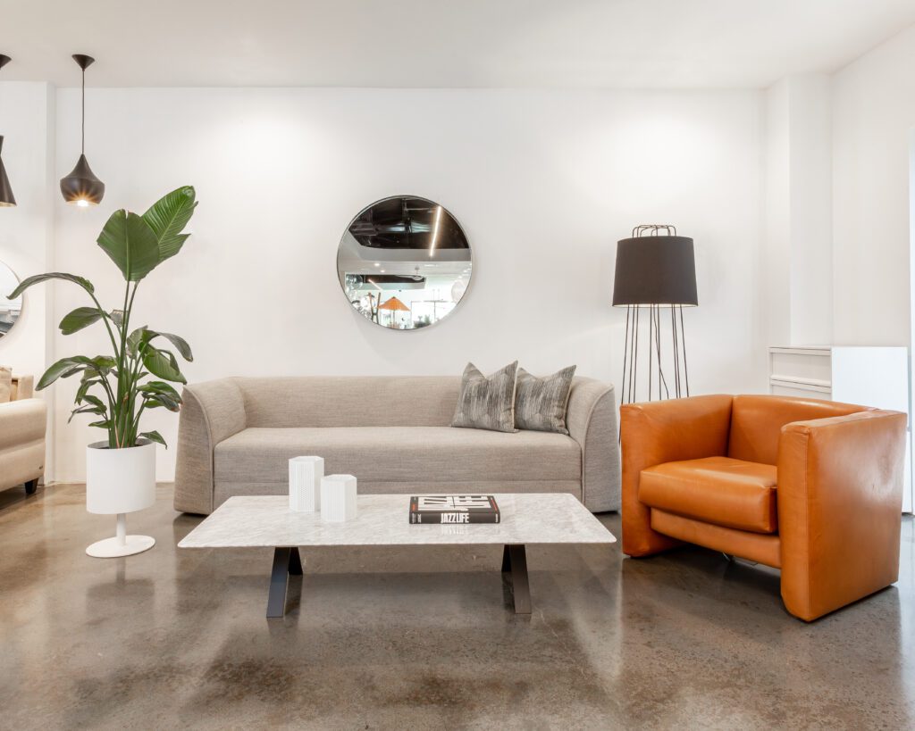 (Featured Products: Thataway 88” Sleeper Sofa in Tait Charcoal, Double Down Lounge Chair in Toffee Leather, Super Swoval Coffee Table in Marble/ Black, Perimeter Floor Lamp in Black, Hoopla Large Mirror in Oblivion, Plot Large Planter in White)