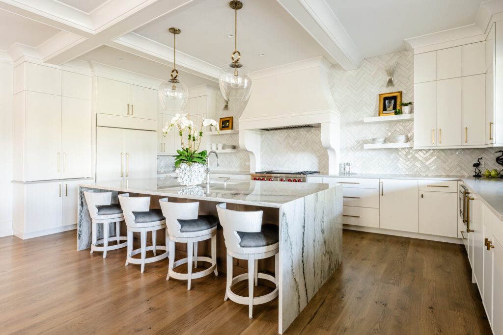 An oversized hood makes an eye-catching focal point on the range wall featuring appliances by SubZero, Wolf, and Cove.