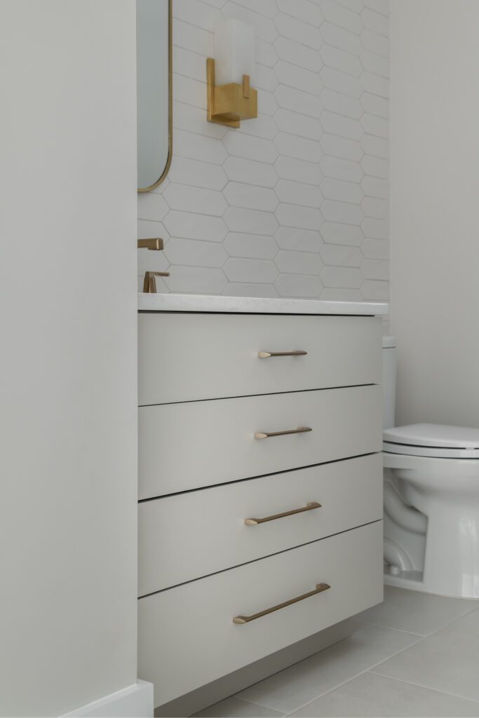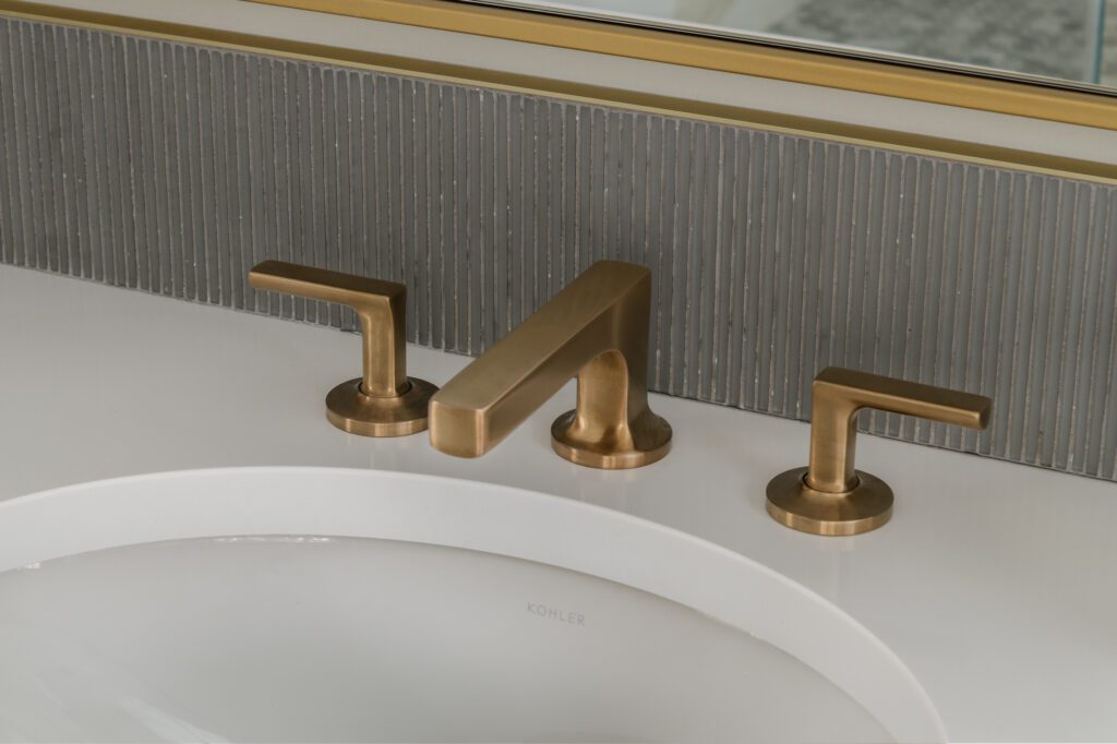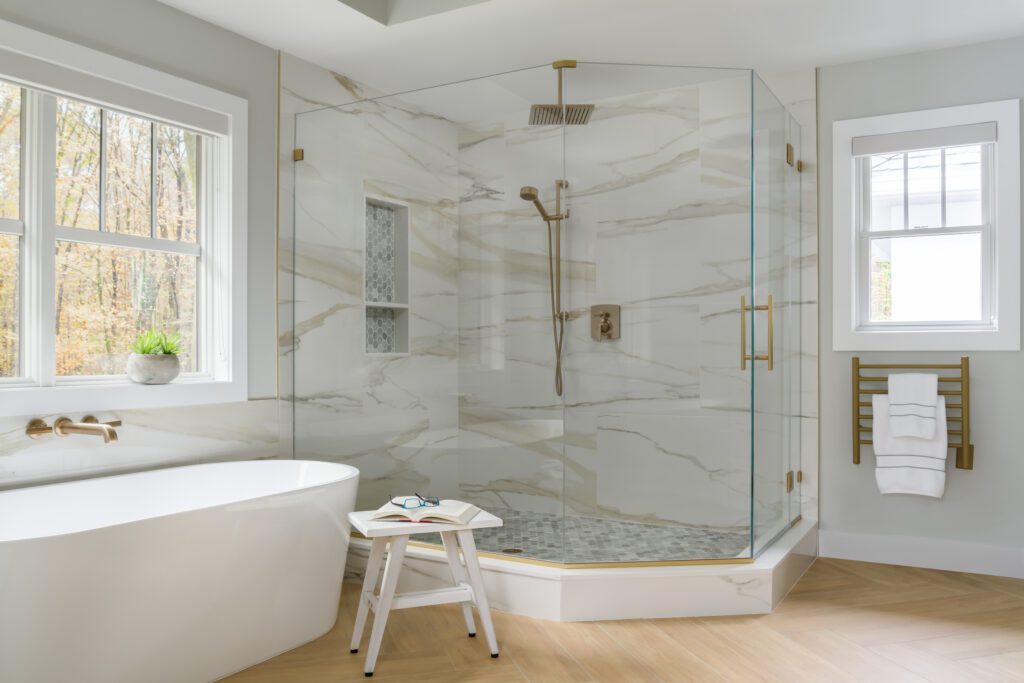 CK Design Group maximized space in this primary bathroom with clever spatial solutions like this corner shower that feels like a mini-wet room.