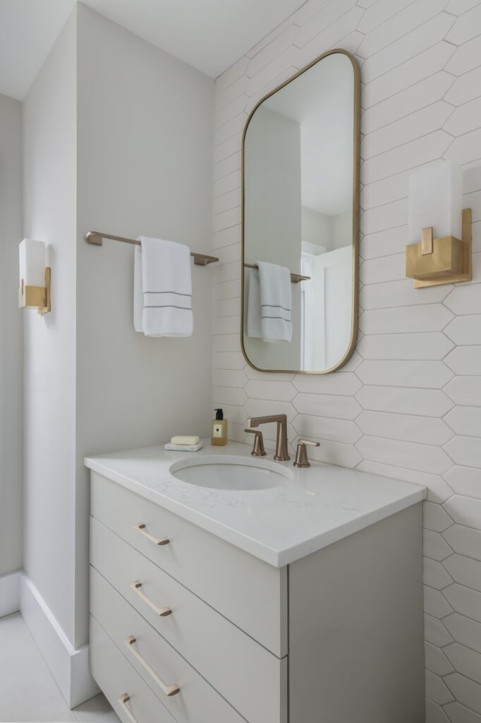 White oak hardwood in a herringbone pattern grounds the space with contemporary warmth.