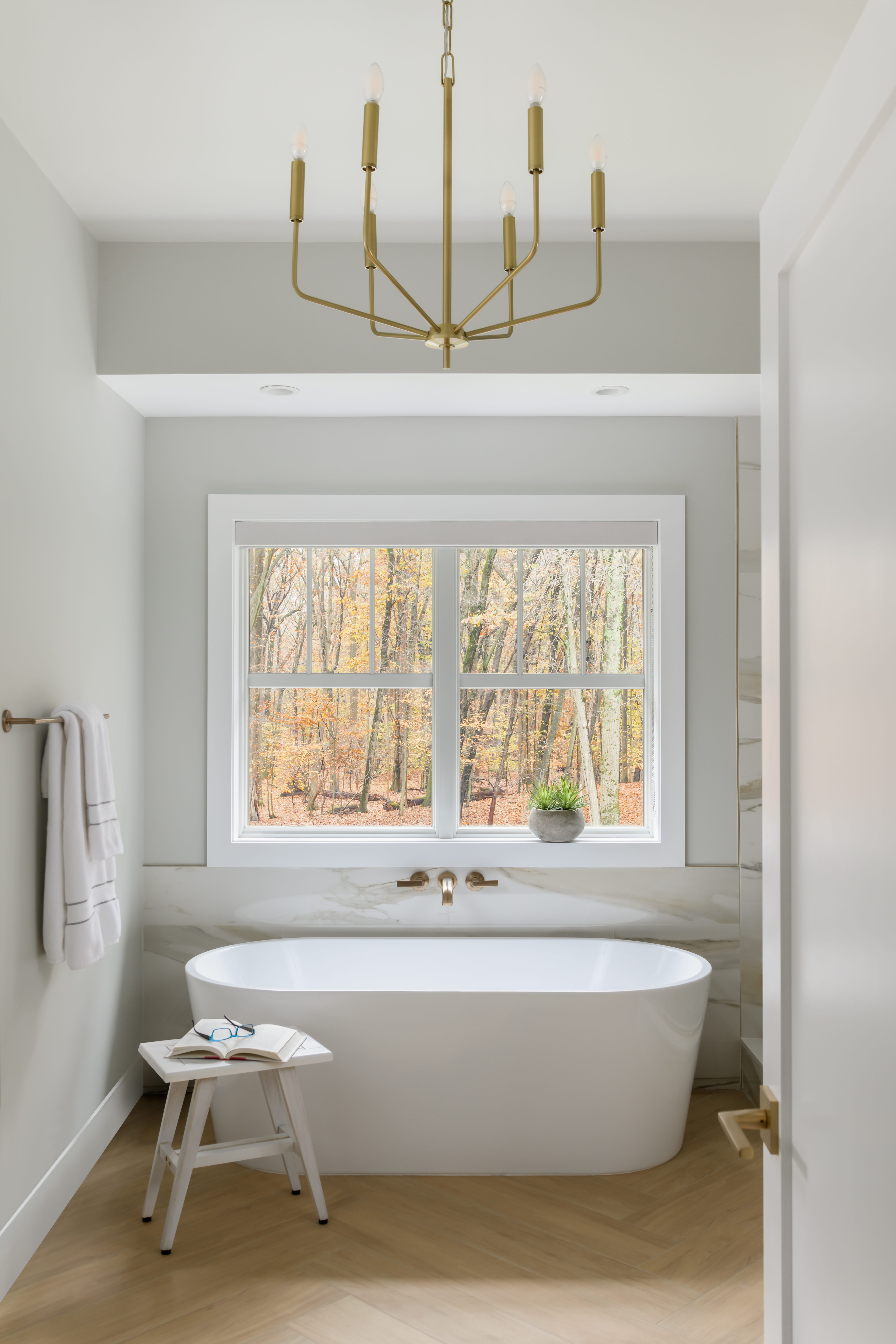 The chandelier and soaking tub make a luxurious statement with a wall-mounted faucet and porcelain backsplash.