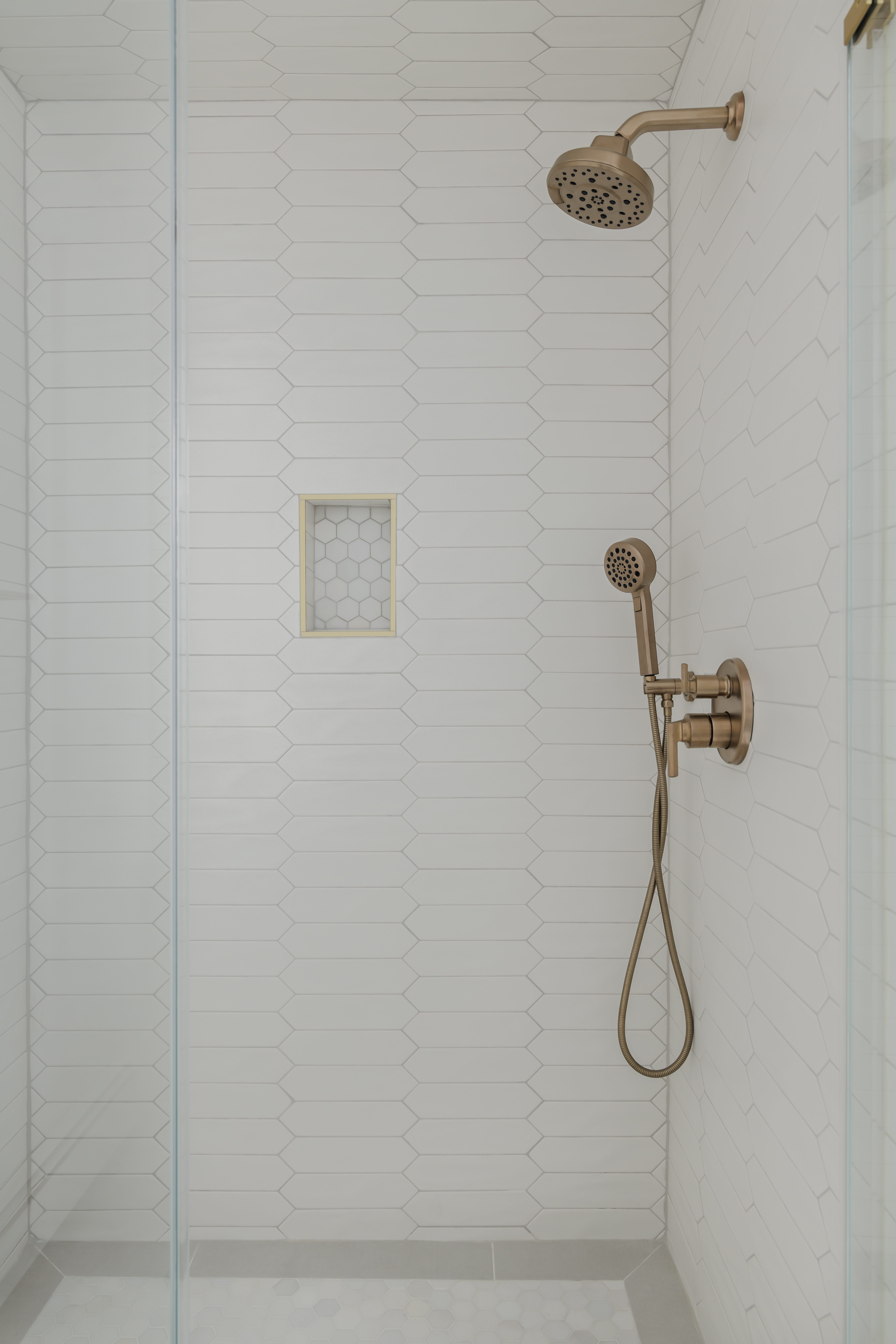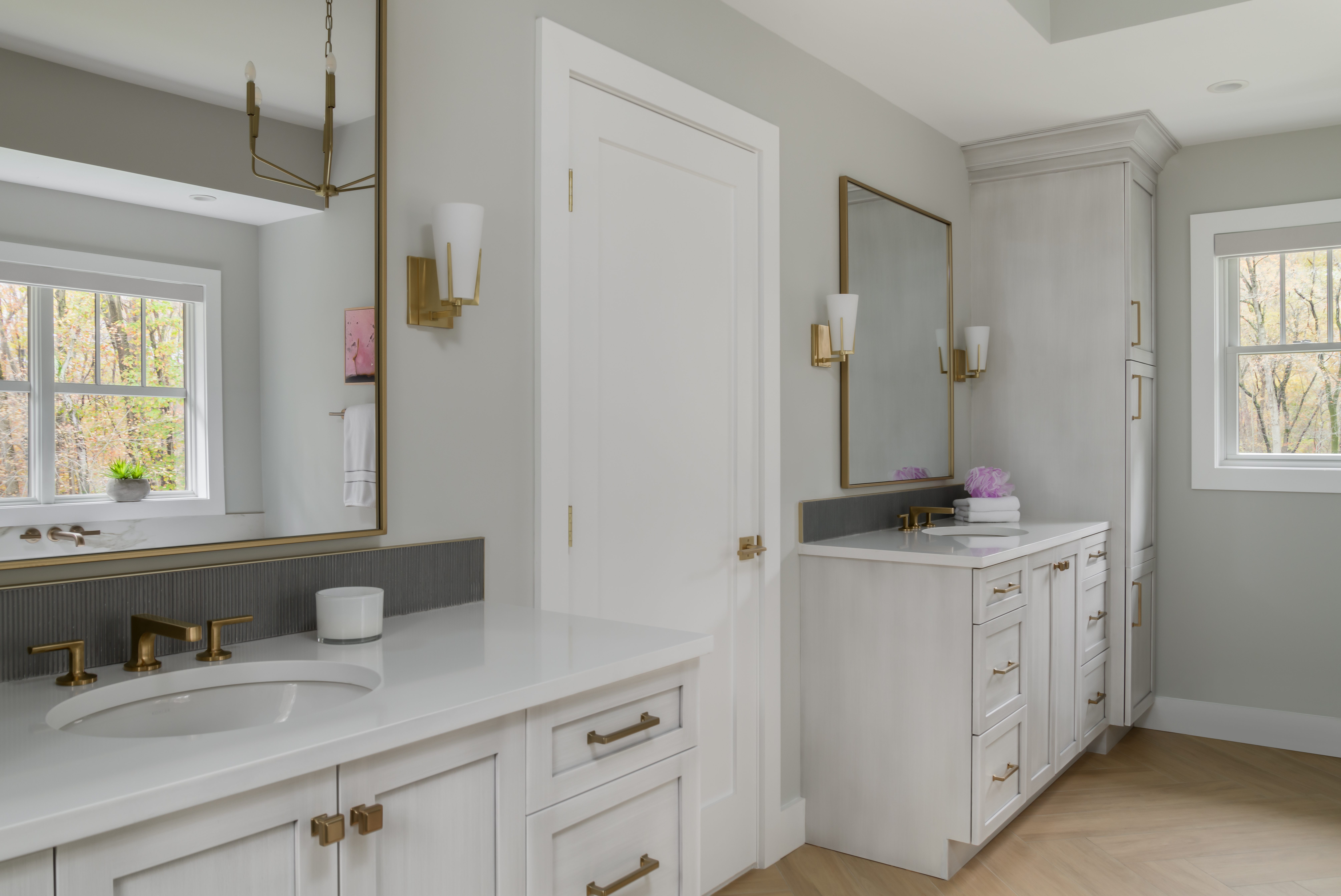 CK Design Group maximized space in this primary bathroom with clever spatial solutions like this corner shower that feels like a mini-wet room.