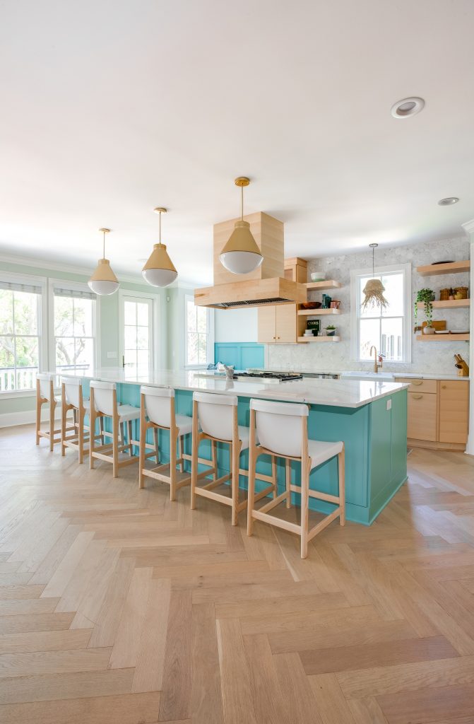 Pops of color. Light blue pantry door and teal base cabinetry under the island.