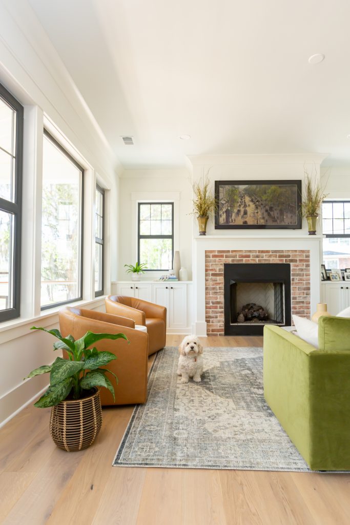 The brick from the fireplace matches the range wall in the kitchen for a cohesive look to this open floor plan.
