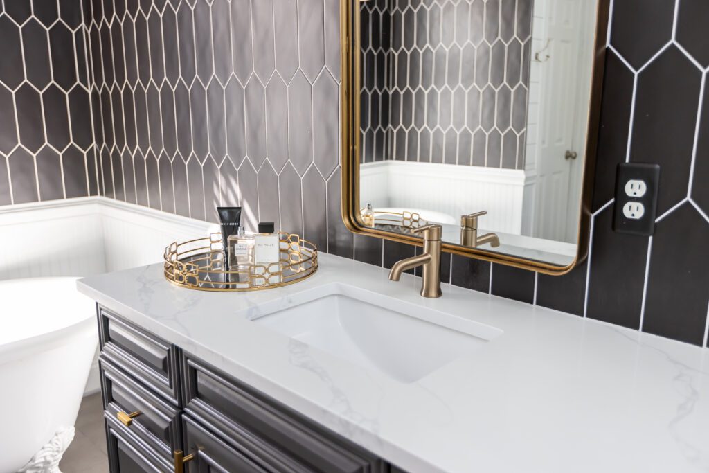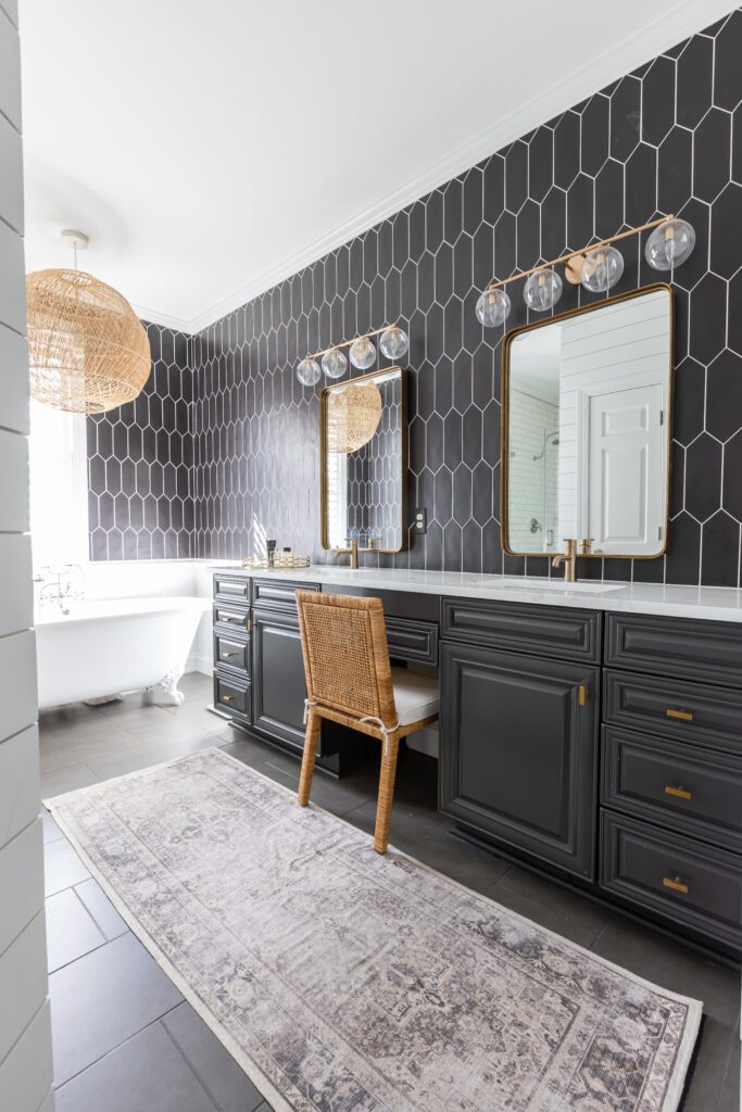 Existing bathroom features like the 12×24 matte black porcelain tiles and the stand-alone cast iron tub informed Amber’s redesign for these homeowners seeking an edgy yet classic look.
