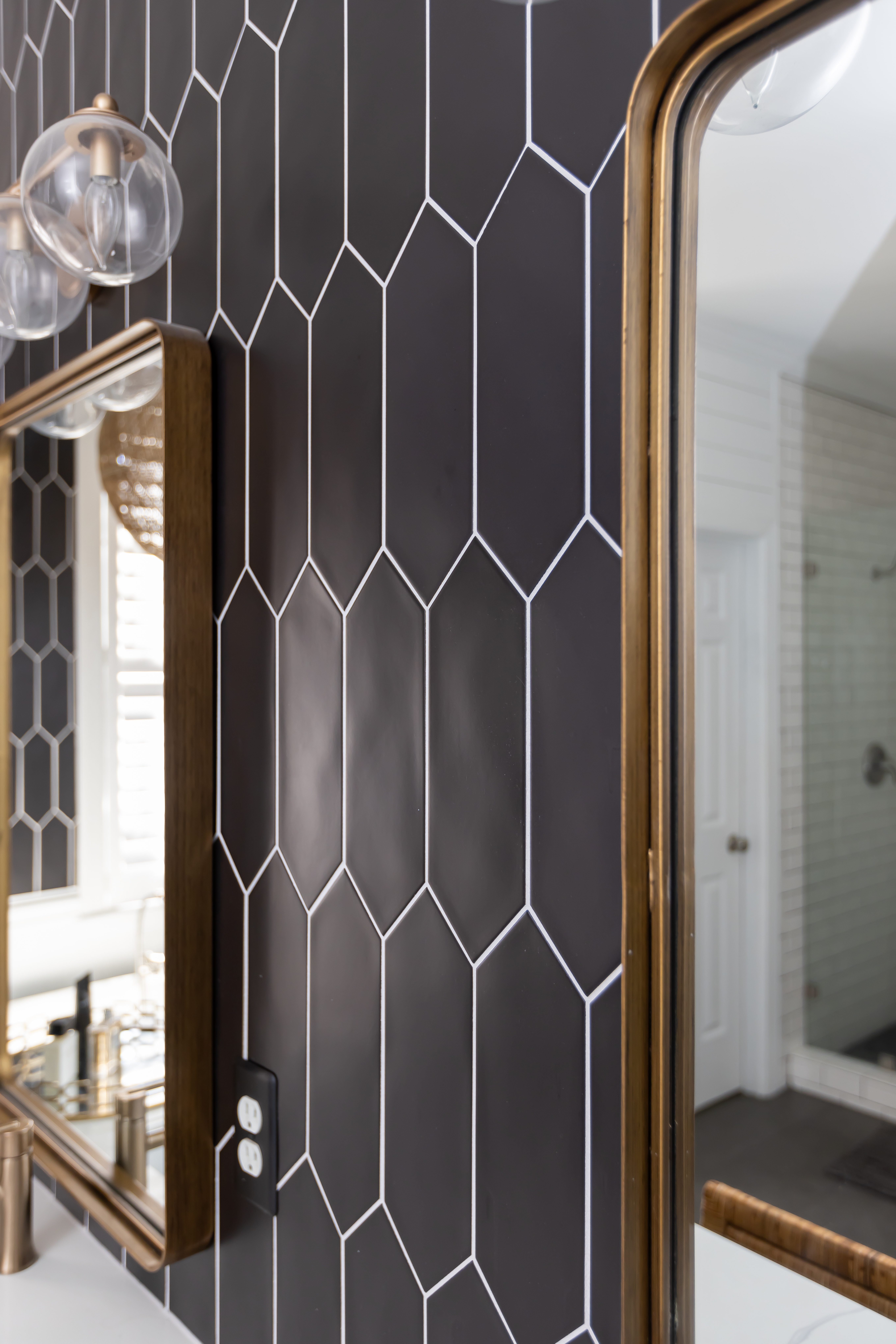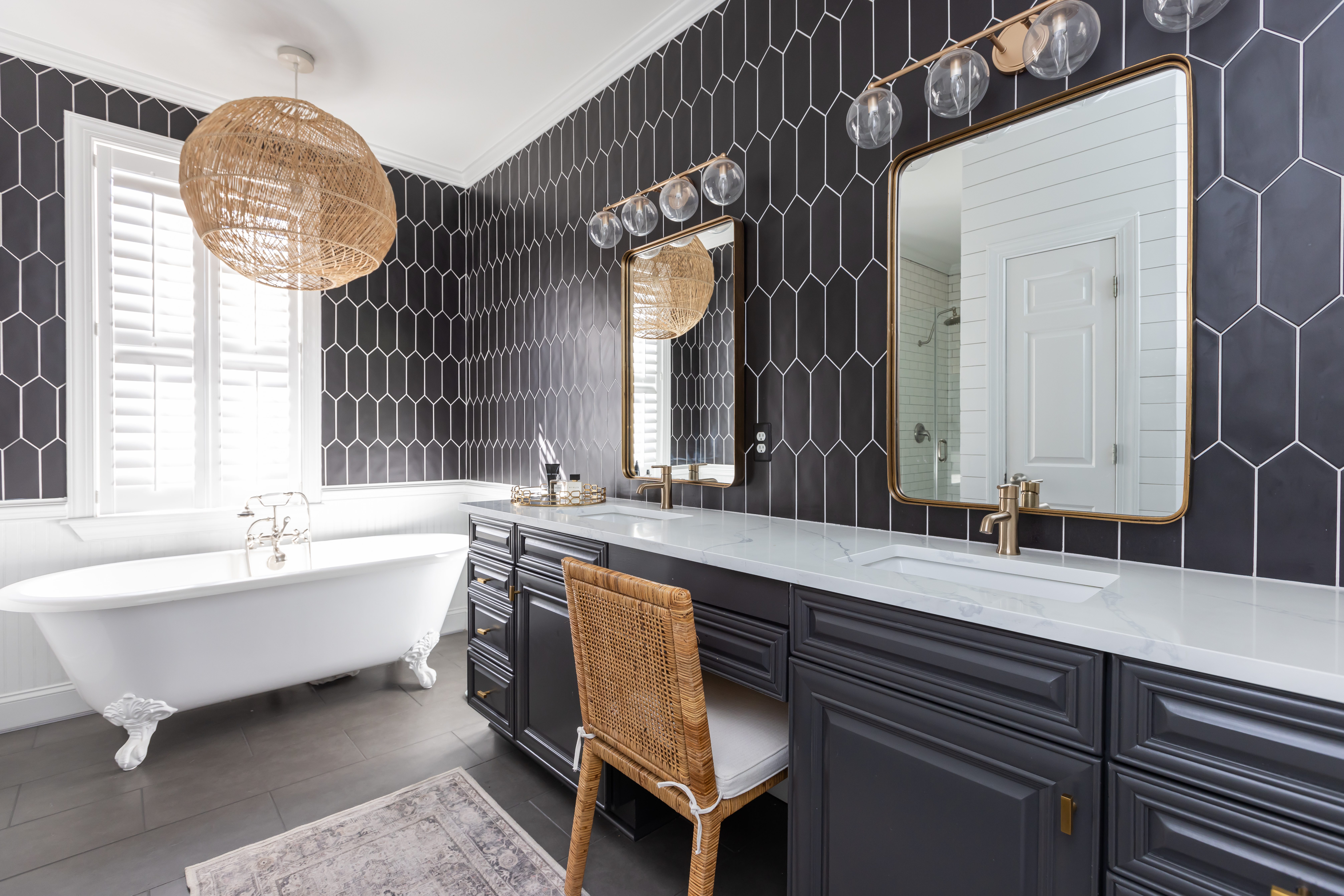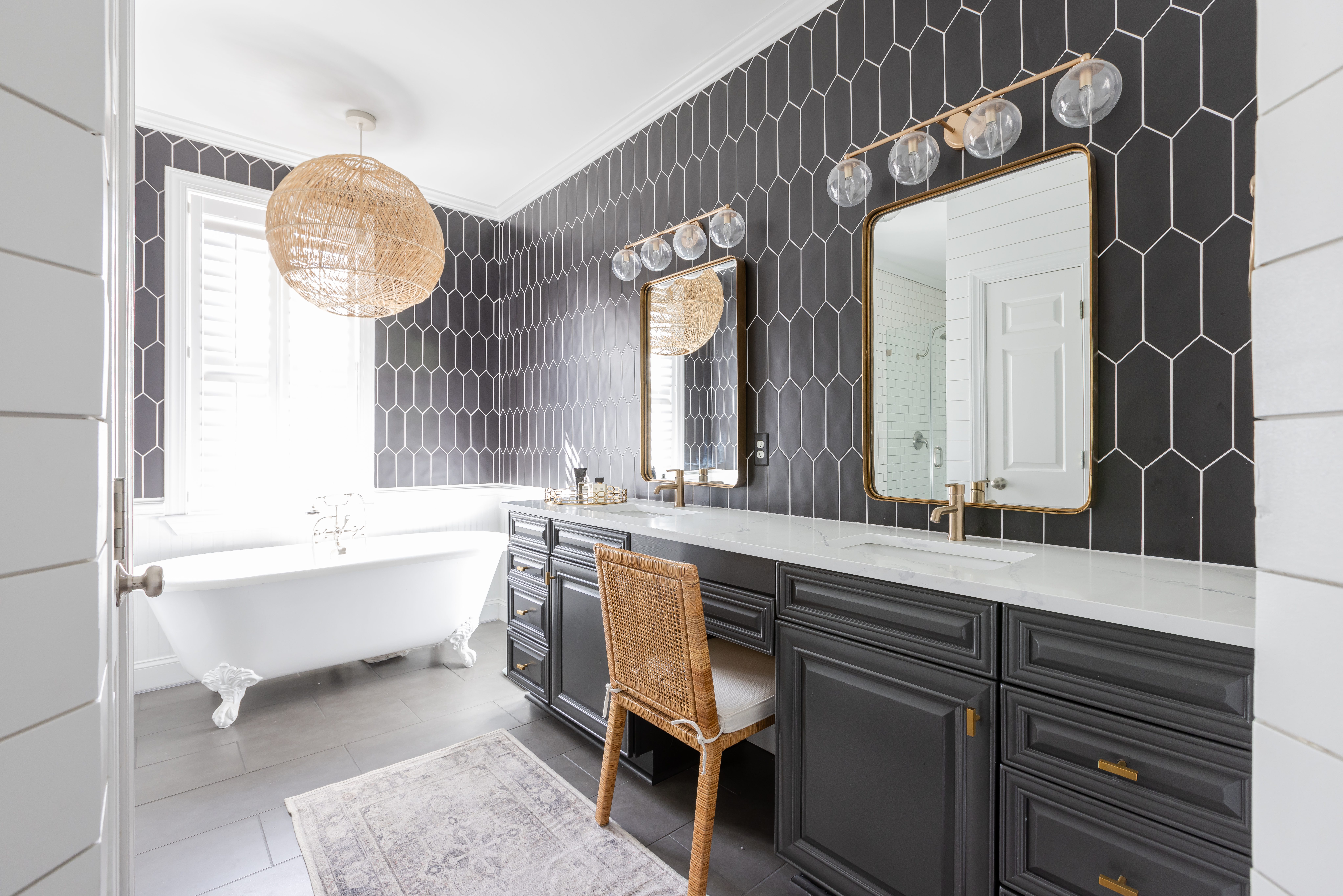 Existing bathroom features like the 12×24 matte black porcelain tiles and the stand-alone cast iron tub informed Amber’s redesign for these homeowners seeking an edgy yet classic look.