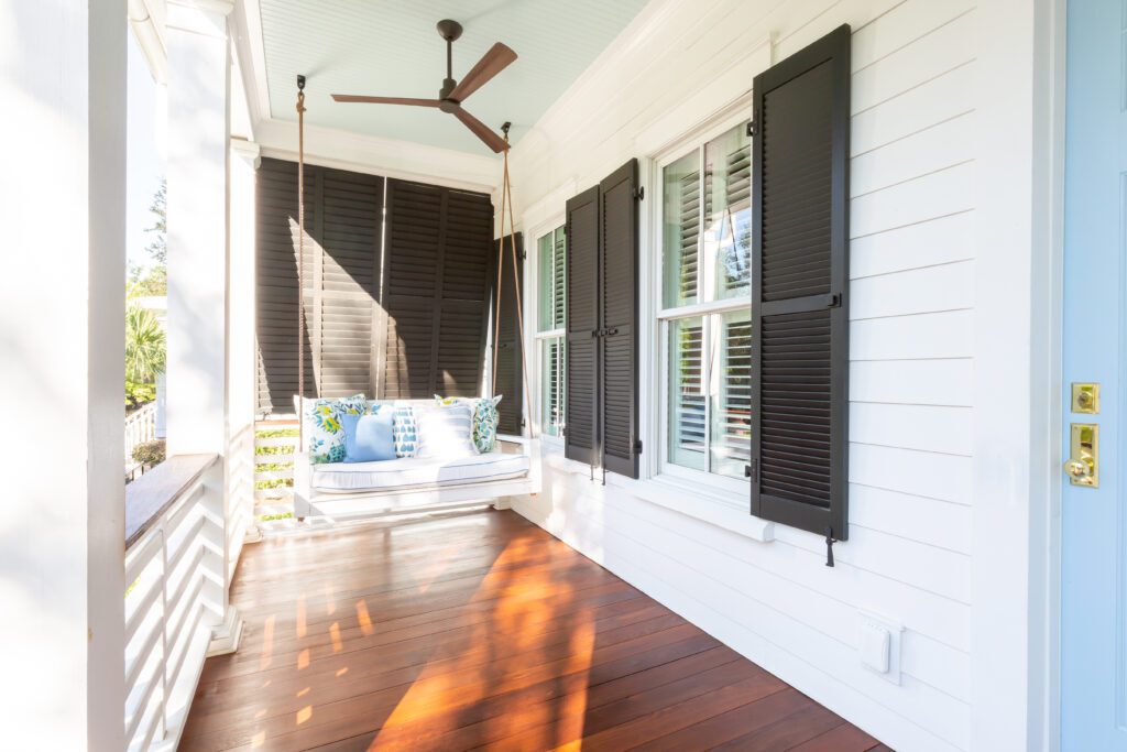 An enclosed breezeway was custom-built with pecky cypress and Ipe deck wood for a durable outdoor living space and a private guest suite entrance. The space is shaded with copper screening and oversized Bermuda shutters for controlled sun exposure and provides a place to indulge in the benefits of indoor/outdoor living.