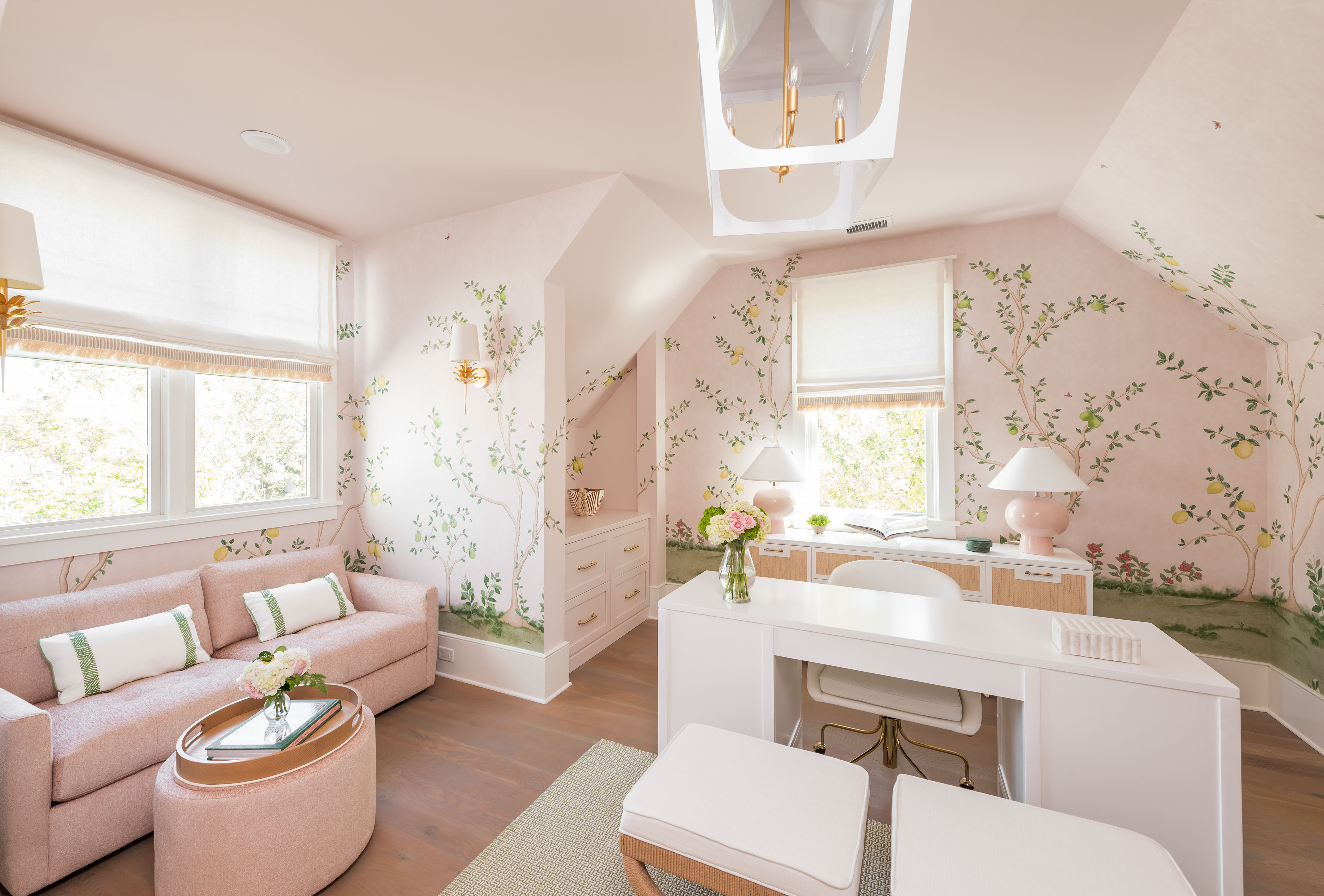 What was once a room where the eye got lost in sharp angles and visual disconnection is now a calm, luxurious, and cohesive haven. Perfect for this remote-work homeowner, Andrea Dussault of Striped Lemon Design curated a personality-filled home office. Custom-built storage cabinets and new tailored furnishings add purpose and elegance, making use of previously wasted space. Thoughtfully layered lighting, custom window treatments and pillows, and a stunning wallpaper mural reimagined this space into a cheerful, feminine home office.