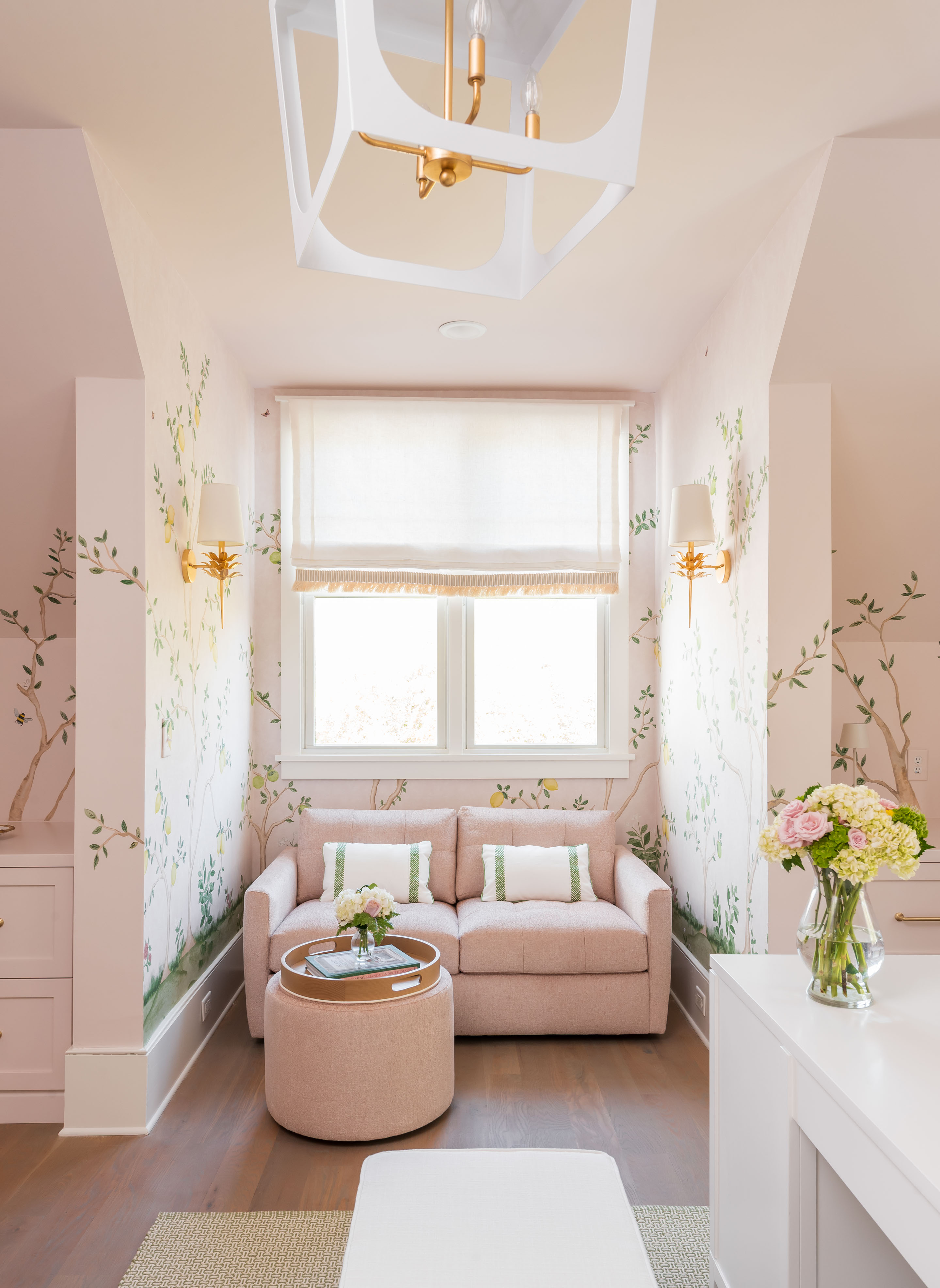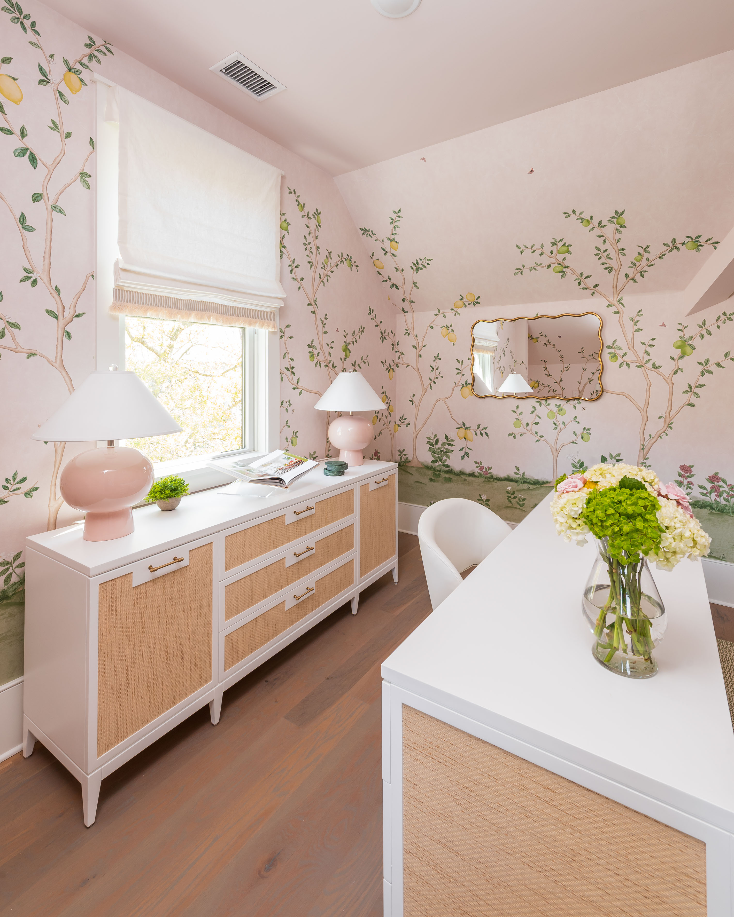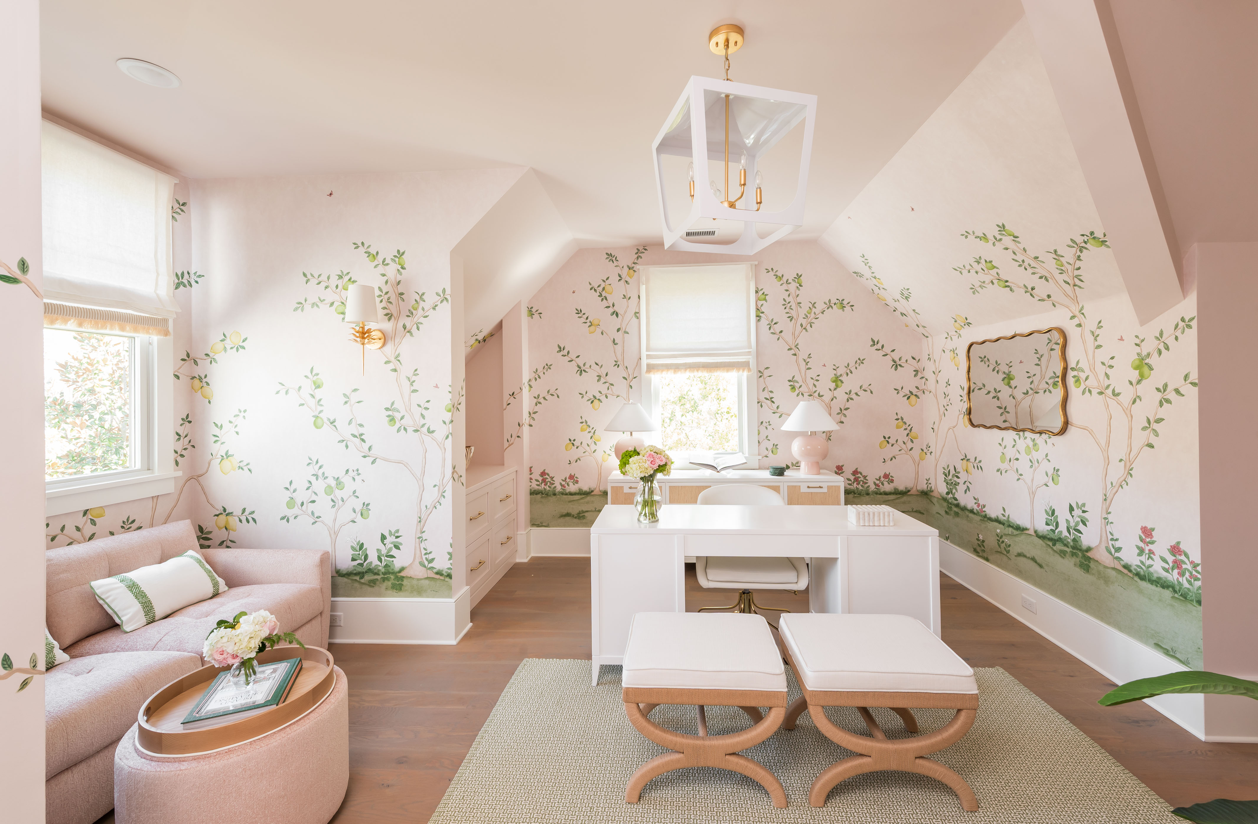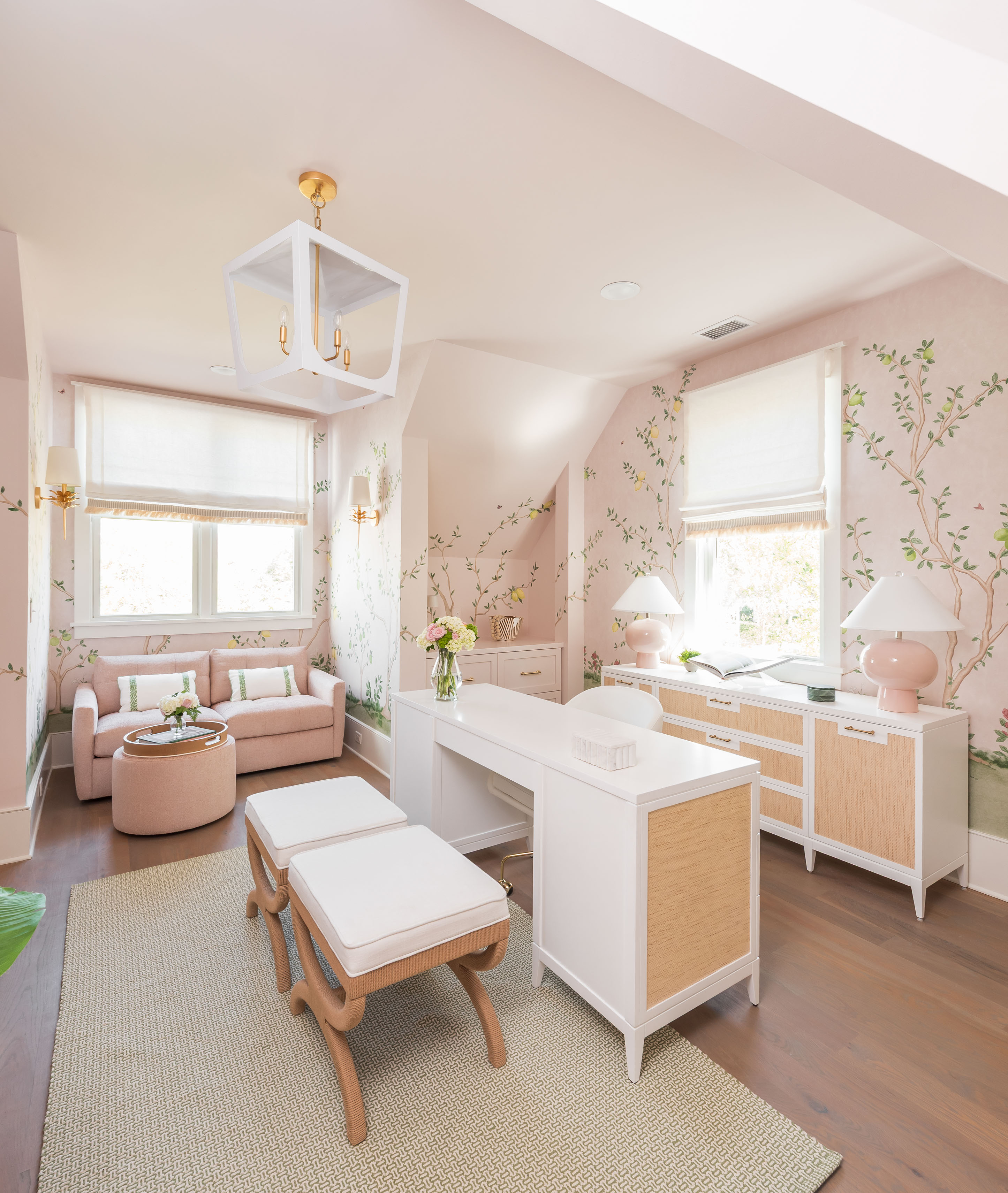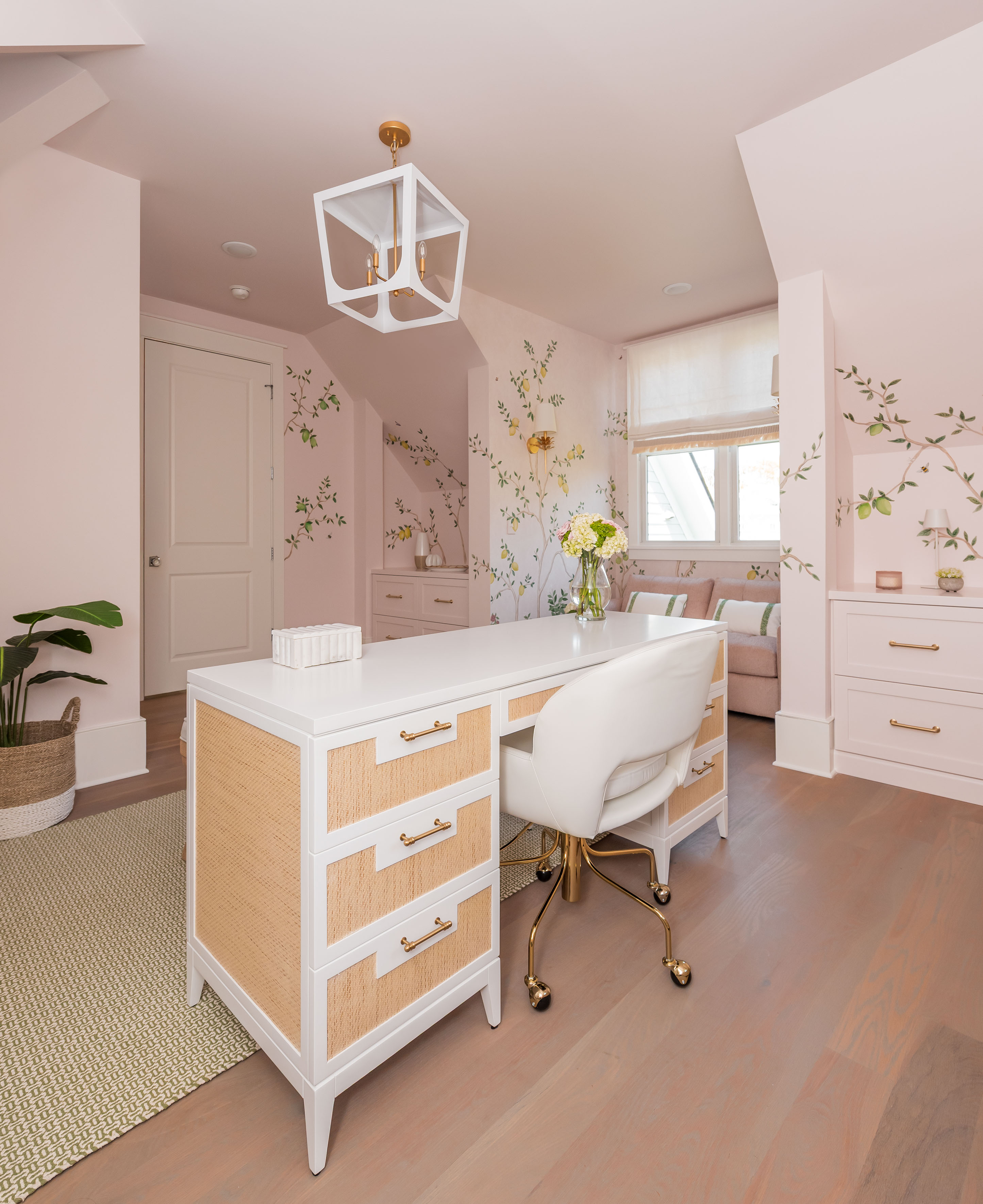 What was once a room where the eye got lost in sharp angles and visual disconnection is now a calm, luxurious, and cohesive haven. Perfect for this remote-work homeowner, Andrea Dussault of Striped Lemon Design curated a personality-filled home office. Custom-built storage cabinets and new tailored furnishings add purpose and elegance, making use of previously wasted space. Thoughtfully layered lighting, custom window treatments and pillows, and a stunning wallpaper mural reimagined this space into a cheerful, feminine home office.