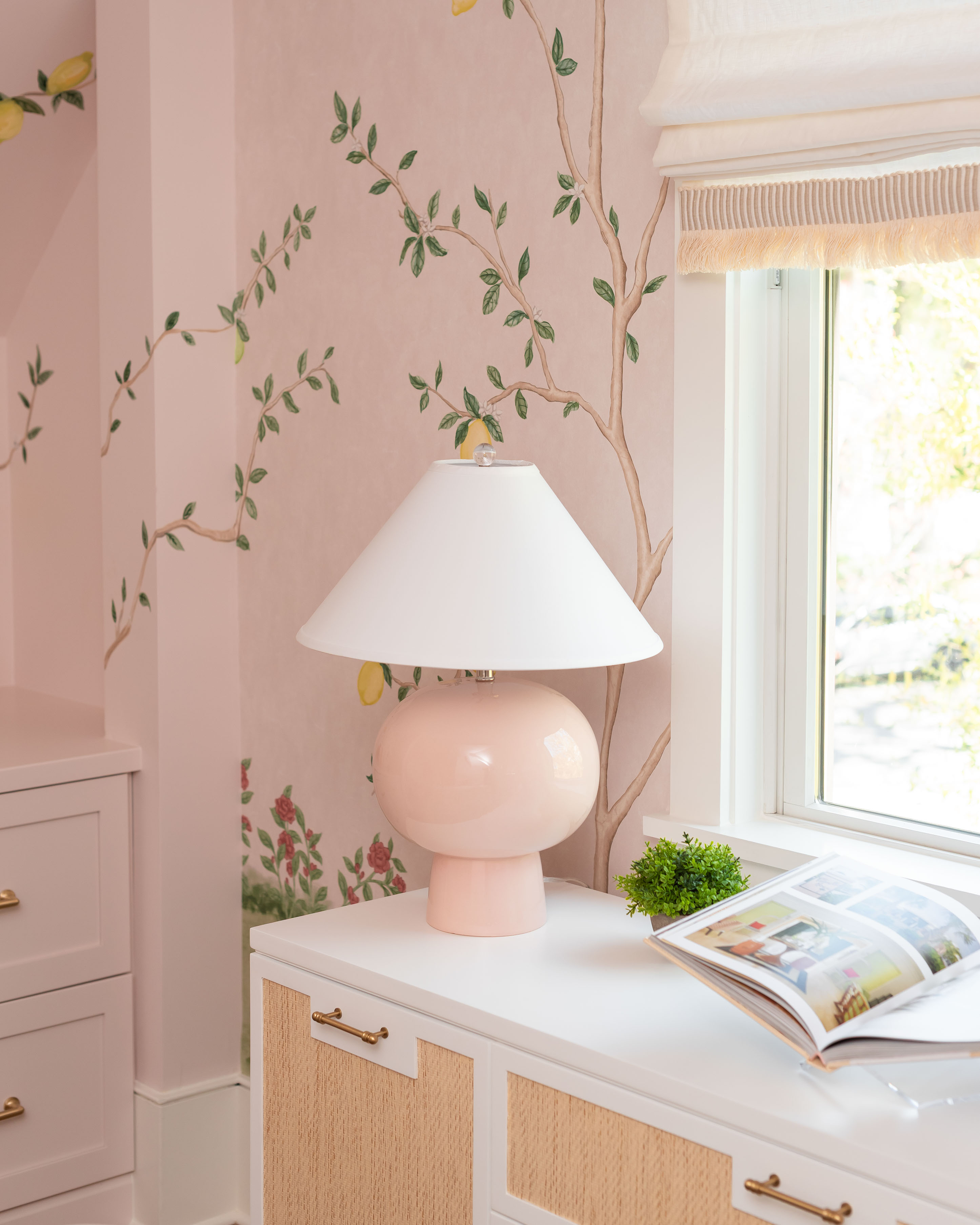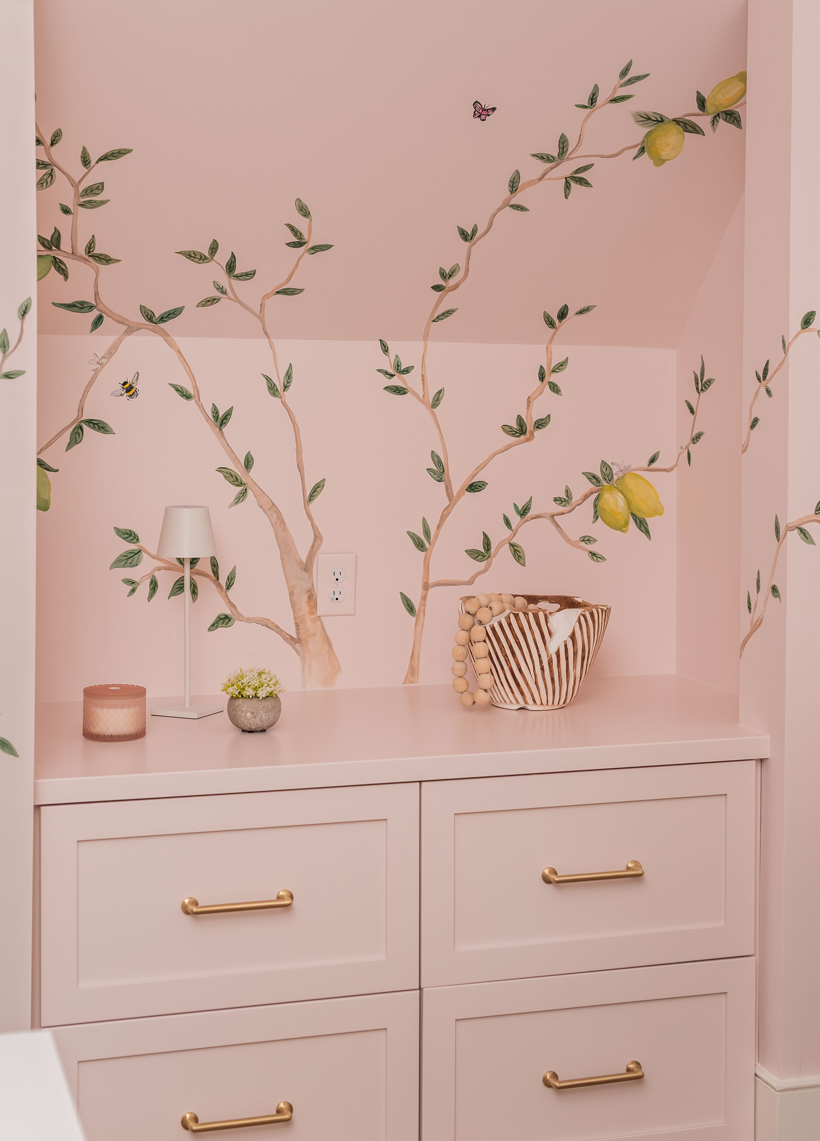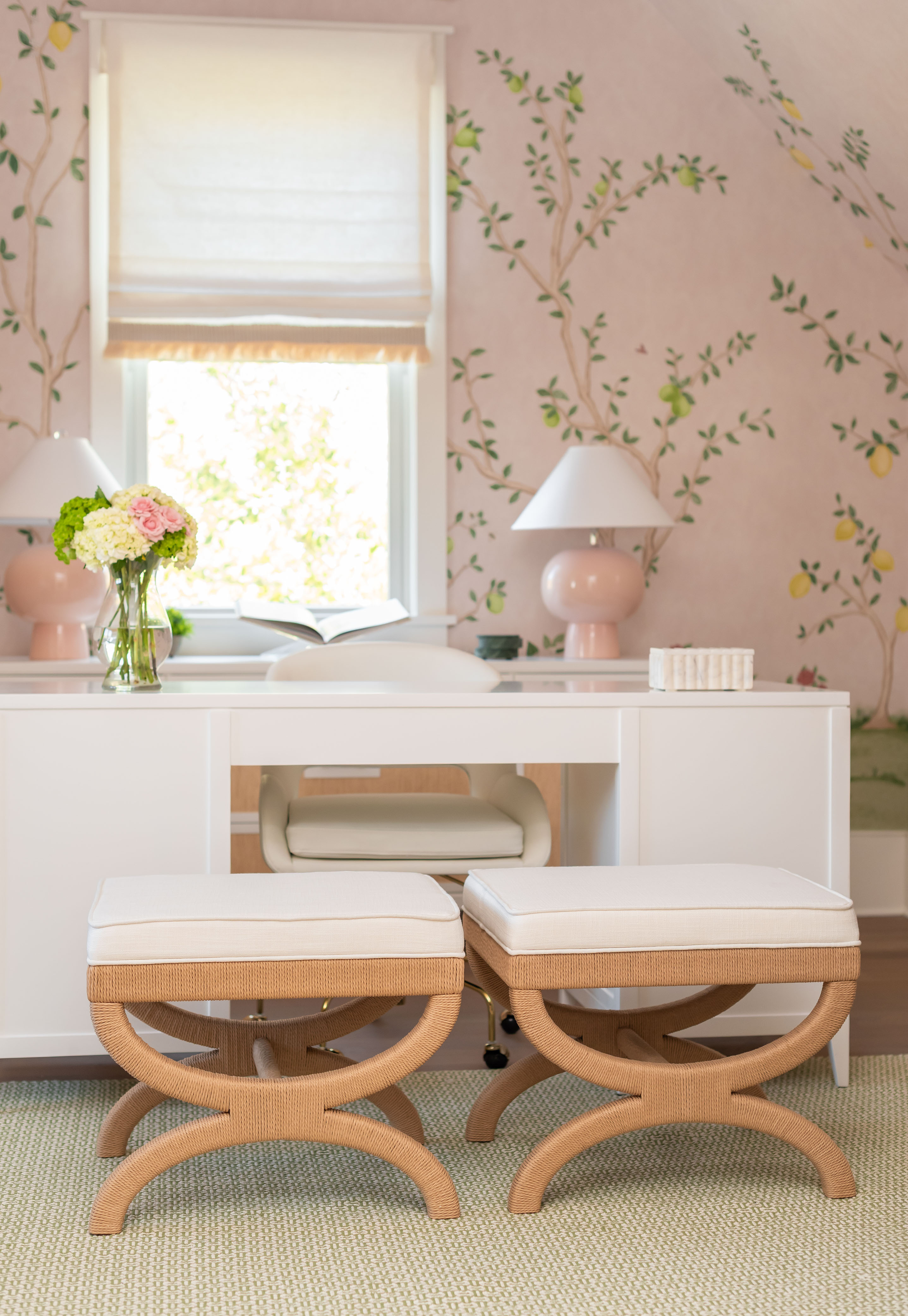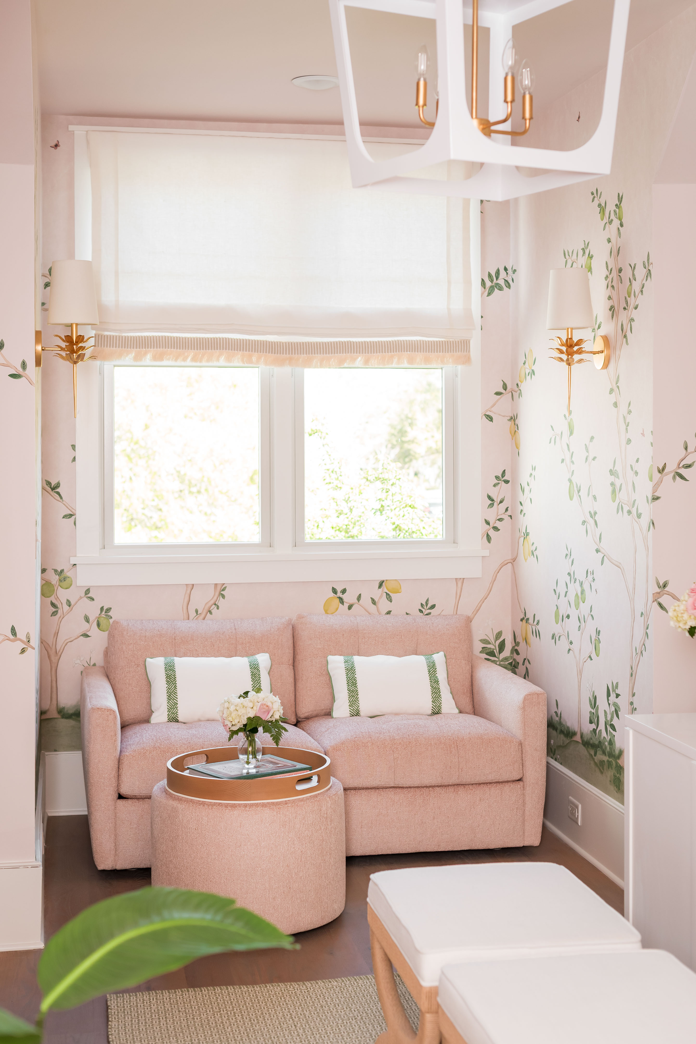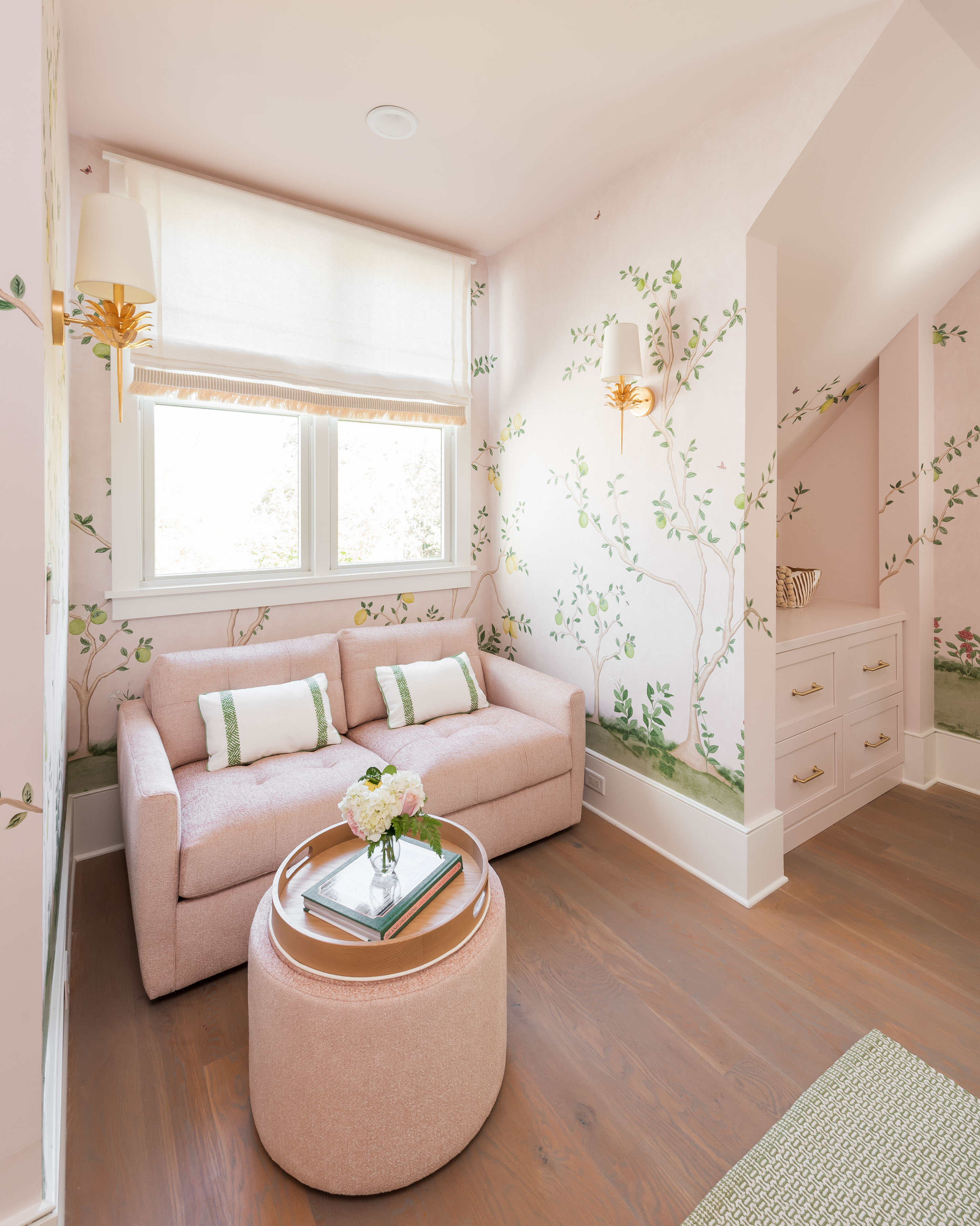 What was once a room where the eye got lost in sharp angles and visual disconnection is now a calm, luxurious, and cohesive haven. Perfect for this remote-work homeowner, Andrea Dussault of Striped Lemon Design curated a personality-filled home office. Custom-built storage cabinets and new tailored furnishings add purpose and elegance, making use of previously wasted space. Thoughtfully layered lighting, custom window treatments and pillows, and a stunning wallpaper mural reimagined this space into a cheerful, feminine home office.