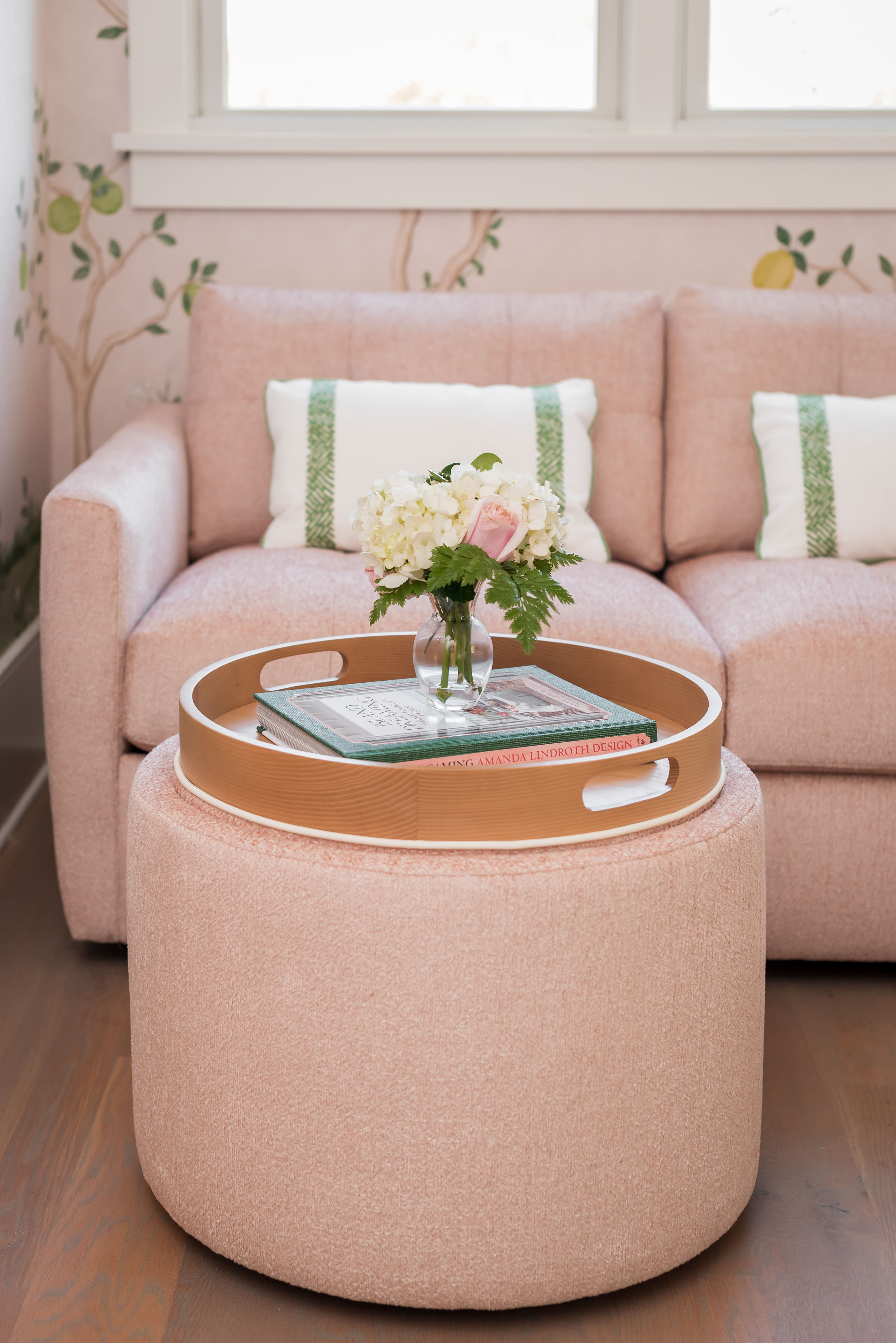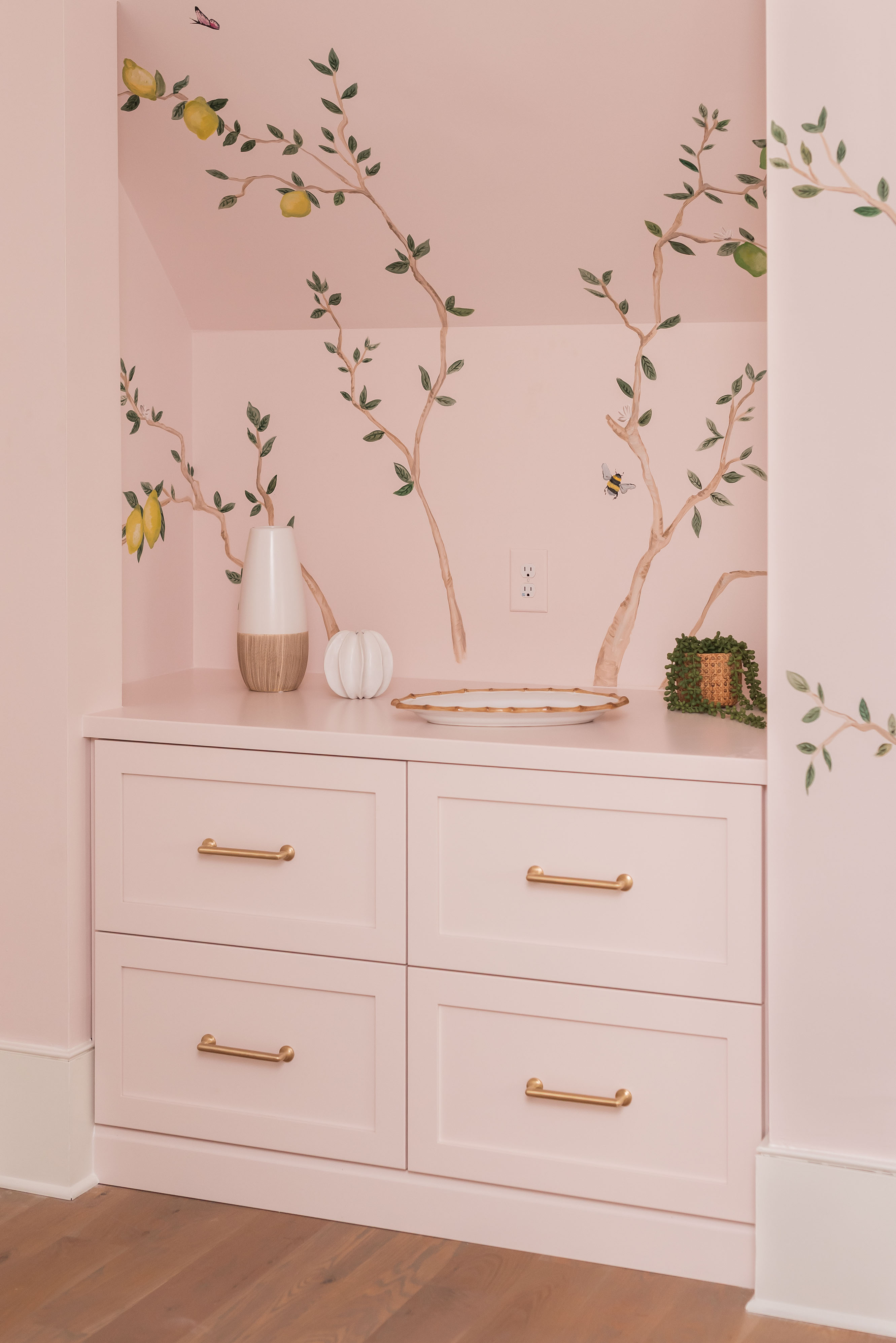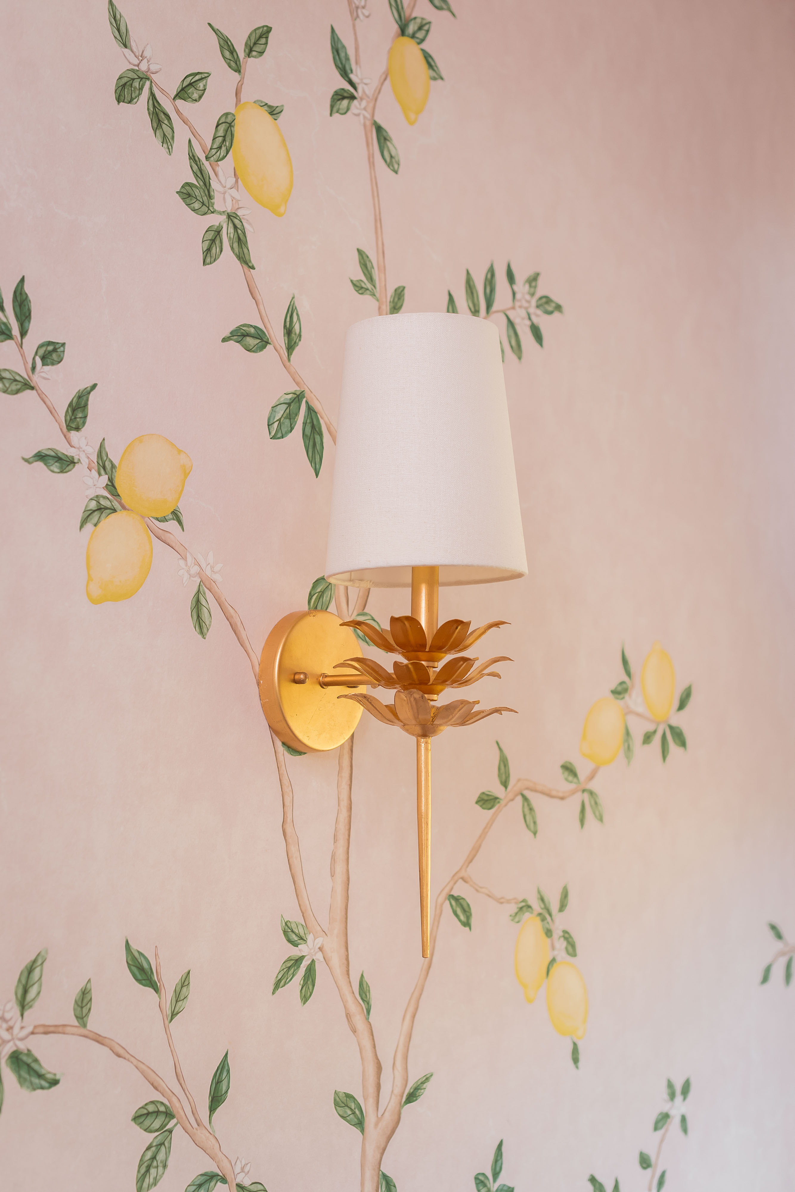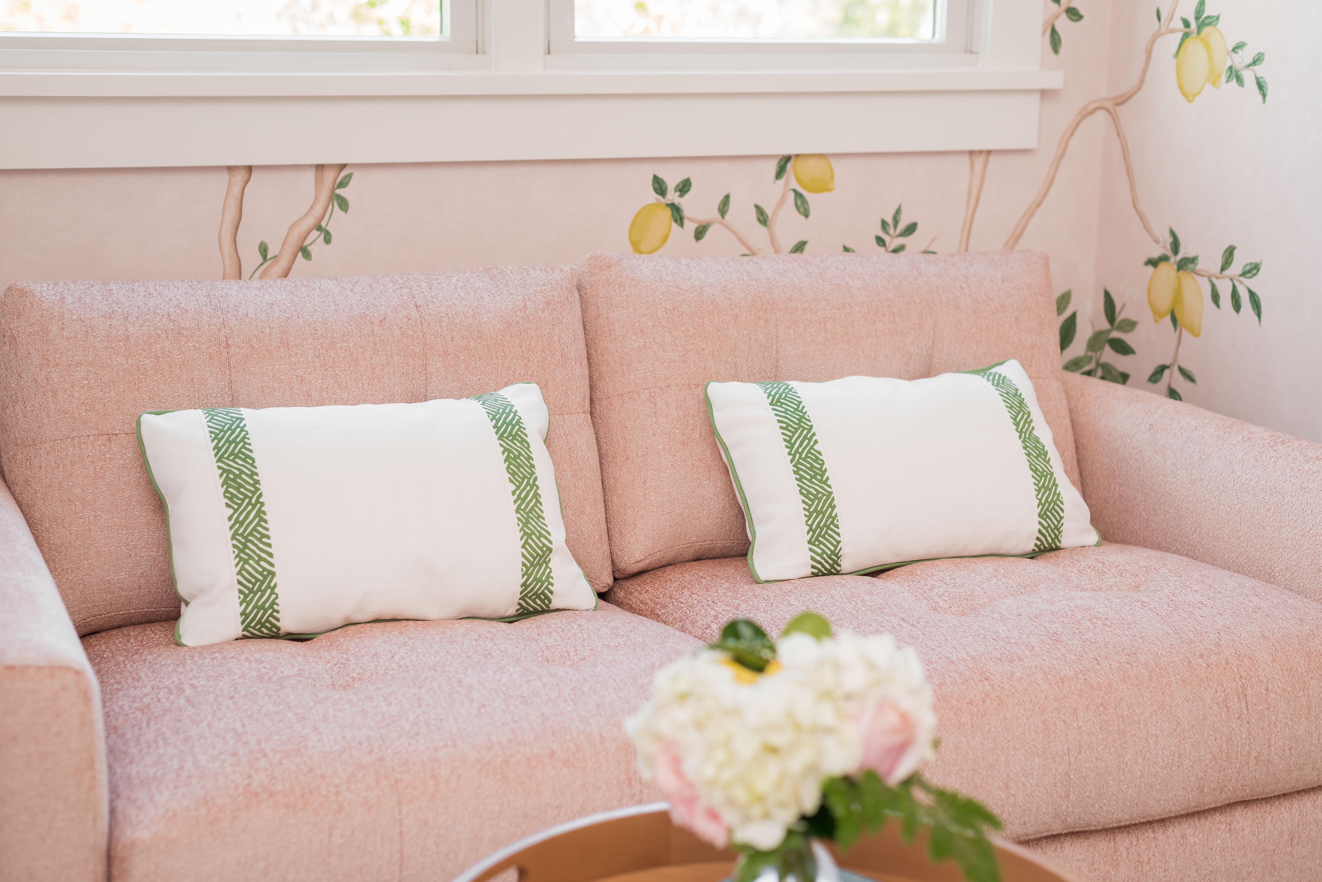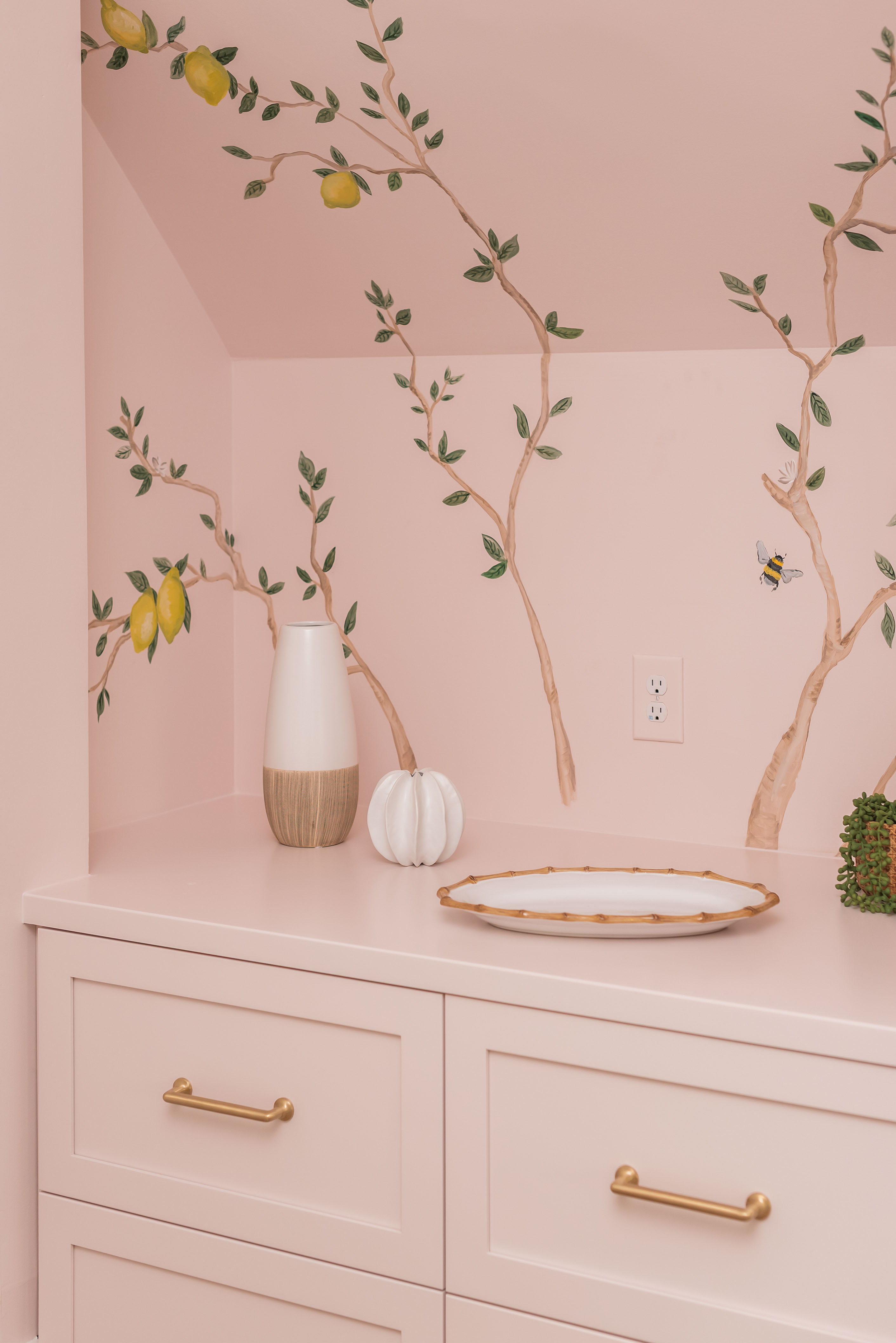 What was once a room where the eye got lost in sharp angles and visual disconnection is now a calm, luxurious, and cohesive haven. Perfect for this remote-work homeowner, Andrea Dussault of Striped Lemon Design curated a personality-filled home office. Custom-built storage cabinets and new tailored furnishings add purpose and elegance, making use of previously wasted space. Thoughtfully layered lighting, custom window treatments and pillows, and a stunning wallpaper mural reimagined this space into a cheerful, feminine home office.
