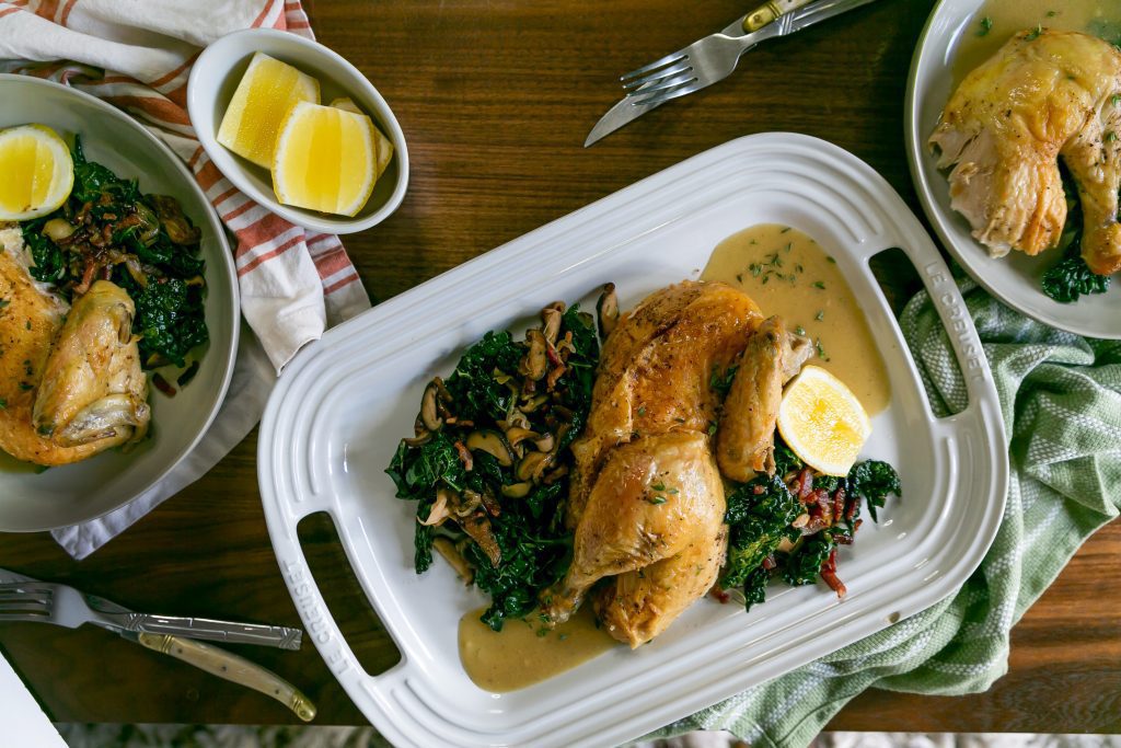 Ashley’s Roasted Chicken with Pan Gravy, Kale, & Mushrooms