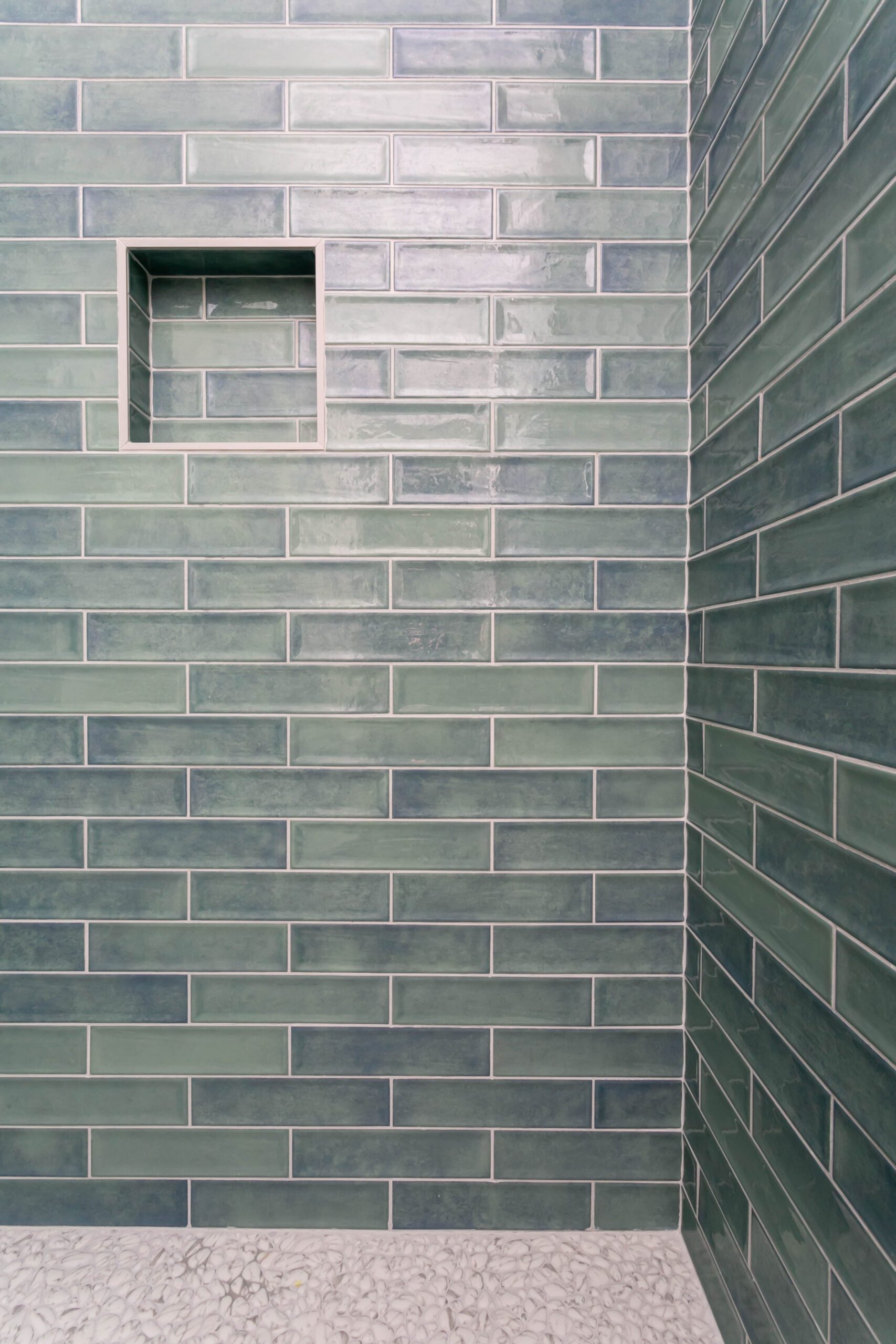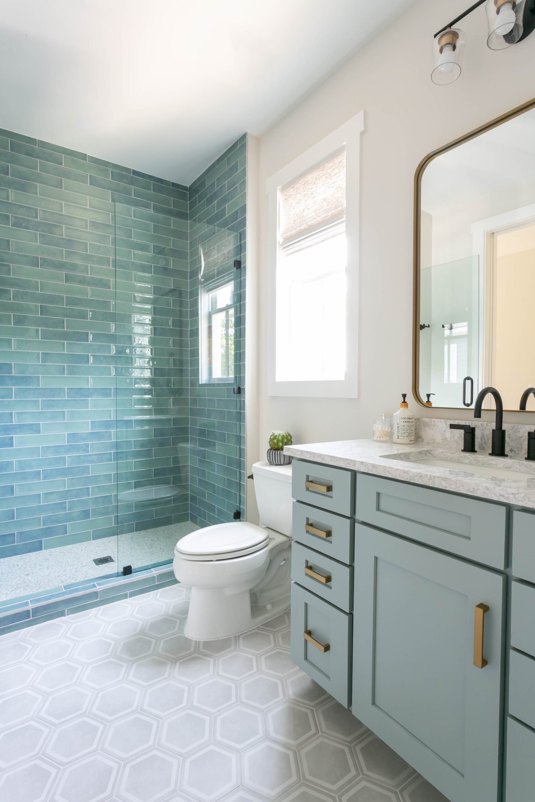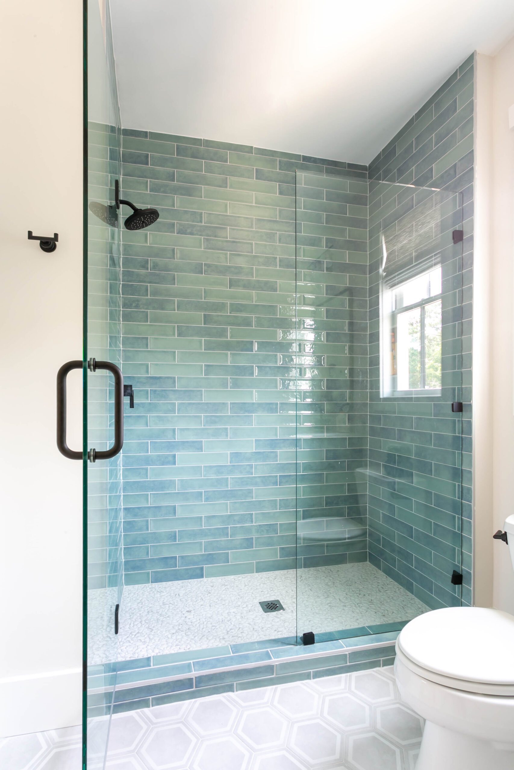 The walk-in glass frame shower echoes the blue tones of ocean water with reflective subway tiles to create an enchanting and blissful bathroom design.
