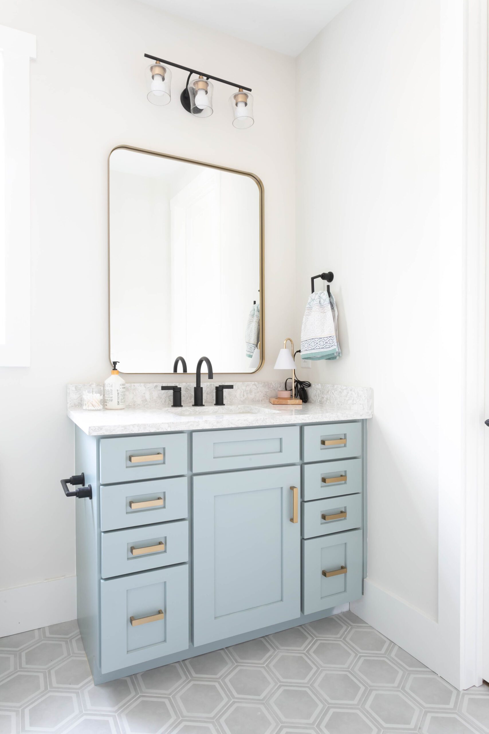 Remodel your bathroom with custom features by Mount Pleasant Kitchen and Bath. In this secondary bathroom, powder blue furniture-style vanities boast seriously clever storage options considering the size of the space.