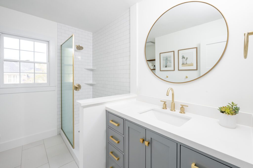 Moen Matte Brushed Gold fixtures in Brushed Gold detail the newly refinished space with a warm glow.