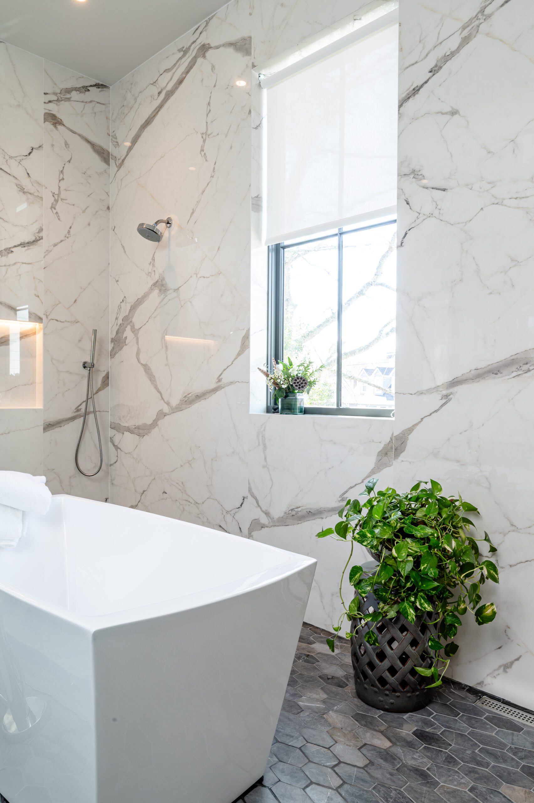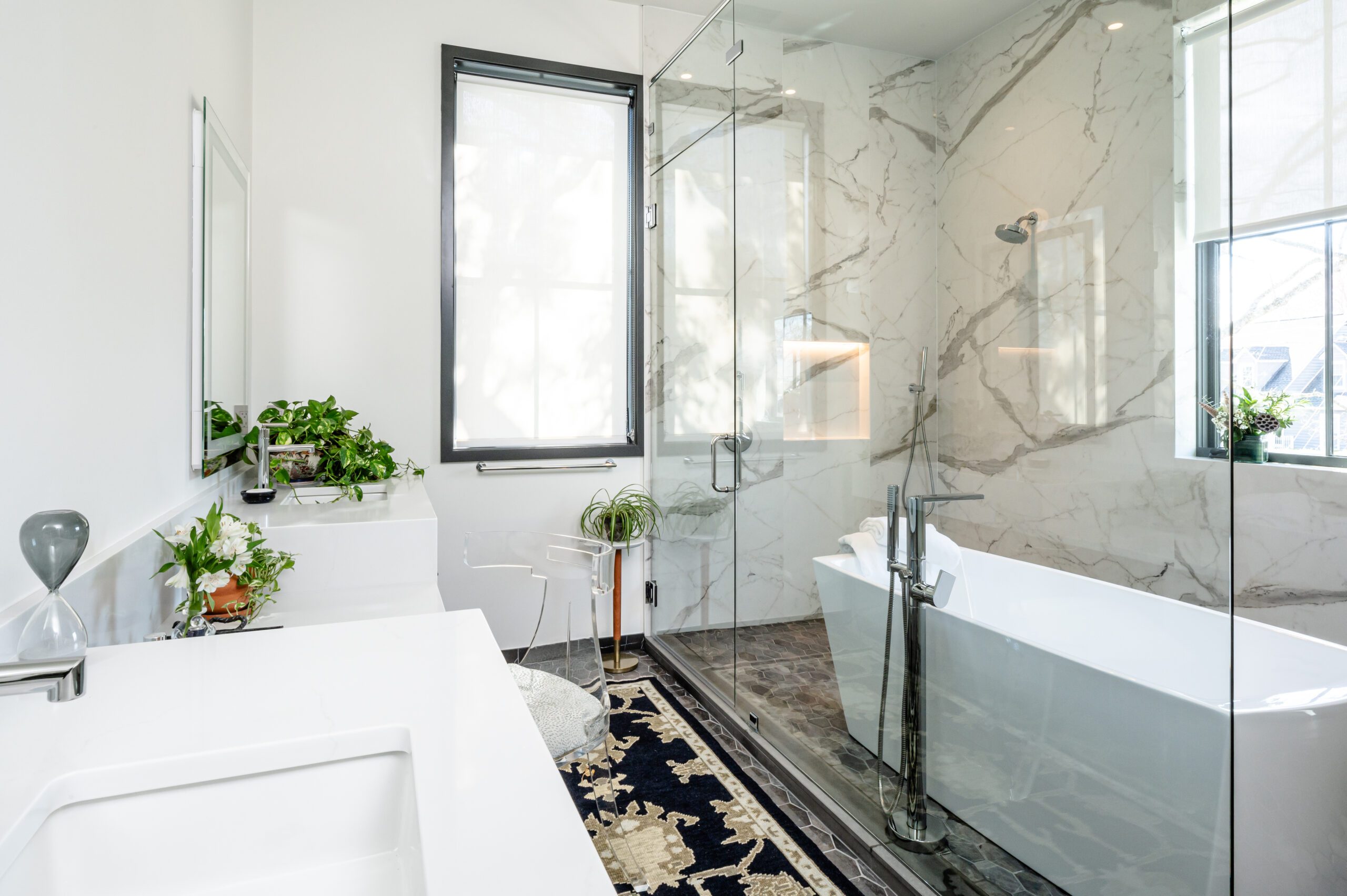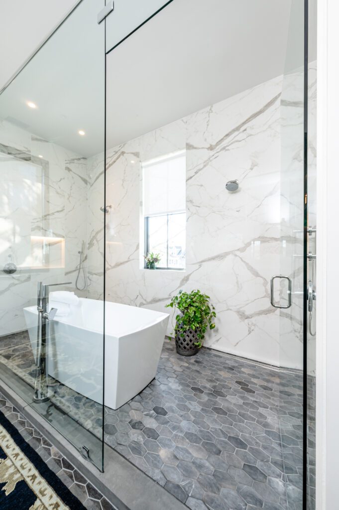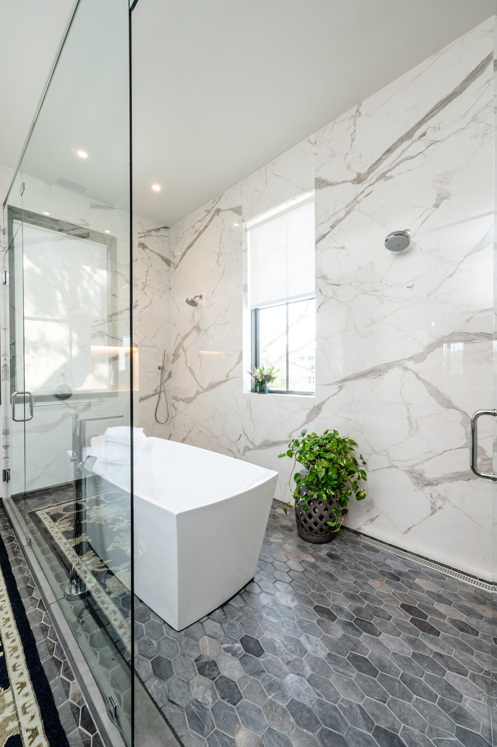 The interior design team at Malatich Cochran Design transformed this primary bathroom alongside the builders of Sifly Homes to create a contemporary wet room complete with two showers, an integrated soaking tub, and a separate water closet.