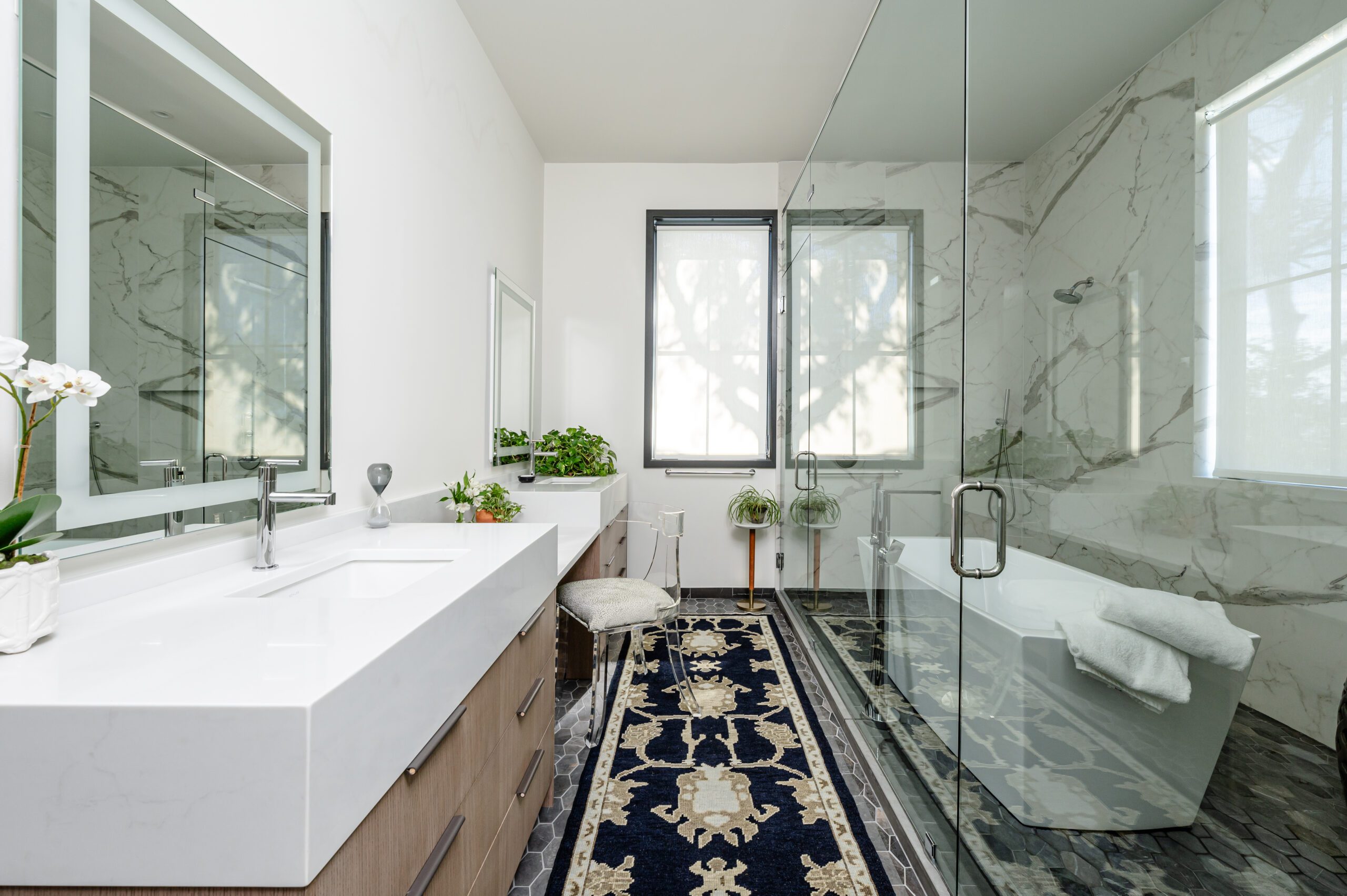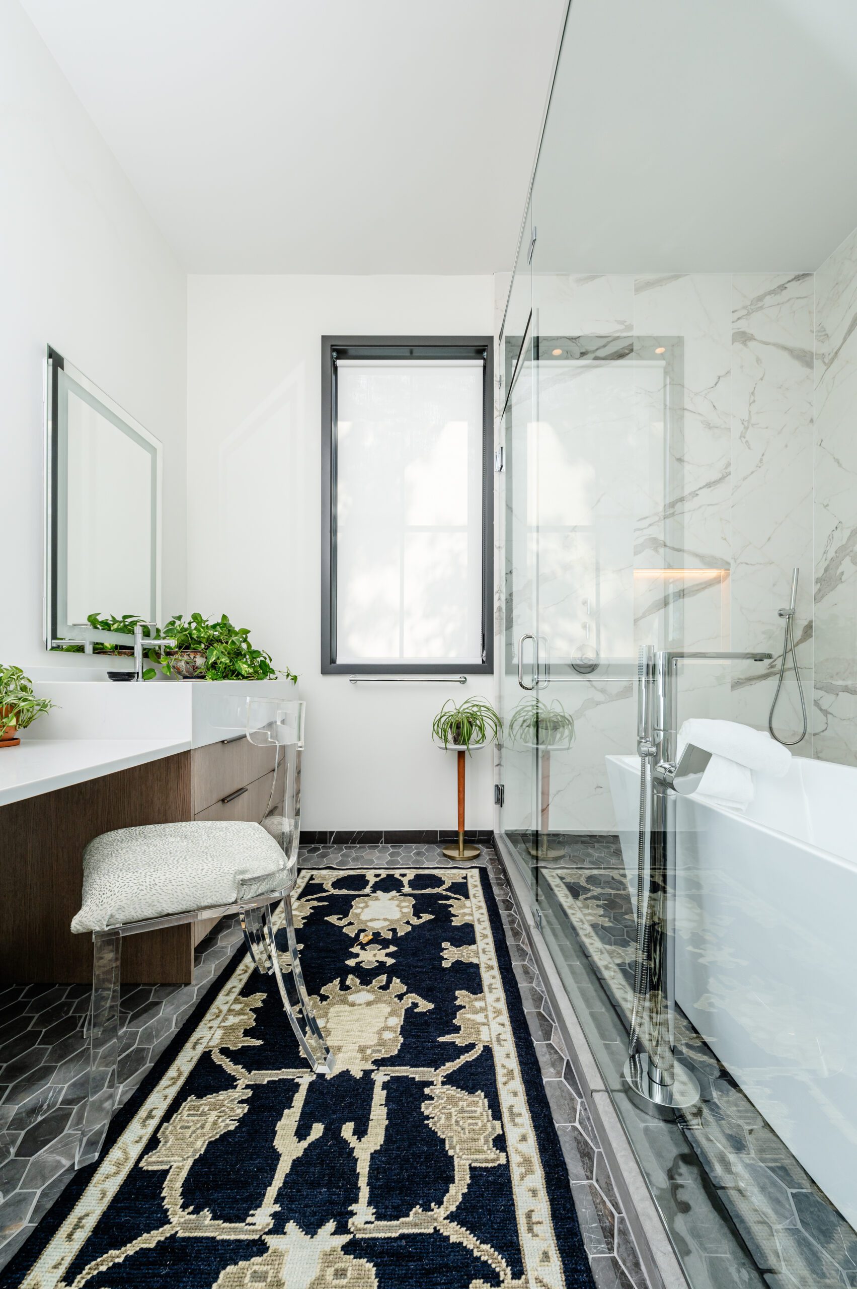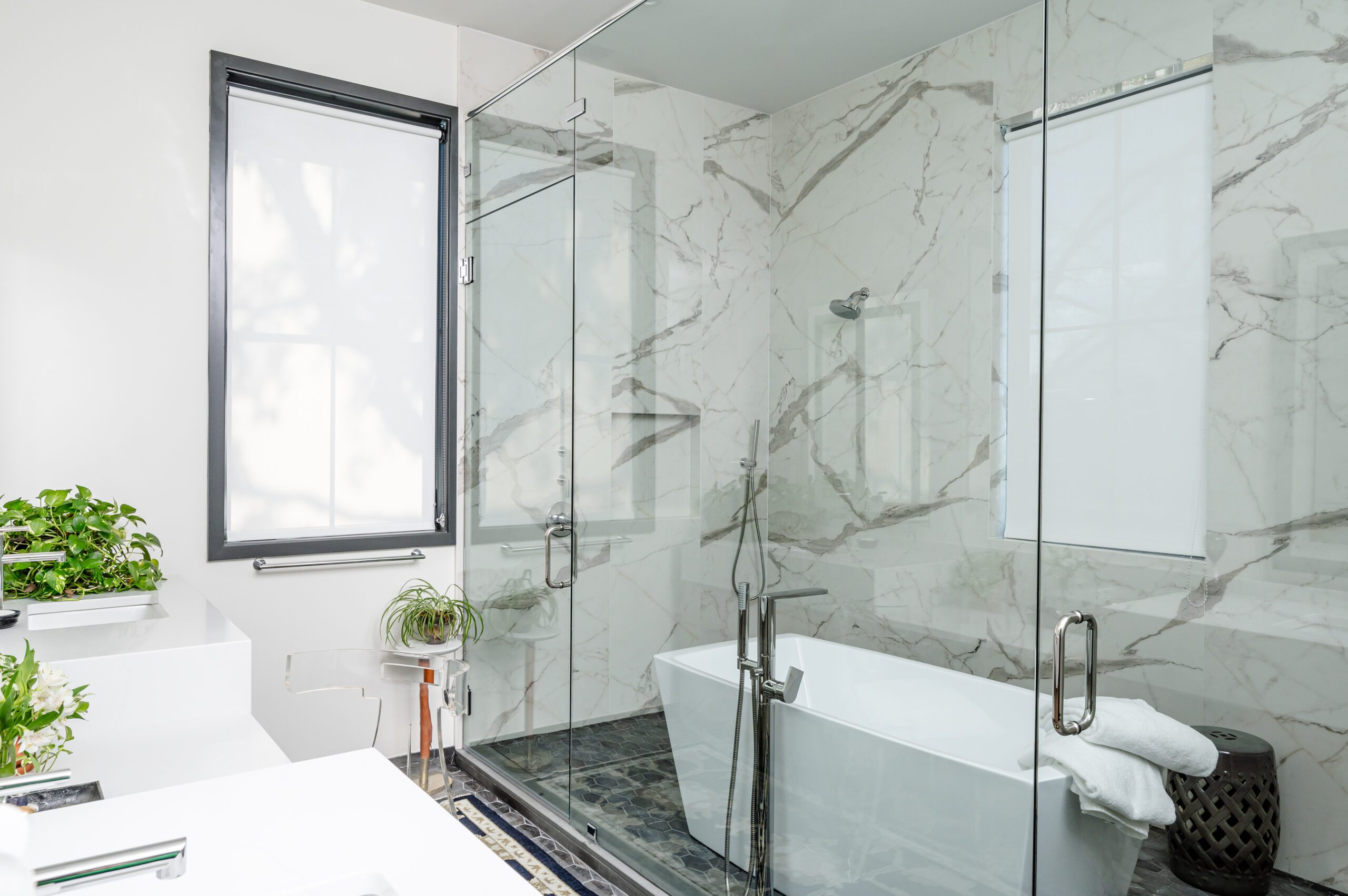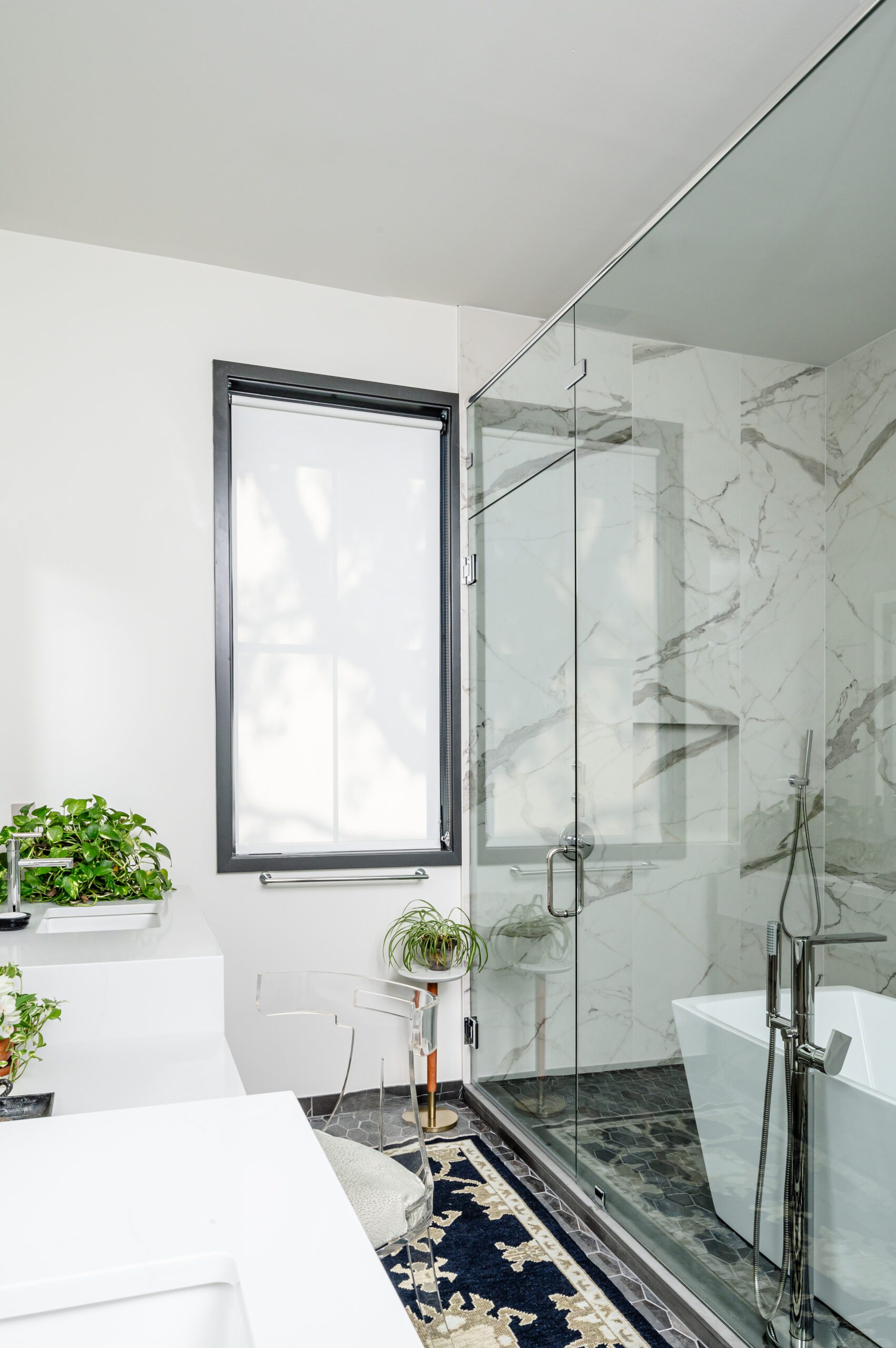 The interior design team at Malatich Cochran Design transformed this primary bathroom alongside the builders of Sifly Homes to create a contemporary wet room complete with two showers, an integrated soaking tub, and a separate water closet.