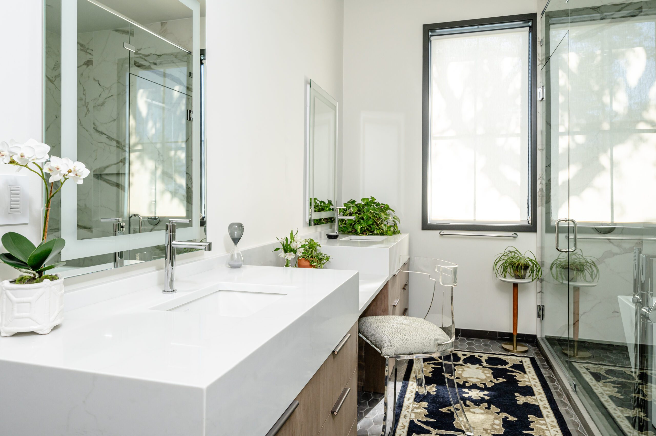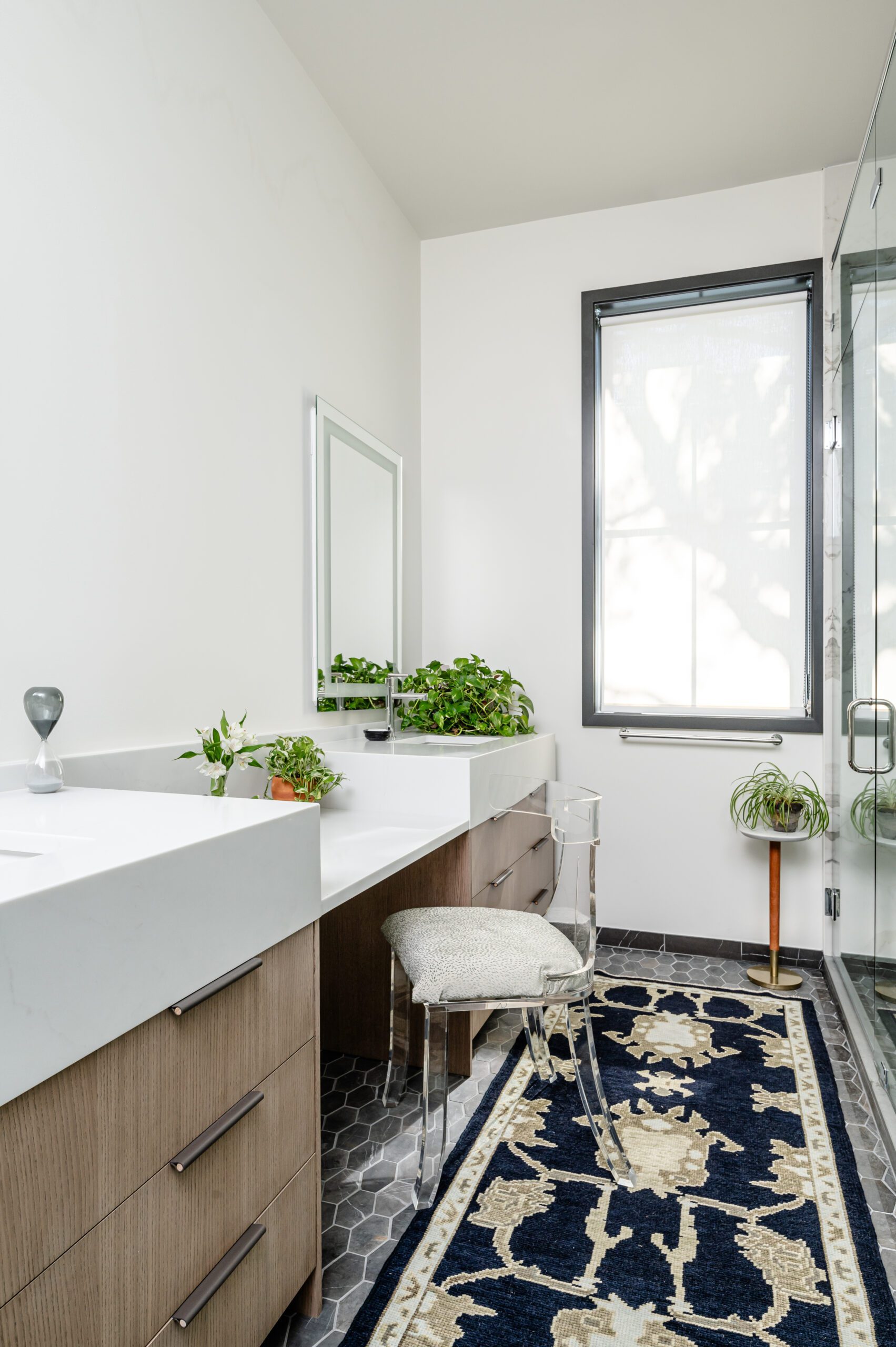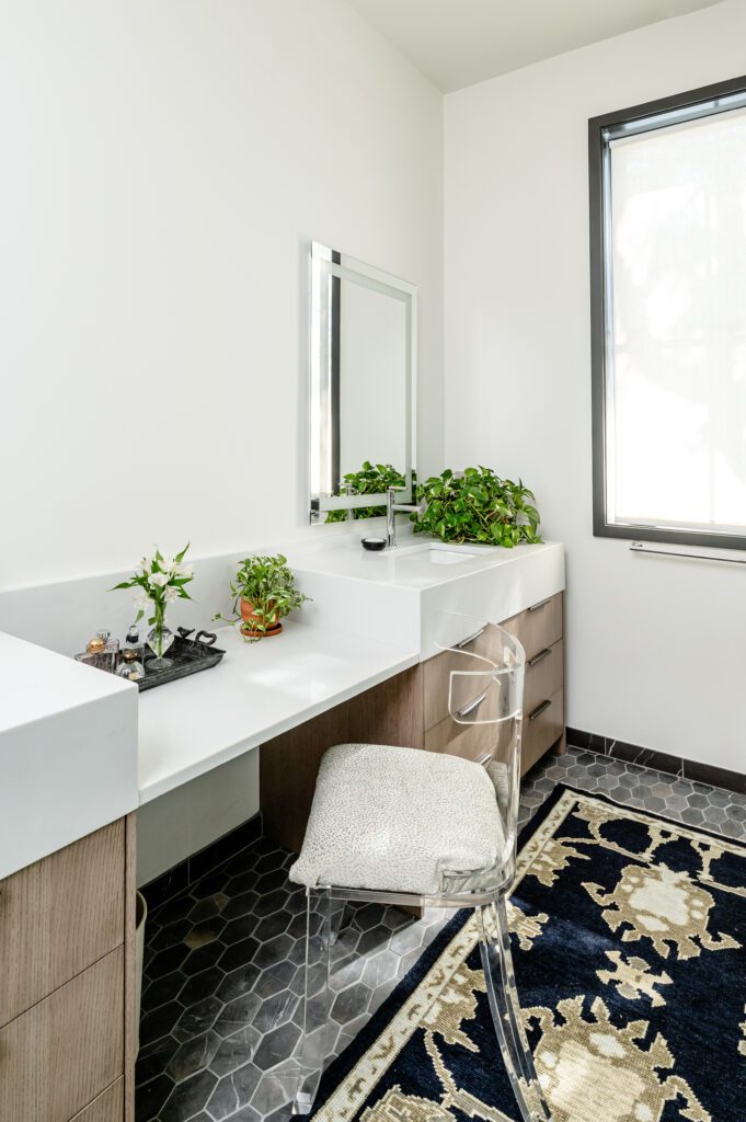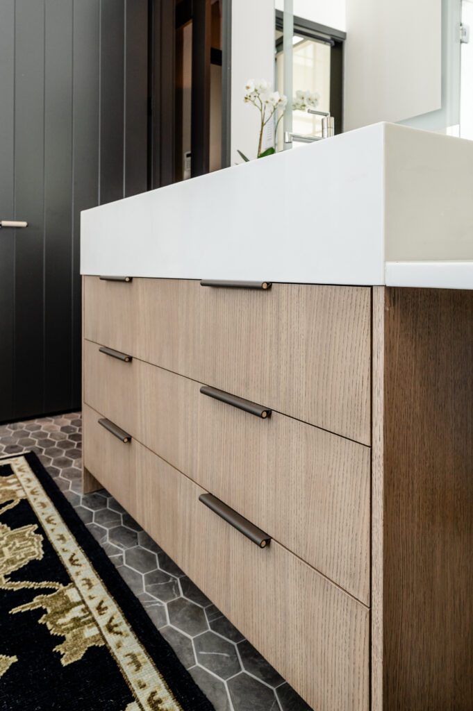 “The vanity intent was to integrate a make-up area within the connected vanities and to accommodate as much storage as possible. The wood stain complements the warm veining within the large Dekton wall slabs of the wet room.”