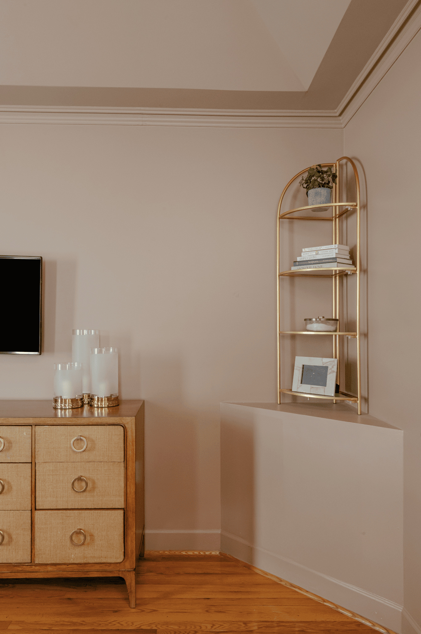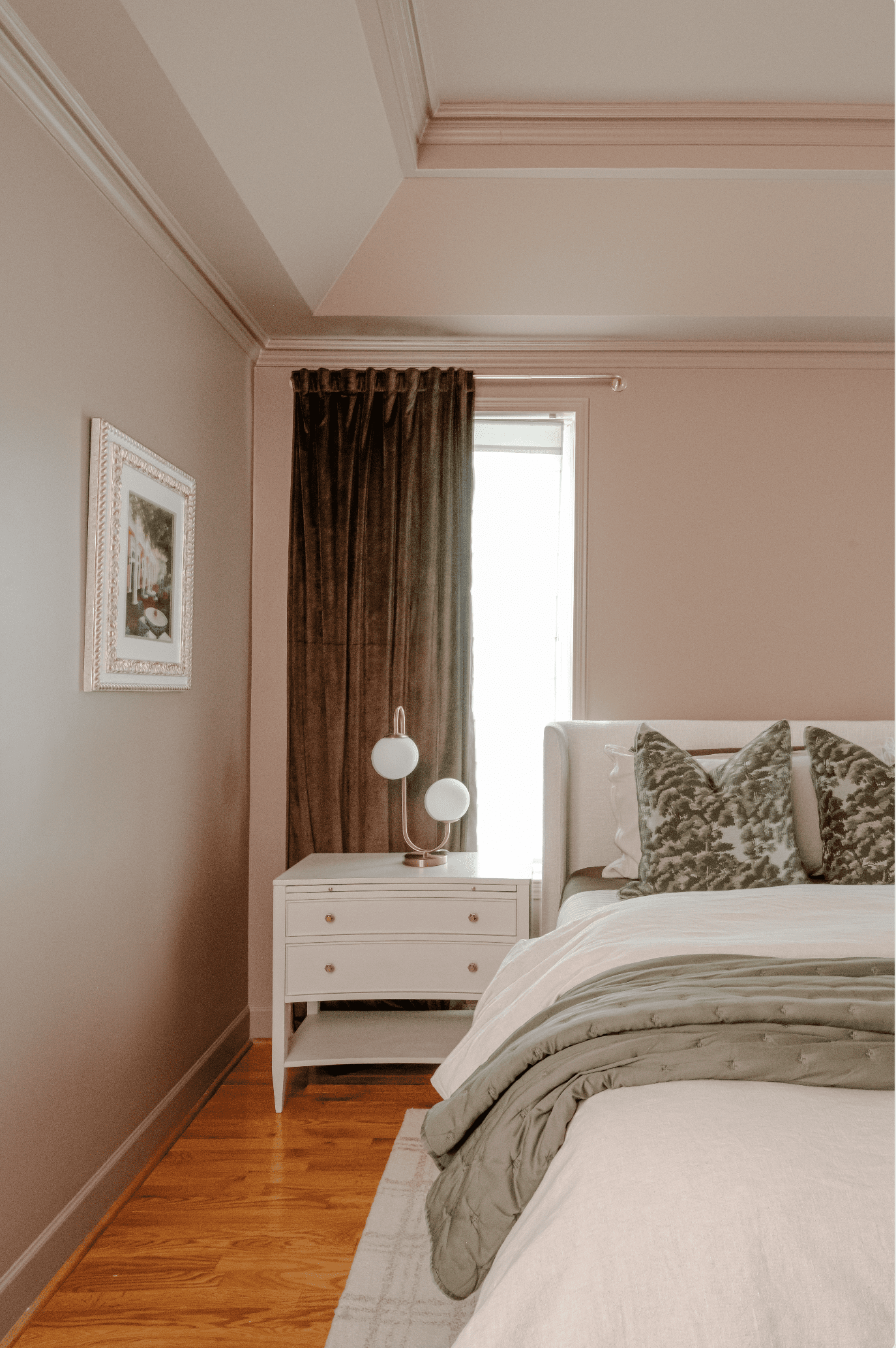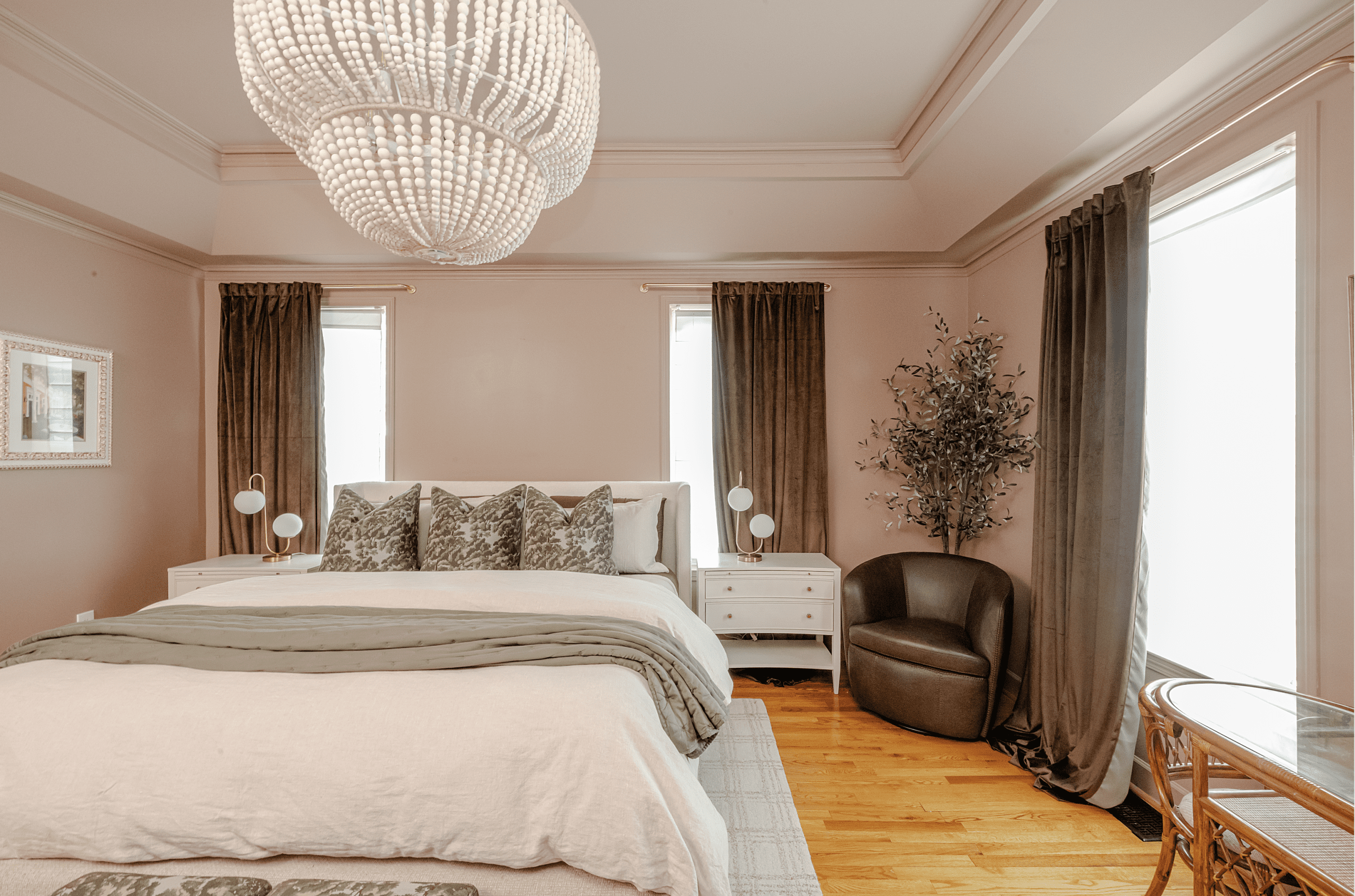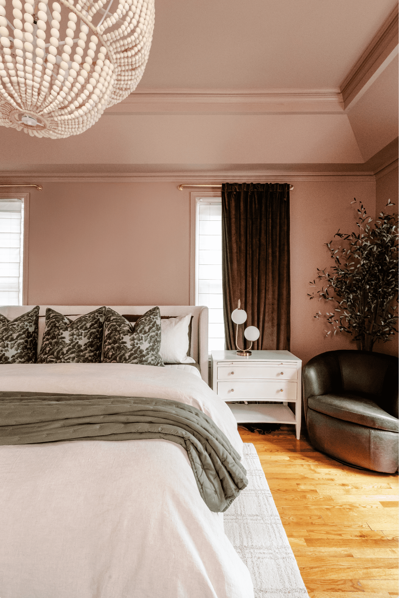 An outdated primary bedroom got a moody refresh thanks to the on-site designers and furniture specialists at J&K Home Furnishings.