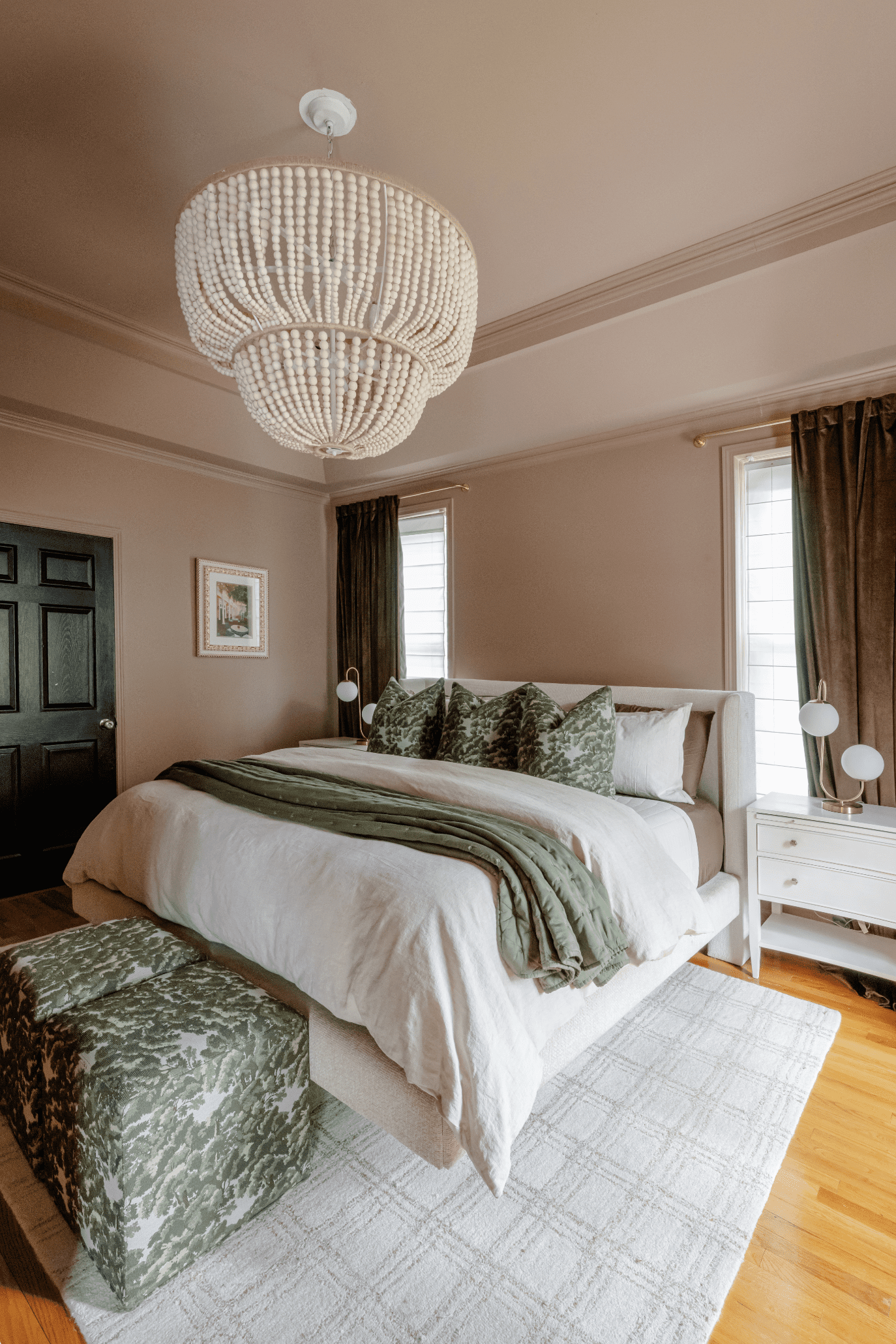 These homeowners wanted a completely new bedroom scheme without the stress of planning, sourcing, and installing. A visit to J&K Home Furnishings in Mount Pleasant and their on-site designers led them in the right direction for furniture selection, custom upholstery, window treatments, and even paint selection. The new bedroom design feels earthly with elevated neutrals and color-drenched walls, ceiling, and trim. A mix of rich textures (velvet, leather, and silk) plays against the contrast of a beaded chandelier. The result is a soothing and moody escape perfect for rest.