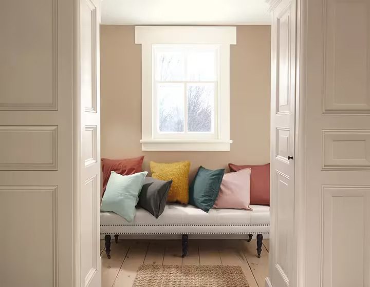 Benjamin Moore’s eight-color lineup layers enchanting pales with handsome midtones for a collected, edited feel: Silhouette AF-655, Raindance 1572, Swiss Coffee OC-45, First Crush CSP-310, Batik AF-610, Narragansett Green HC-157, Southwest Pottery 048, and Sherwood Tan 1054. Style Silhouette with airy Raindance or First Crush for contrast, or lean into warmth with Sherwood Tan and Southwest Pottery.