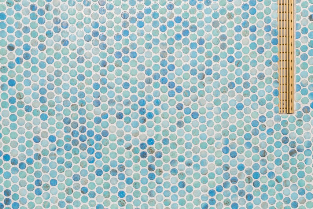 The various shades of marble blue penny tile were hand-laid and created a unique pattern of its own with a pop of color to coordinate with the wallpaper.