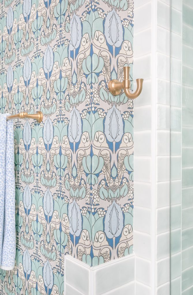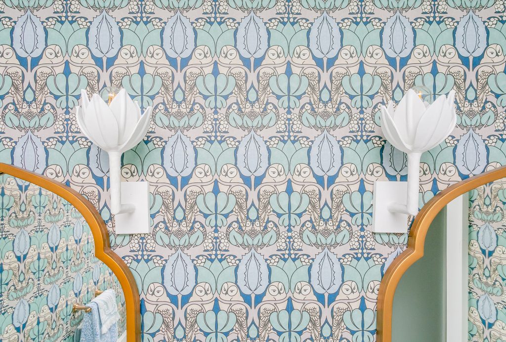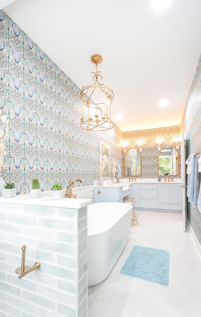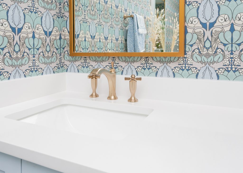 It’s nice to have an inspiration piece to bring along to showrooms to give designers a starting point. This homeowner’s vision began with this fun wallpaper that inspired the light blue furniture-style cabinetry and vanity.