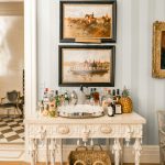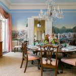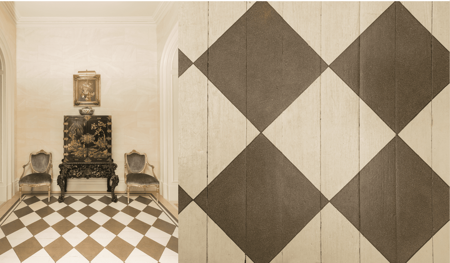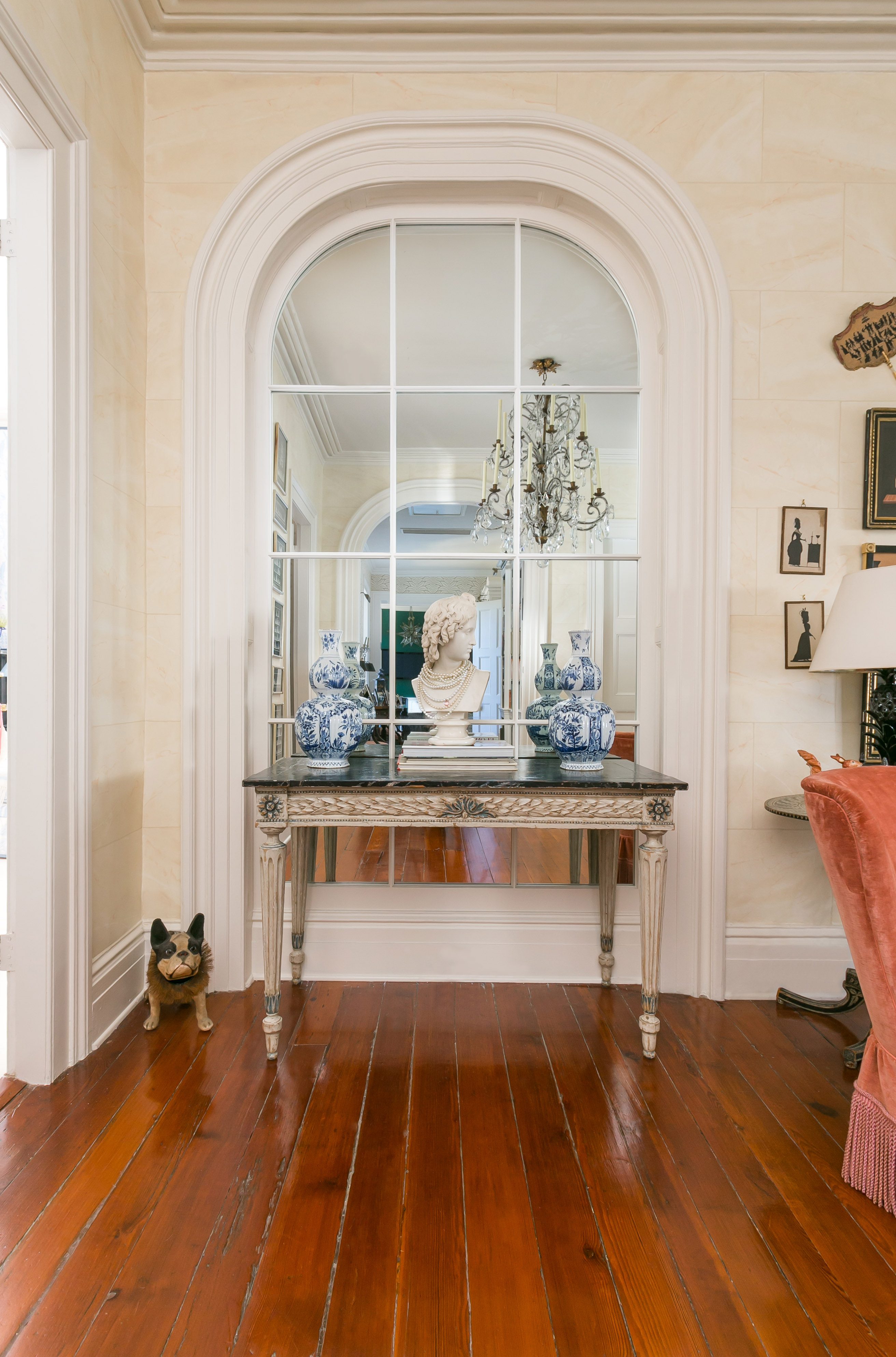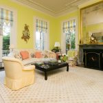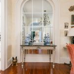 (Above) Careful craftsmanship went into this home renovation. Hand painted floors were one of Patricia’s must haves when putting her personal touch on this house. This hand painted work can be seen in the faux marbling on the walls as well. Patricia’s drawing rooms showcase many of her thoughtfully curated pieces of artwork and have been specifically staged and styled by her interior designer.