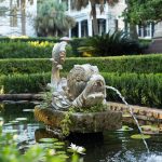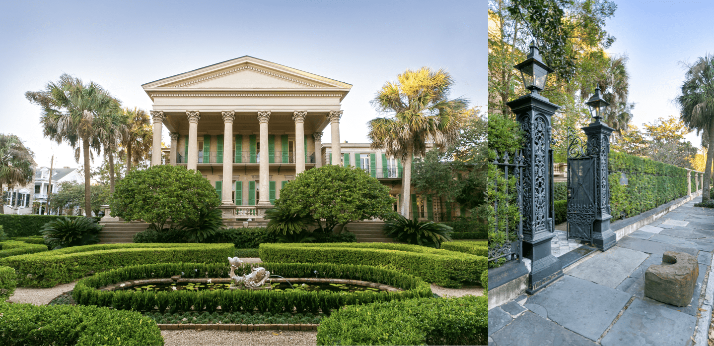 (Above) Patricia’s home is the Isaac Jenkins Mikell House, which once acted as the Charleston Free Library for nearly 30 years. Classic Charleston gas lamps anchor the iron gate to Patricia’s downtown mansion. High fences with thick greenery help provide a little privacy from the carriage ride tour groups that pass by daily to catch a glimpse of this stately abode.