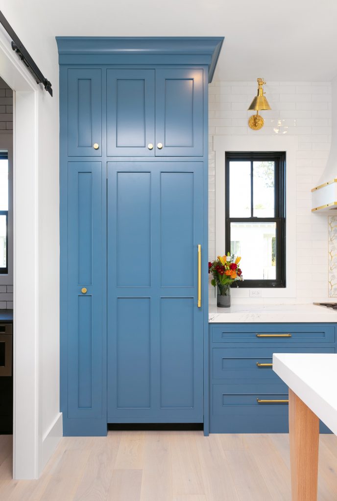 Custom appliance panels designed and fabricated by MTPKB blend seamlessly into this vibrant blue lacquer.