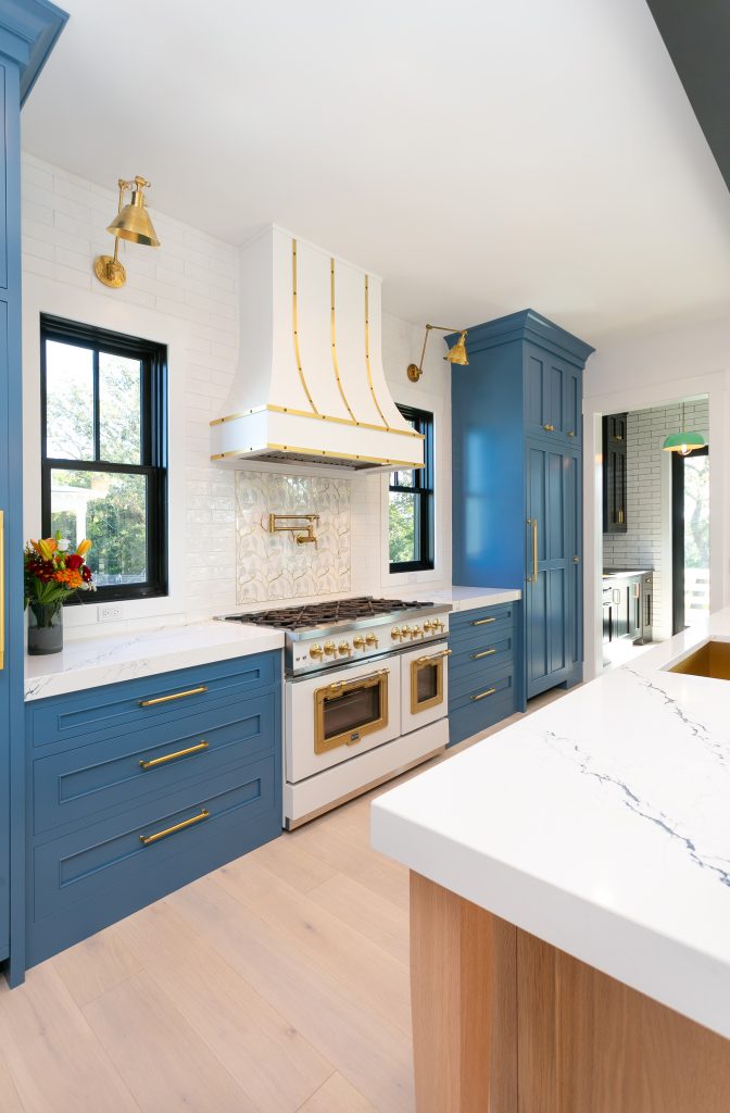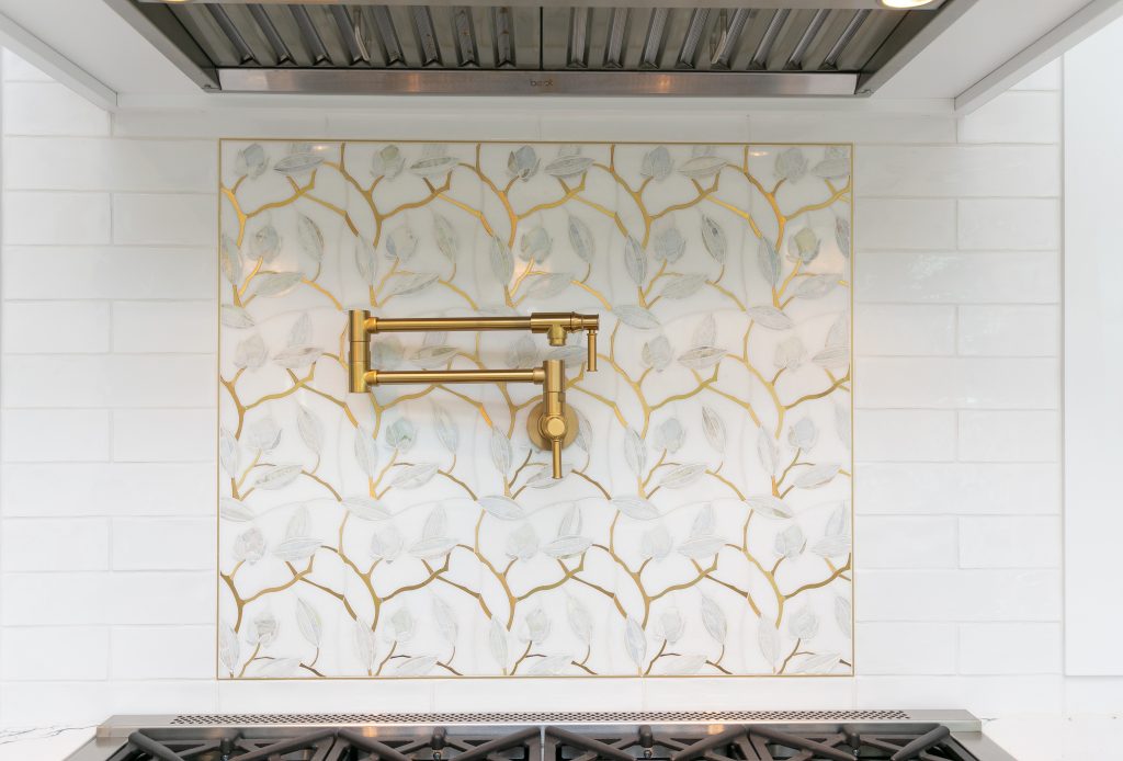 A custom hand-tiled backsplash is accented by a centered statement tile. Positioned directly above is a handy pot filler that complements the brass hardware on the rest of the plumbing fixtures and appliances.