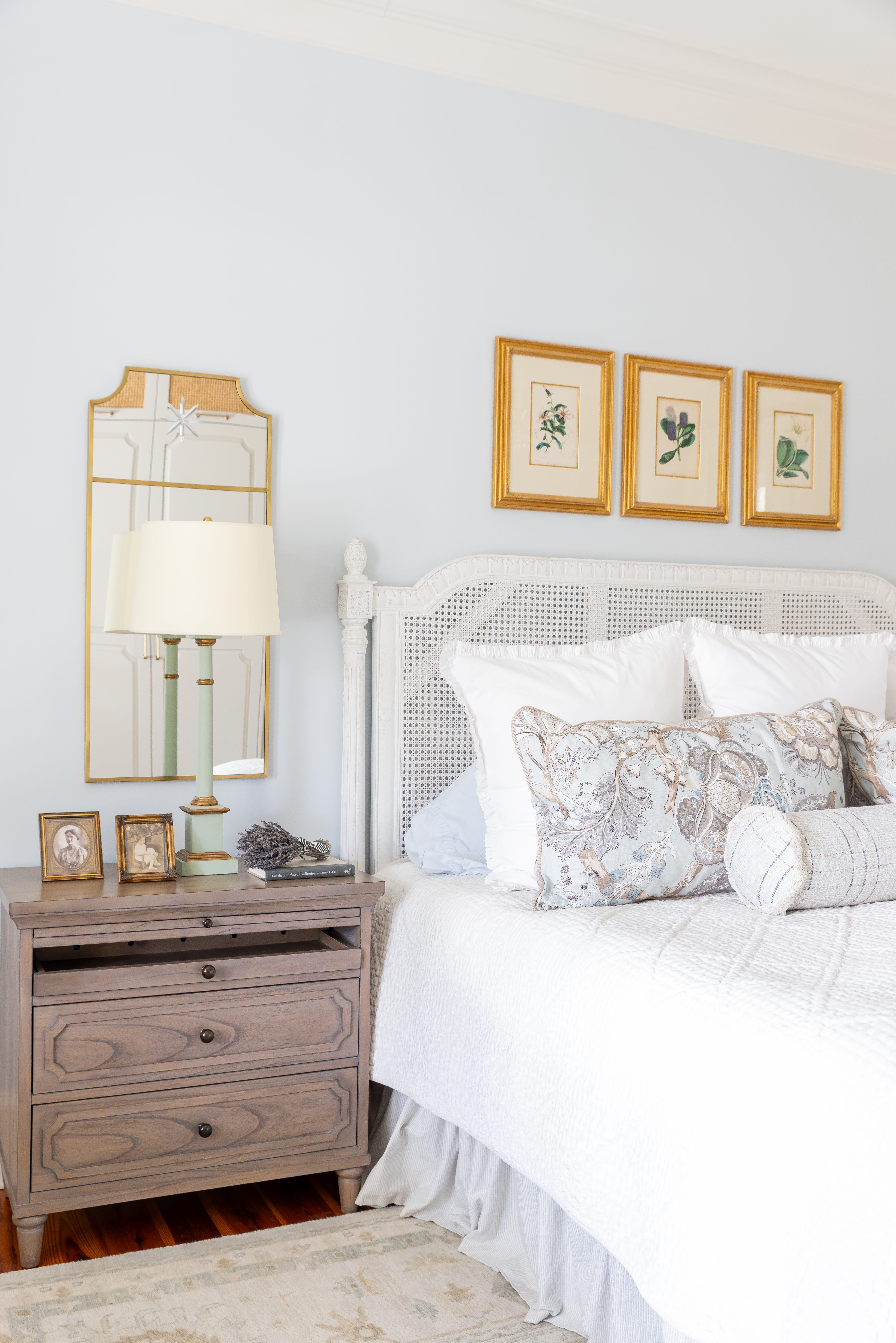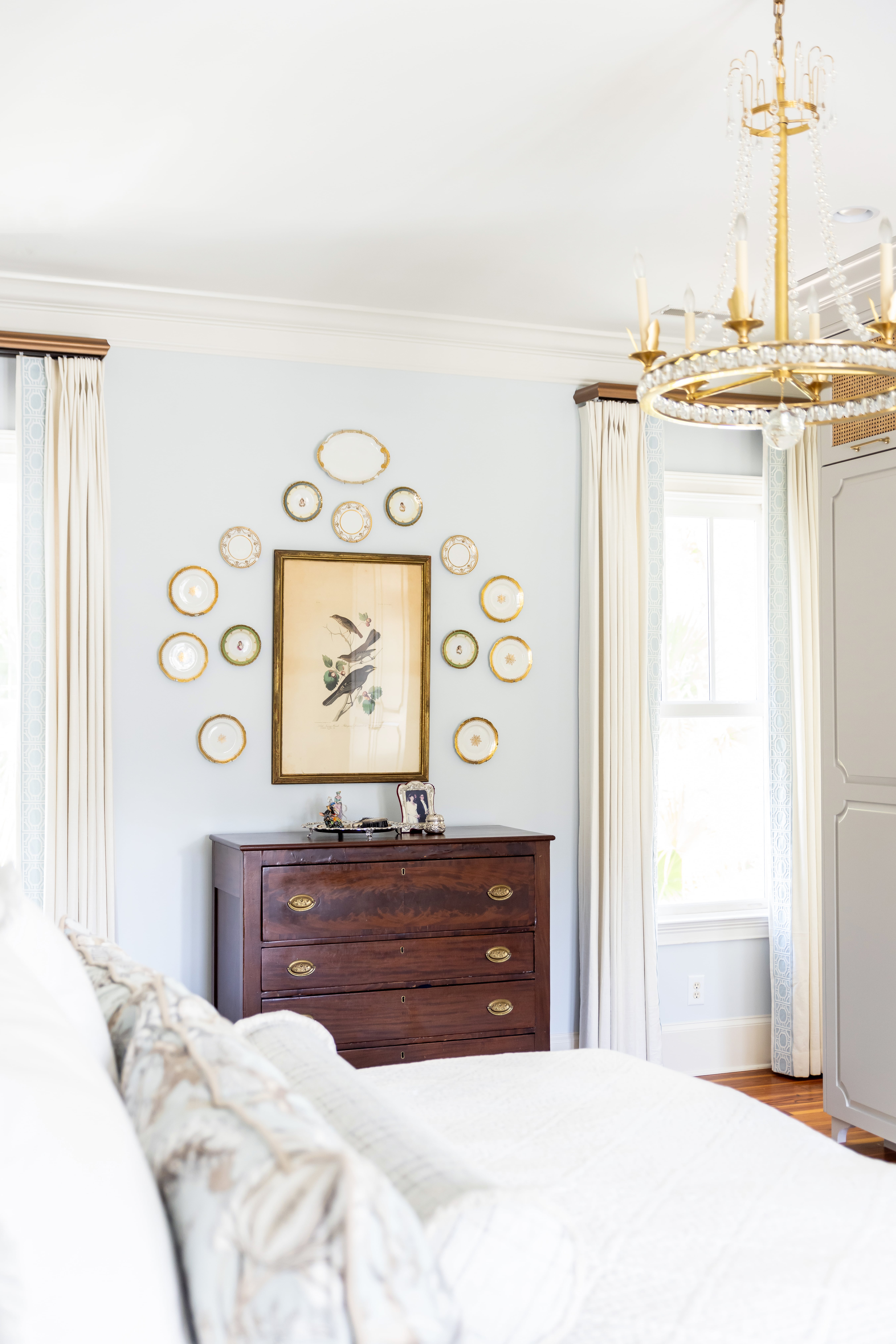 “The clients had two antique furniture pieces as well as some French wall panels. We incorporated all of it into the design to maintain and update their traditional aesthetic. We carried the colors through the rug, bed linens, and onto the window treatments to marry the new furniture with the existing decor. It was due to the soft color palette that this space balances fresh and new with timeworn and antique elements.”