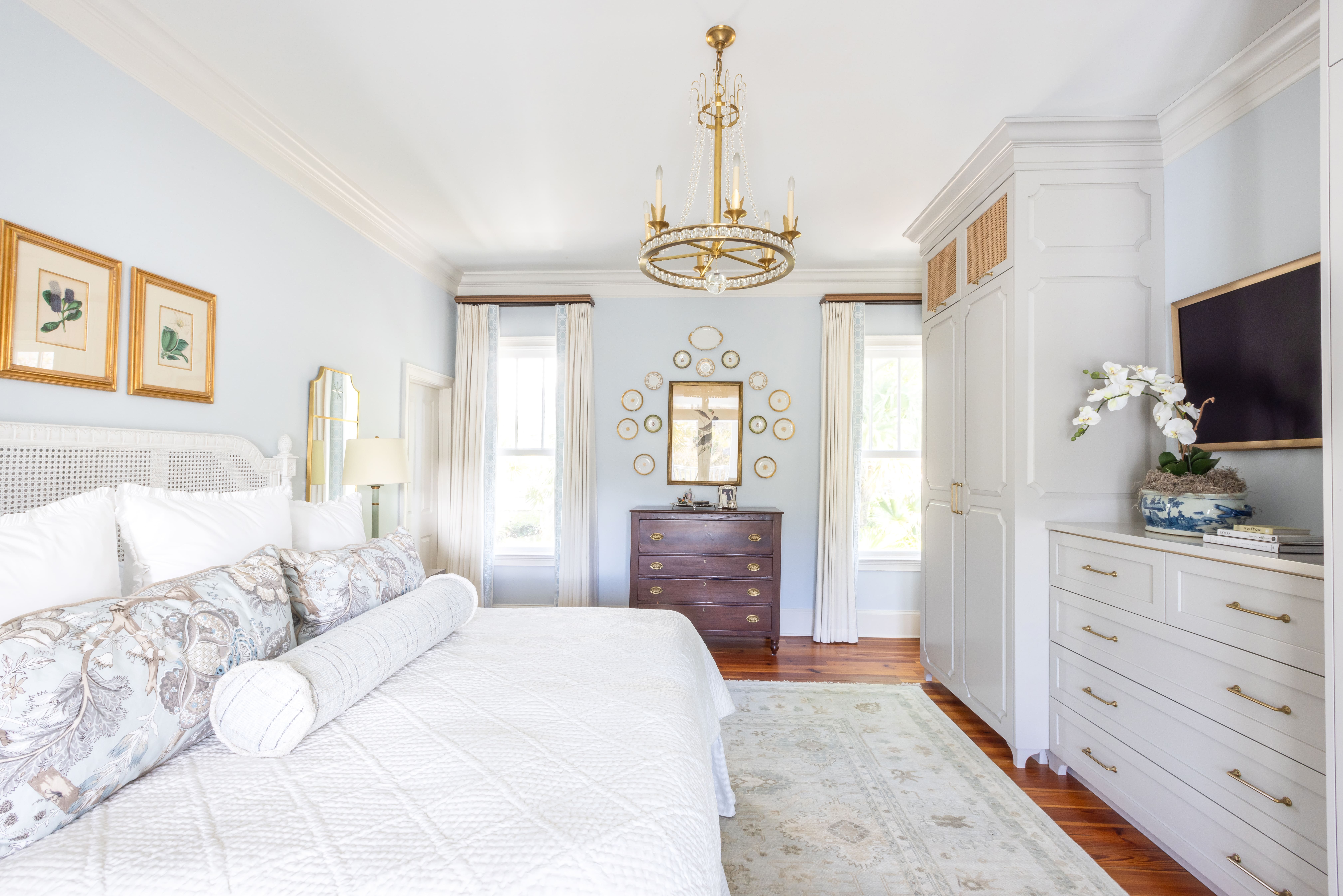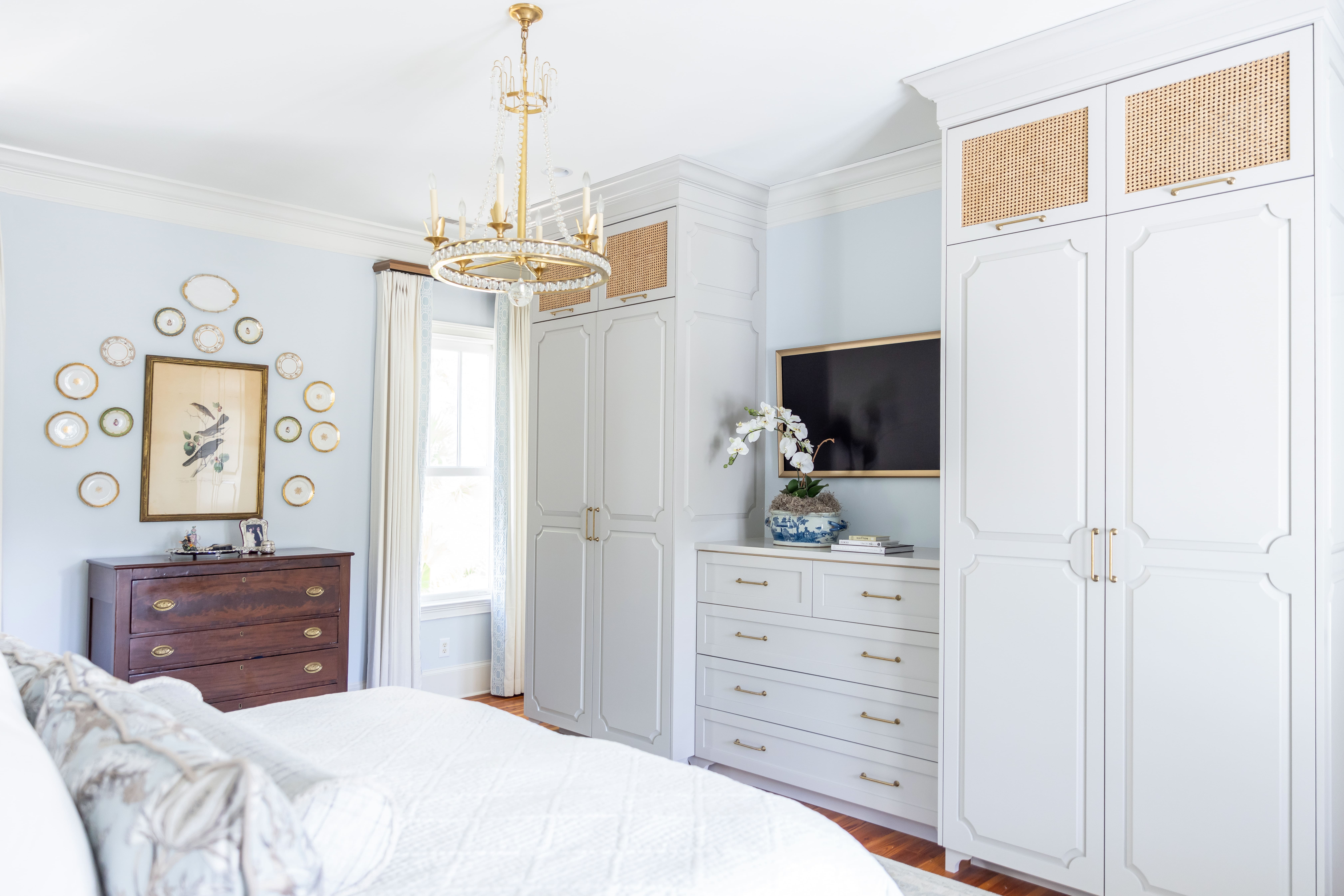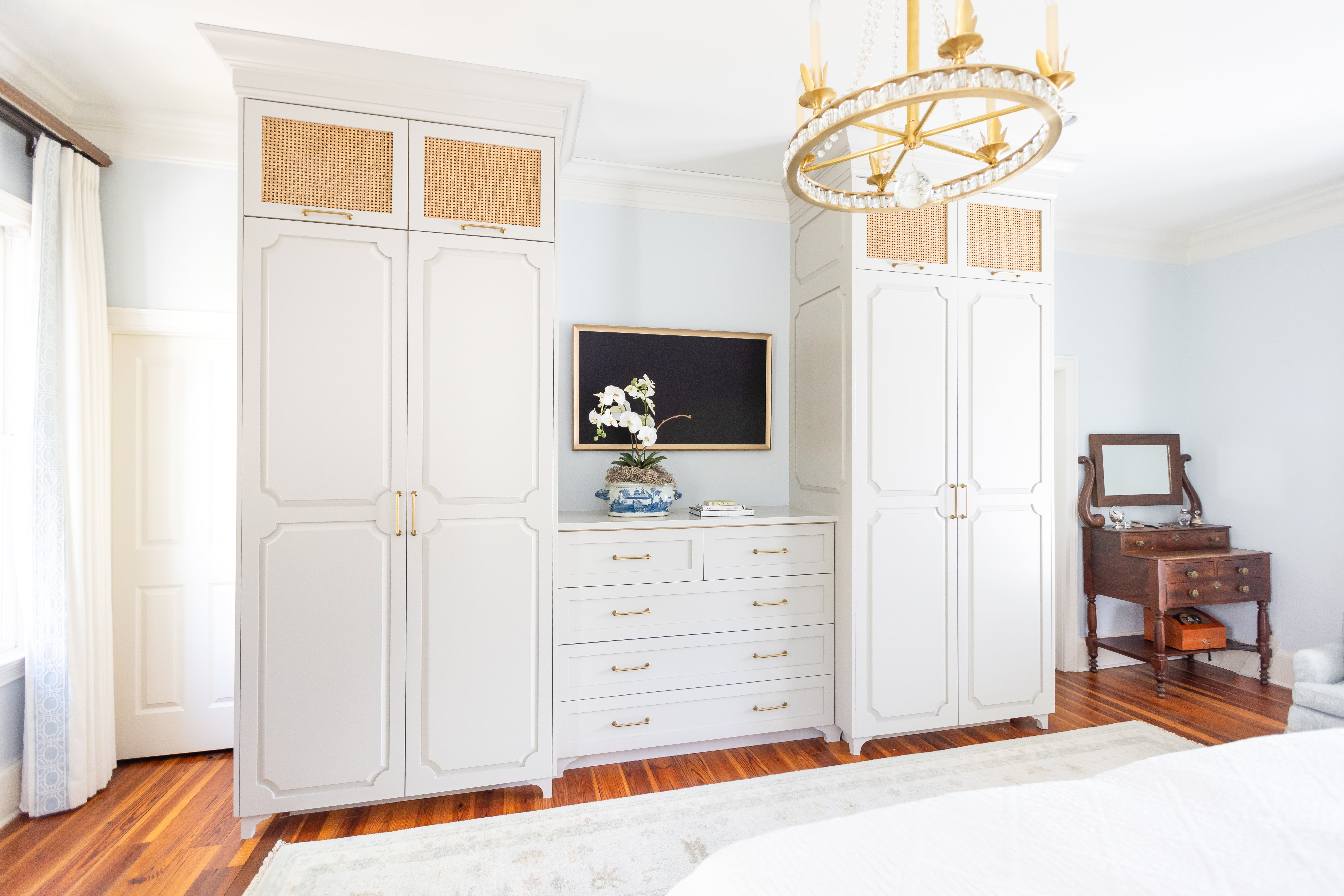 What initially sparked this primary bedroom overhaul was what it had always been missing: closet space. Of course, built-ins are what the mind might think of next, except this couple was certain it might end up looking like a set of cabinets. Luckily, their trusted interior designer, Terri Baldwin of CHD Interiors, explained how she might make their wants and needs align with a custom-built solution. Terri’s apt renaming of them, “armoires,” made this project one that the homeowners could look forward to with their traditional sensibilities.