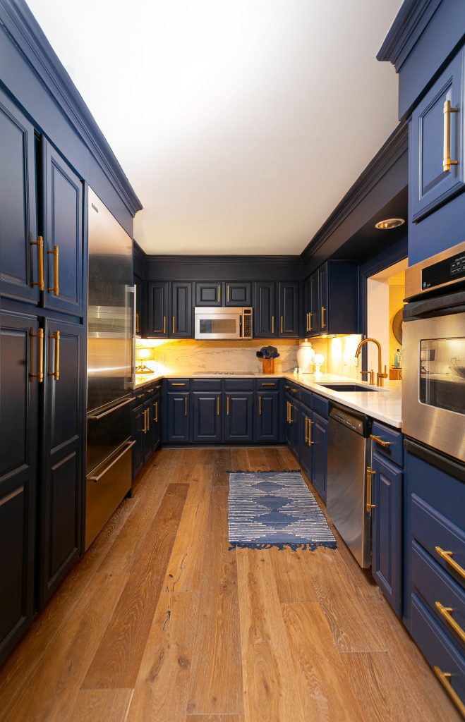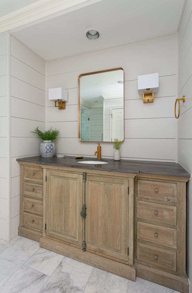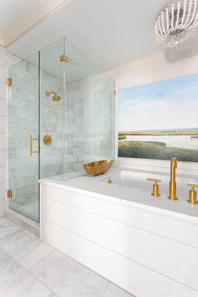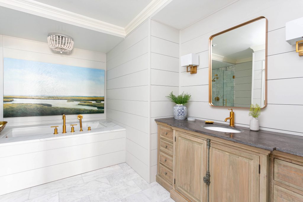 In order to create that city-chic mixed with coastal look, LC Creative worked closely with Gateway to find the right plumbing fixtures to fit the look the owner desired. They decided that the best look for this remodel was a mix of gold and navy plumbing fixtures to match both the coast and the city. In the master bathroom, they used gold fixtures from Kohler to give the room an elegant touch. These fixtures provided the quality and style that the designer and homeowners were looking for.