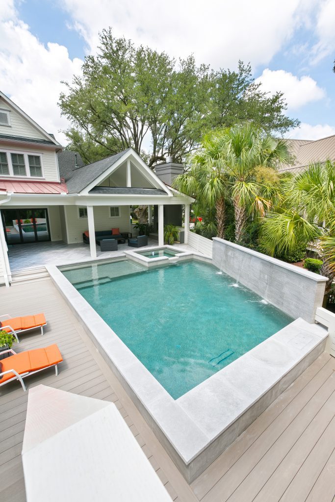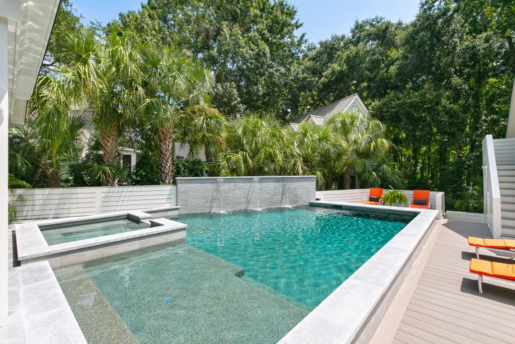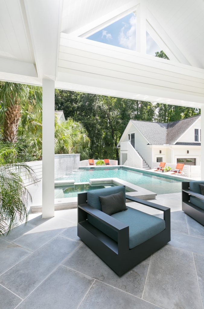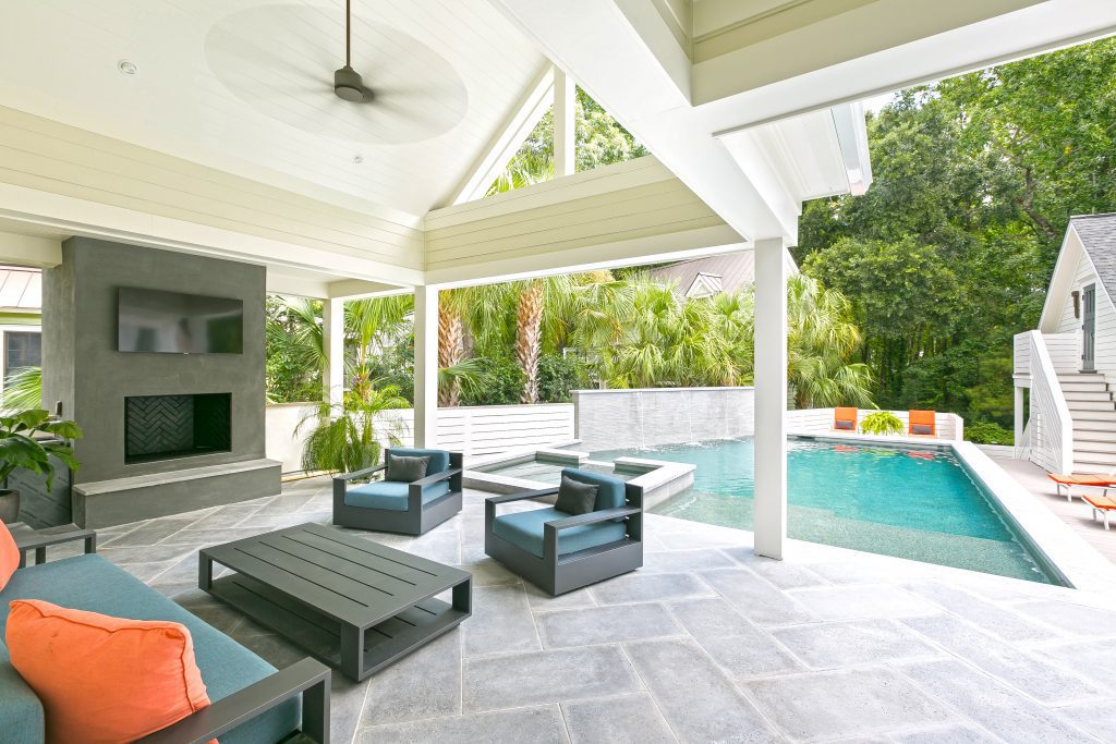 The custom builder created a backyard oasis at this Daniel Island home for the owners to enjoy all year round. This project included a new fireplace on their newly tiled back porch to give them privacy. SHELTER also added an outdoor kitchen, covered lounge area, and a pool for relaxation.