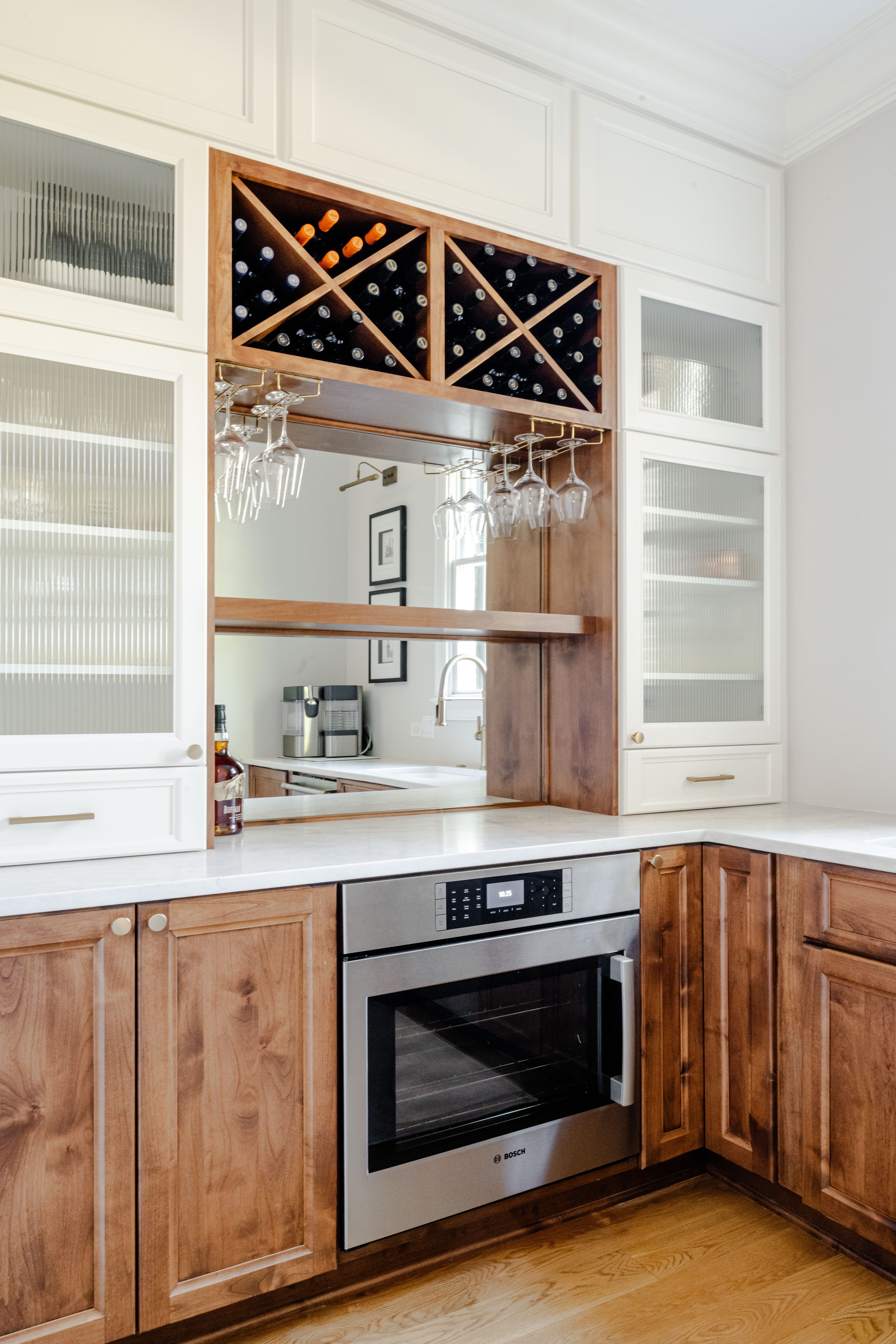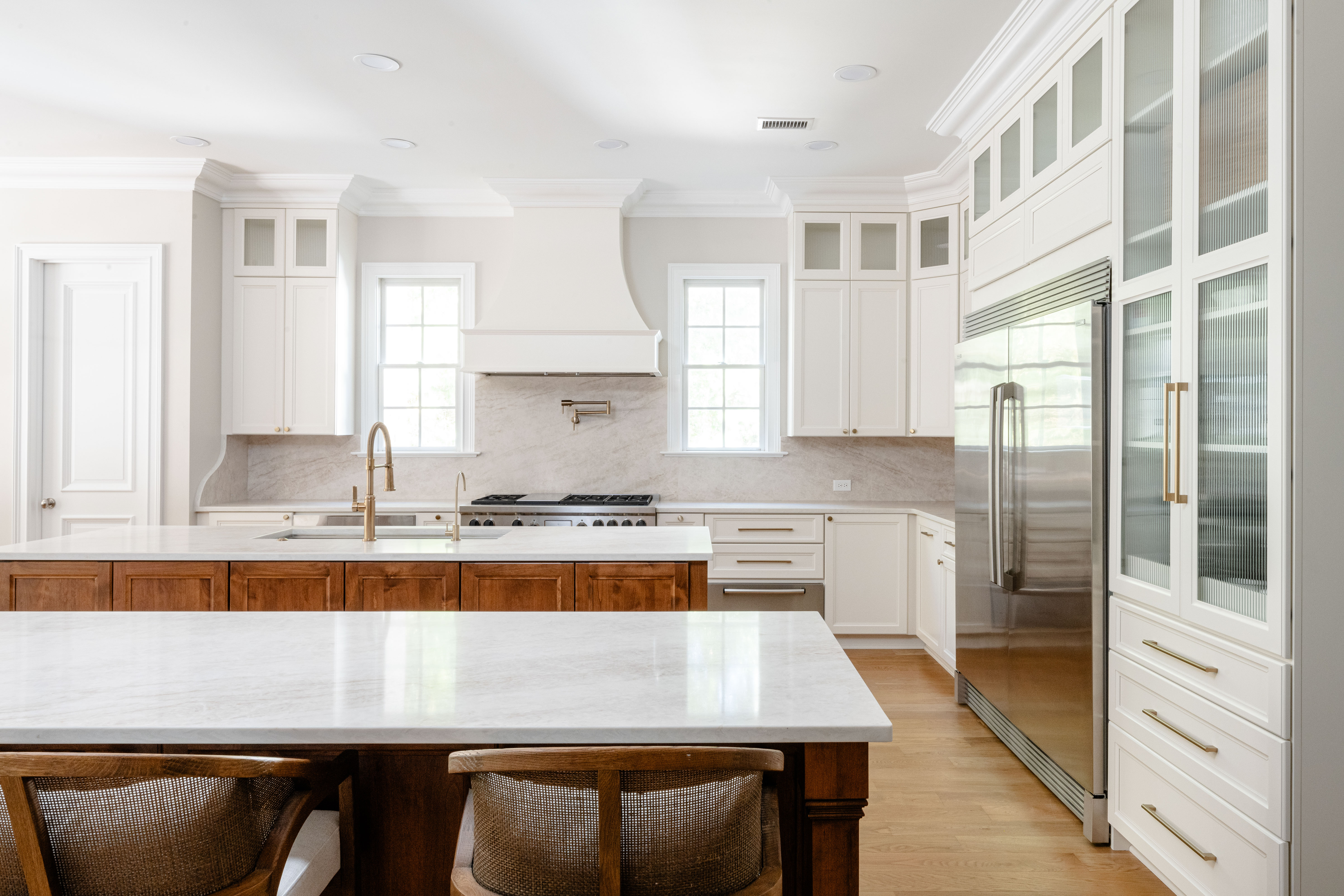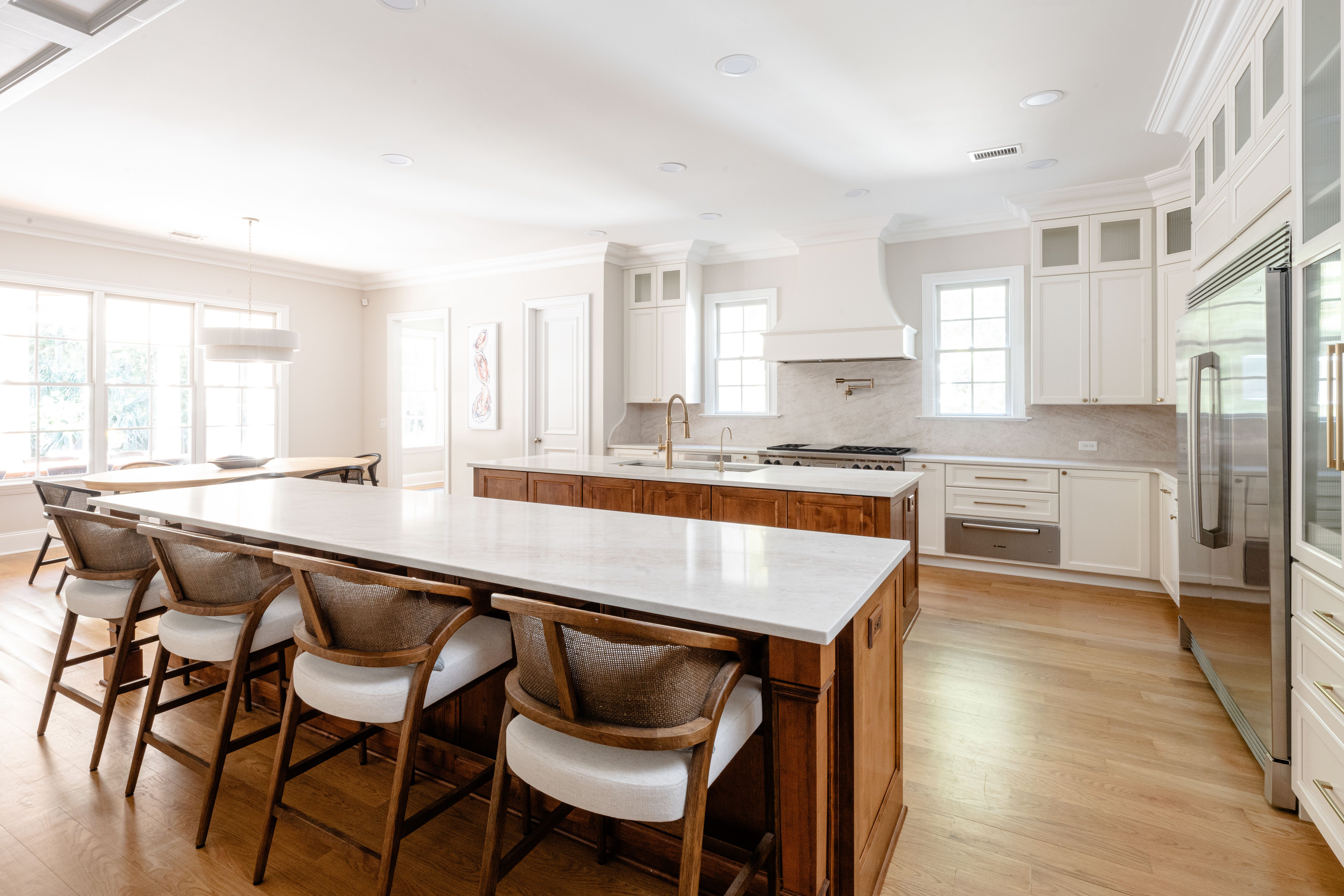 Custom cabinetry painted Alabaster White keeps the perimeter light and streamlined, while Colonial Alder on the islands adds warmth and grounding contrast. Reeded glass doors soften visibility and introduce a refined, tailored finish. The result is a Charleston kitchen renovation and whole-home update that balances beauty with performance.