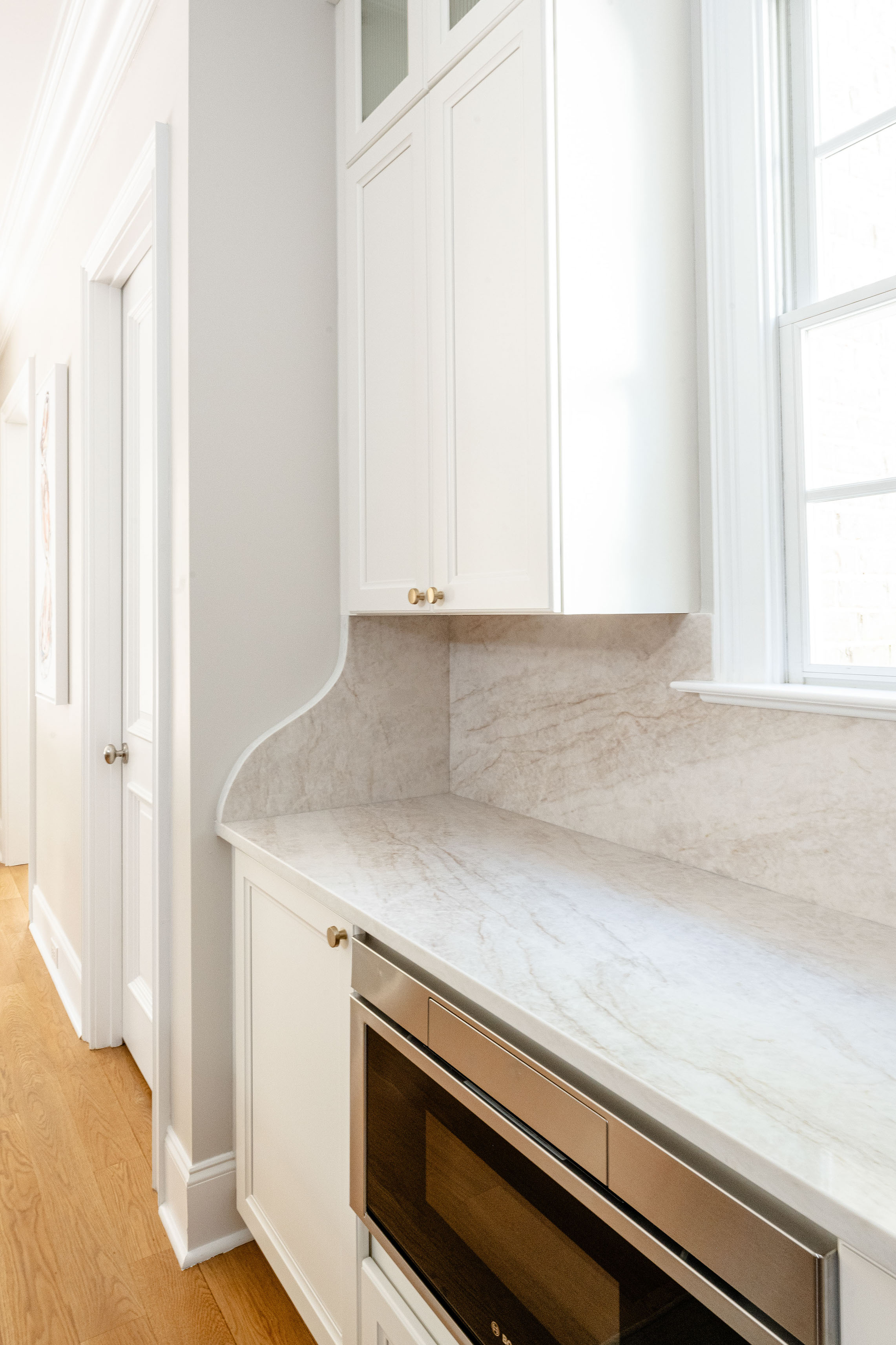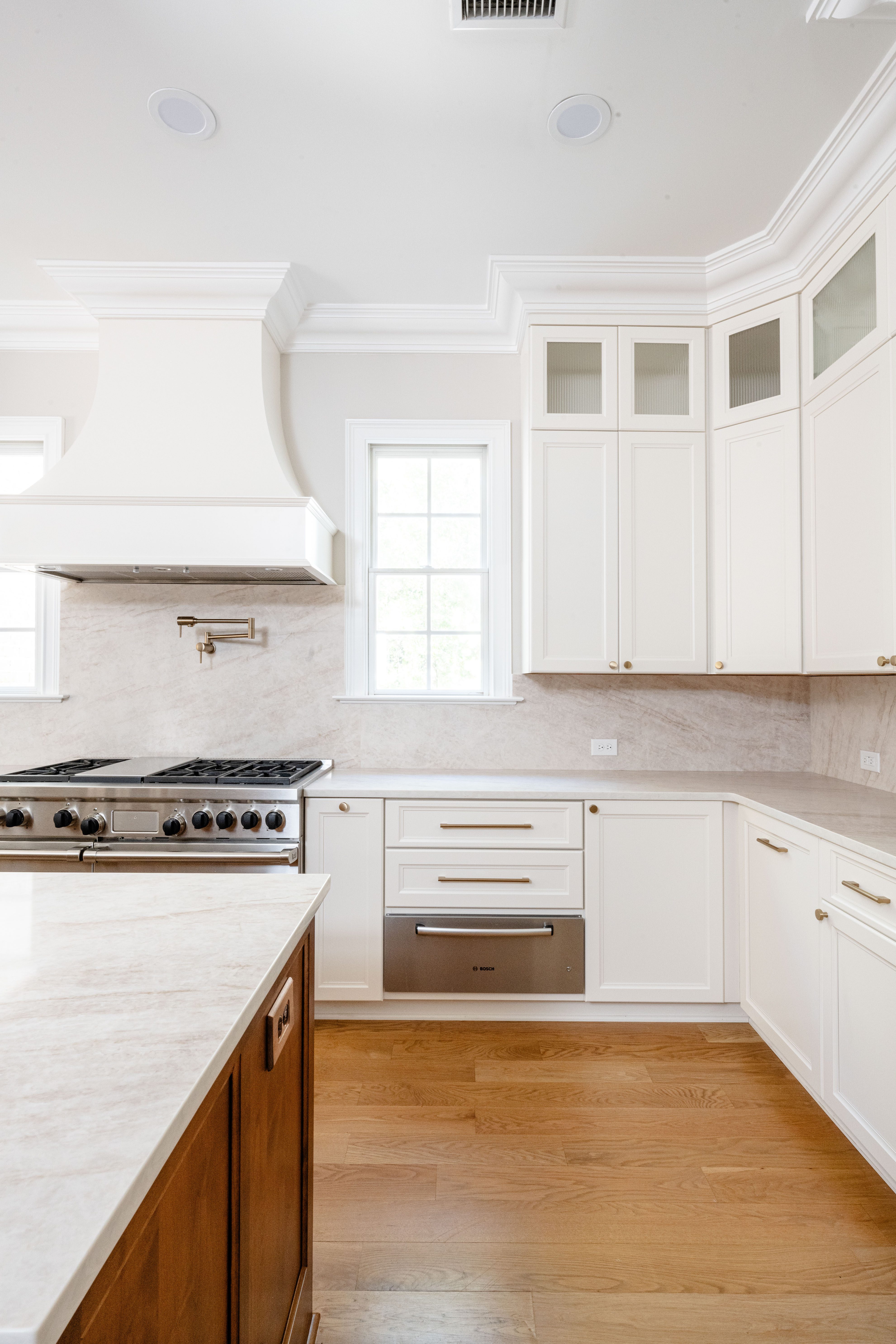 That single upgrade improved workflow while opening up space for seating, plating, and conversation. Every zone follows real, everyday tasks. Material selections brought a sense of calm and cohesion. Taj Mahal quartzite spans the countertops and extends up the backsplash in a full-height installation, creating visual continuity and subtle drama.