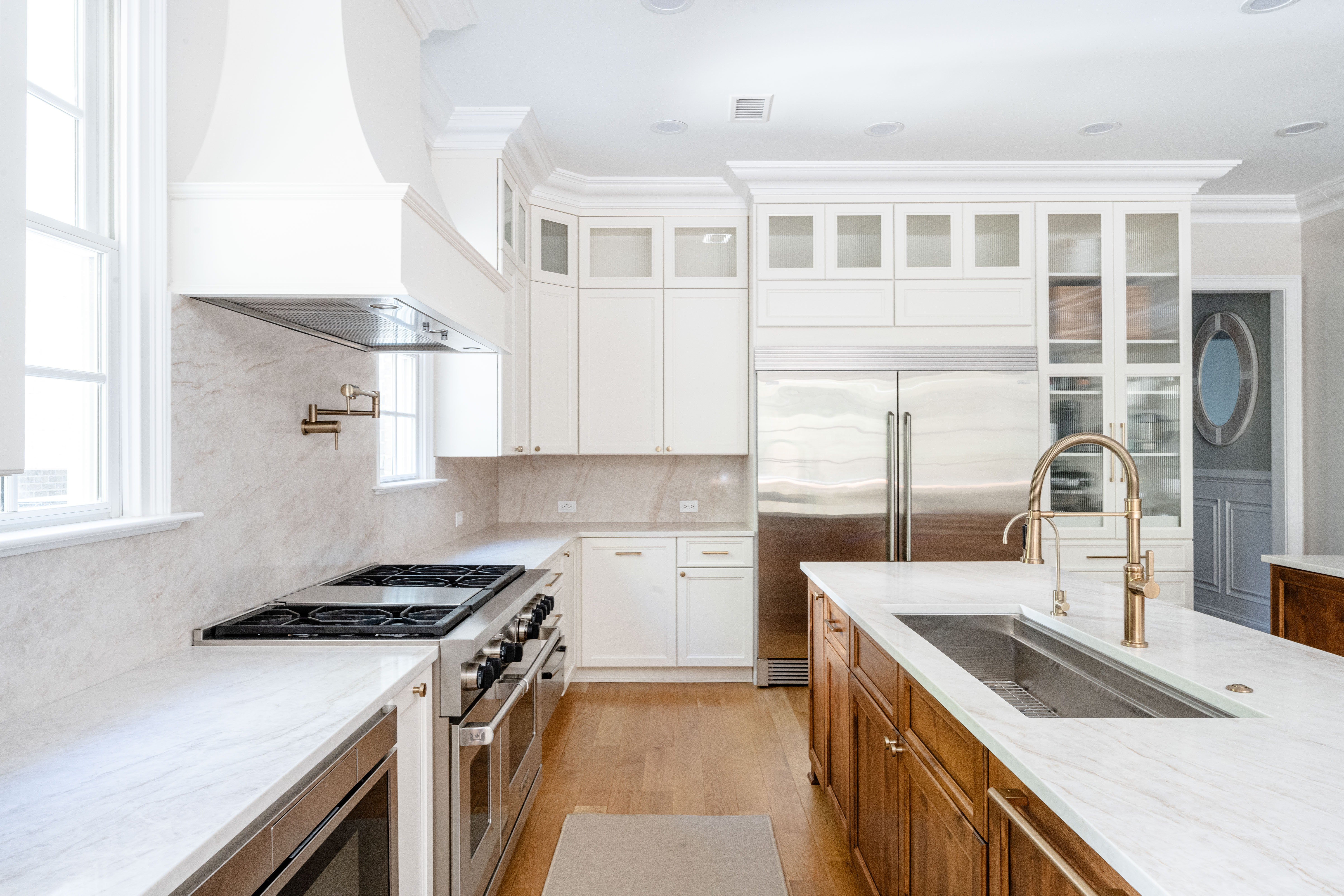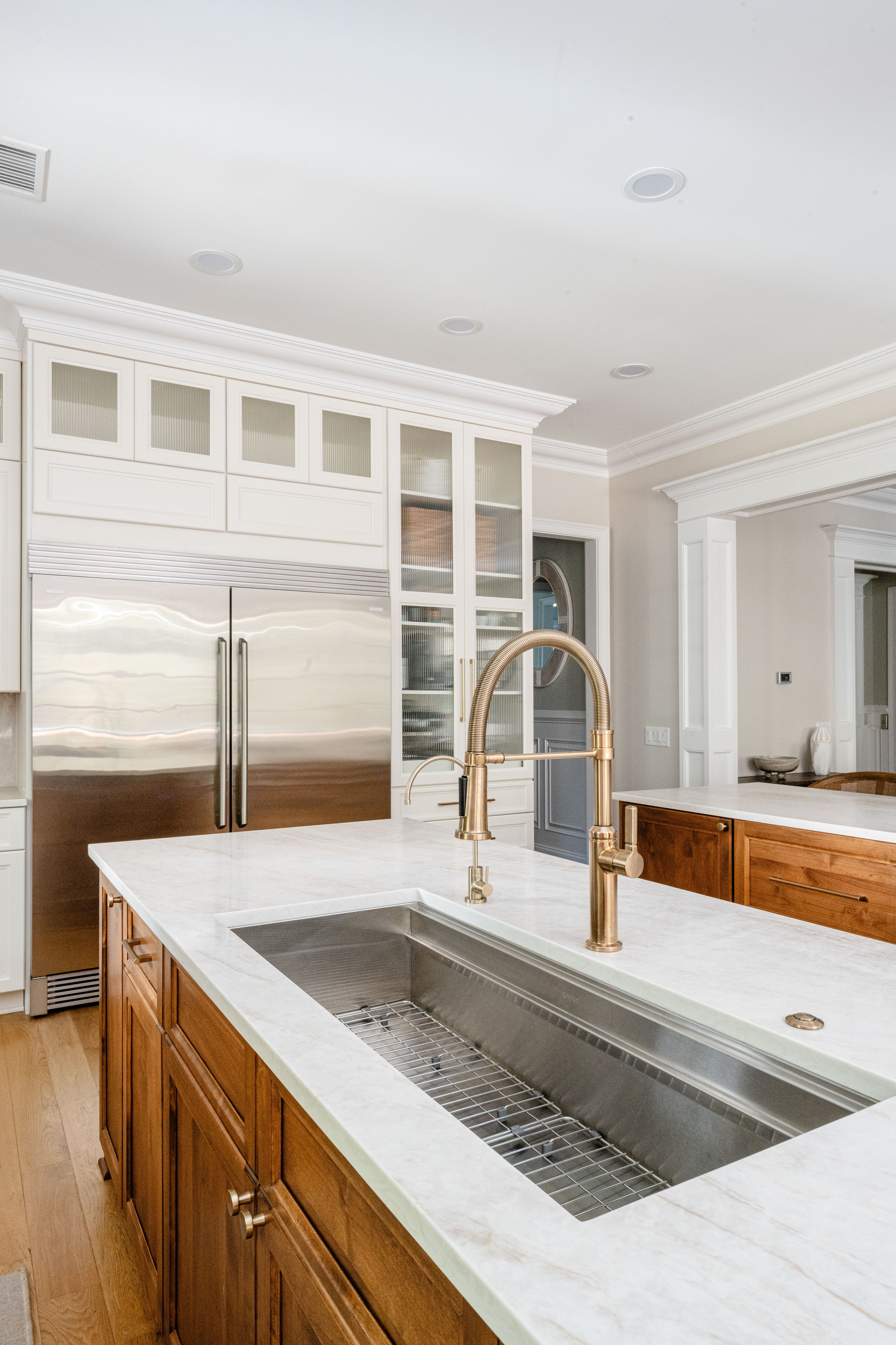 The kitchen saw the most dramatic transformation. Dual islands now define the space, with one dedicated to prep and the other designed for gathering. Because the homeowners cook often and serve large meals, two smaller sinks were replaced with a 45-inch prep sink on the working island.