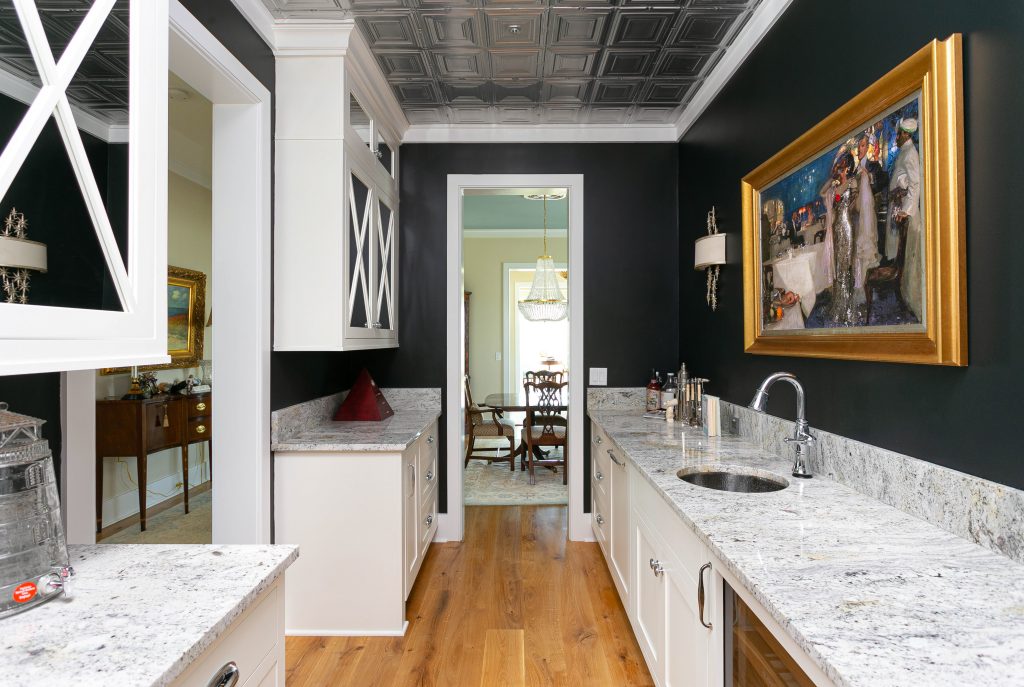 Notice how the dark cabinet color doesn’t travel up to the crown molding. Keep ceiling space white to prevent adding too much visual weight. This home’s kitchen and laundry room designs are a perfect example of how decorating your home with dark colors can still be bright and uplifting.