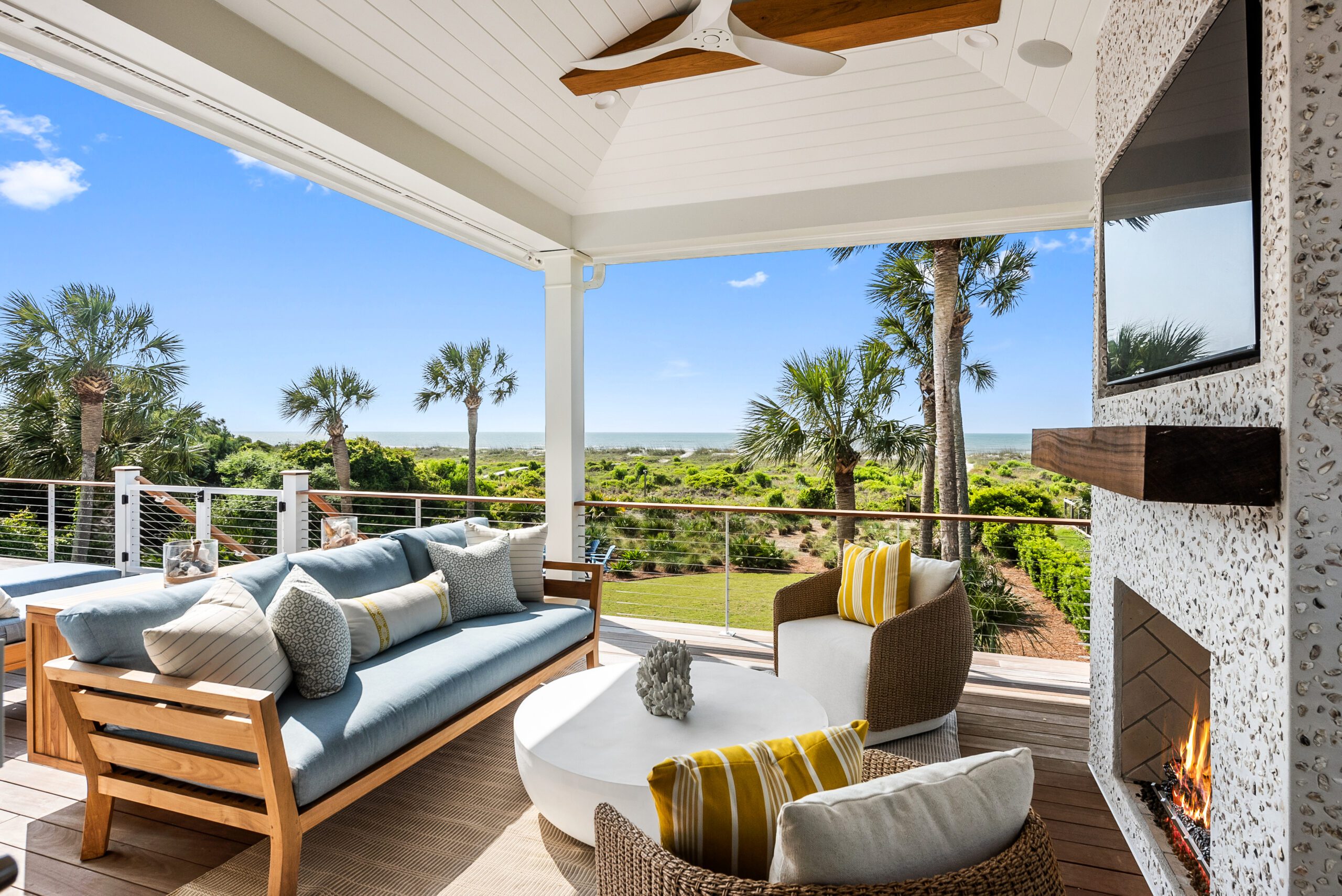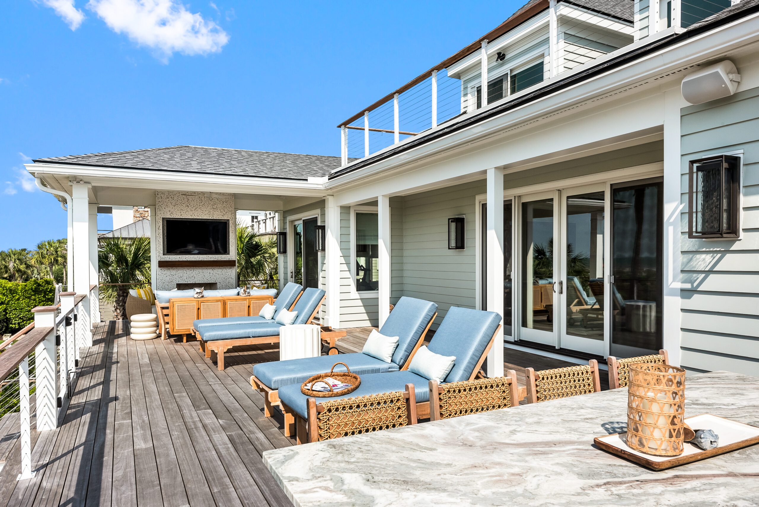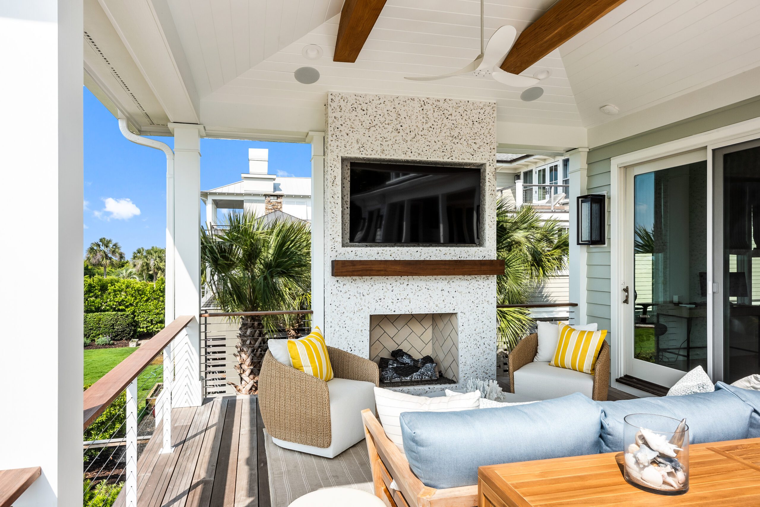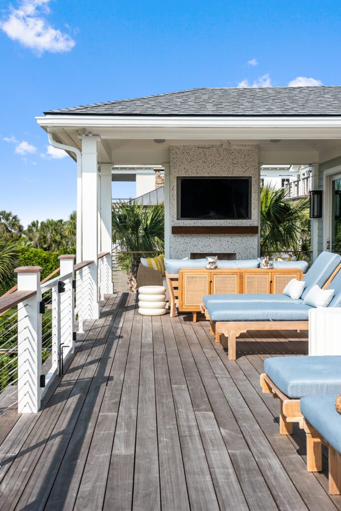 To make the most of the home’s limited outdoor space, a new deck with an outdoor kitchen by Charleston Design Center and covered living space sits in front of a tabby stucco fireplace decorated in coastal form with a natural wood mantel.