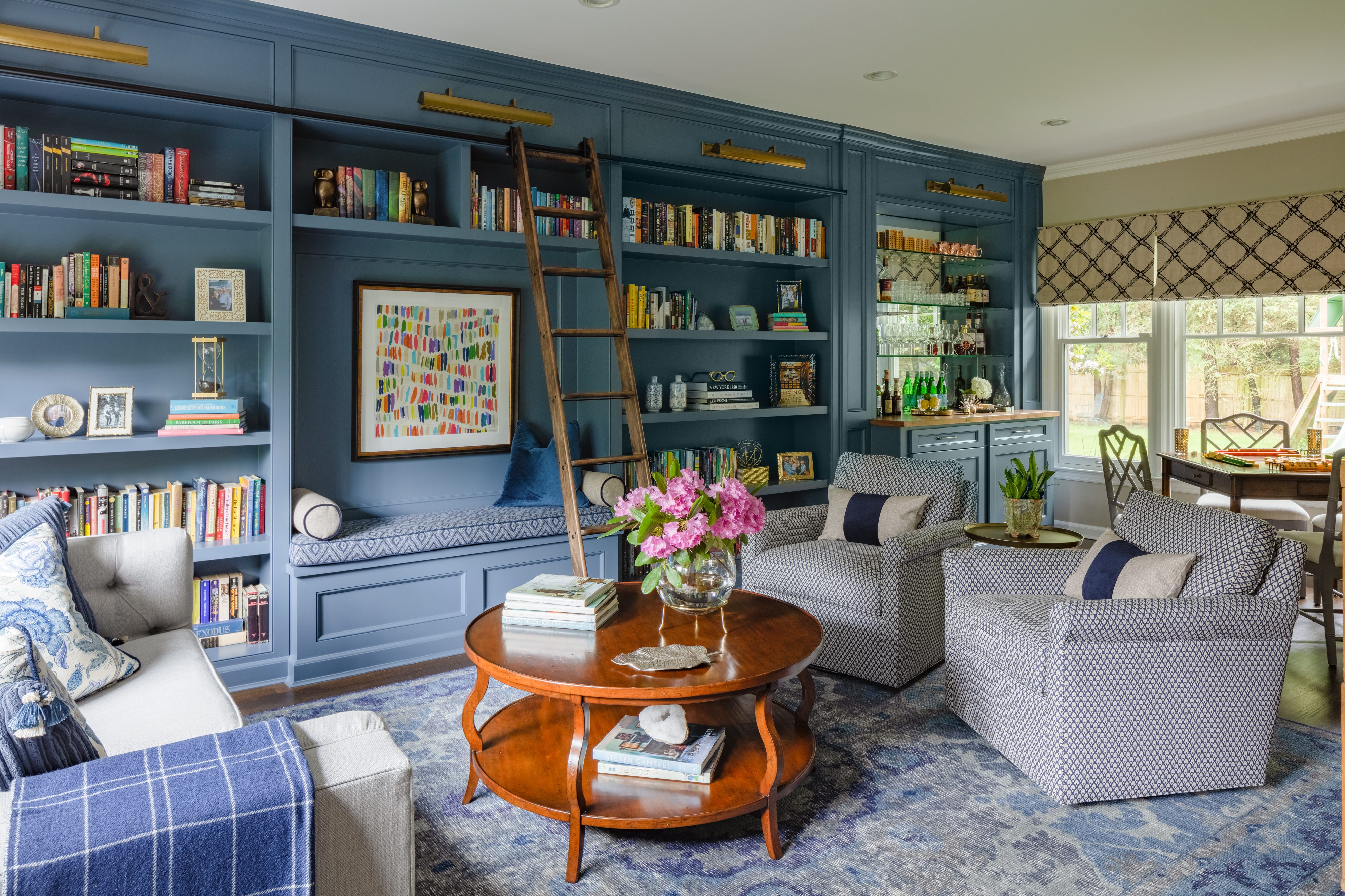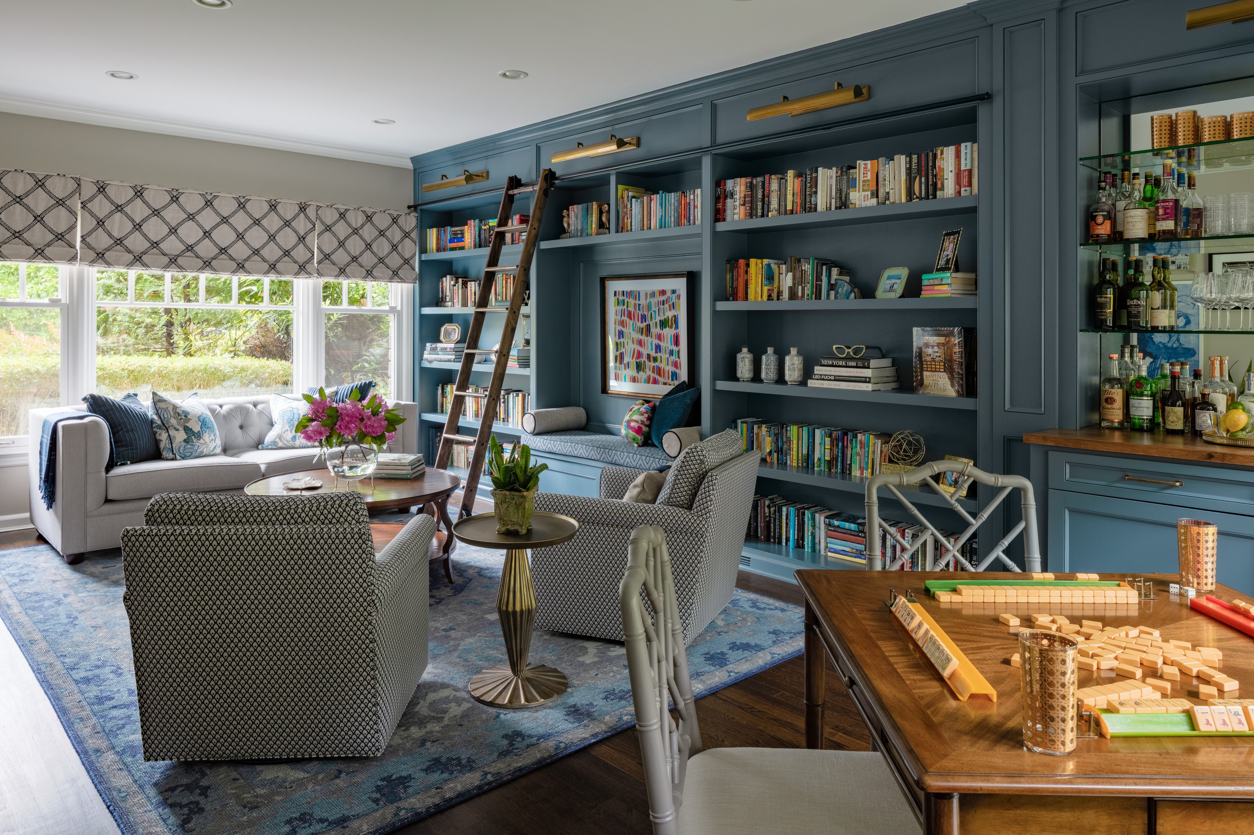 The homeowners turned to JV Design Style to create a versatile area that would work for every family member, regardless of age. The design features a built-in bookshelf, a rolling ladder for avid readers, and a dedicated Mahjong area for game nights.