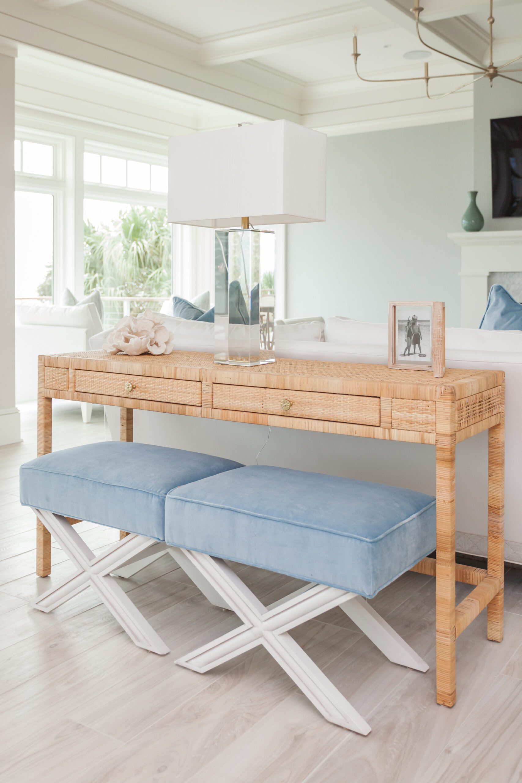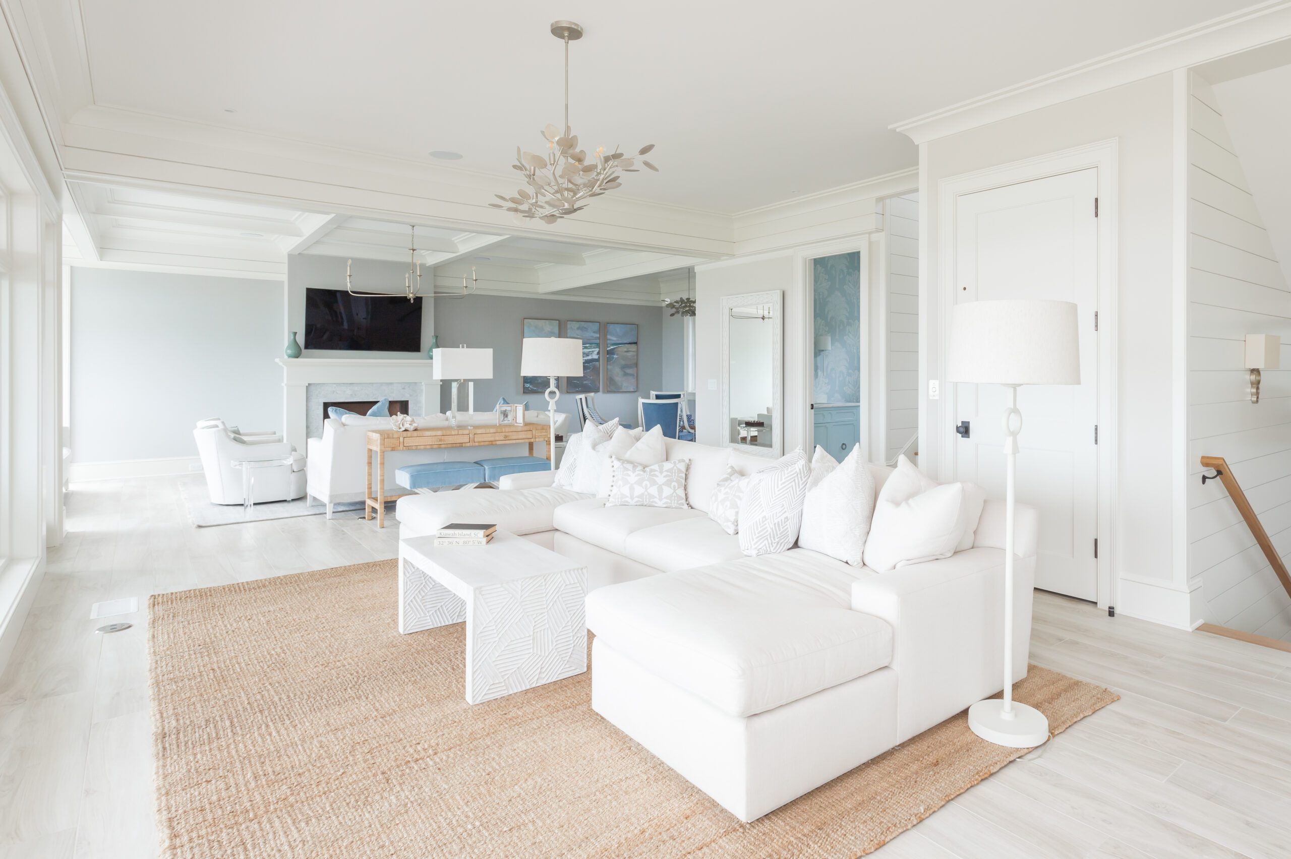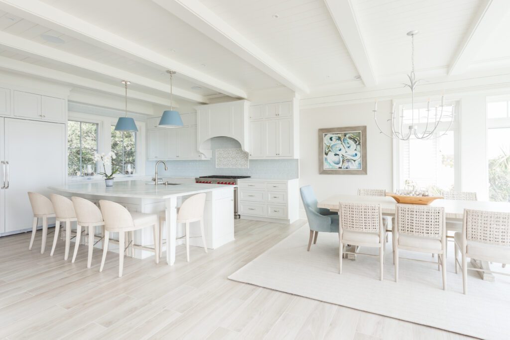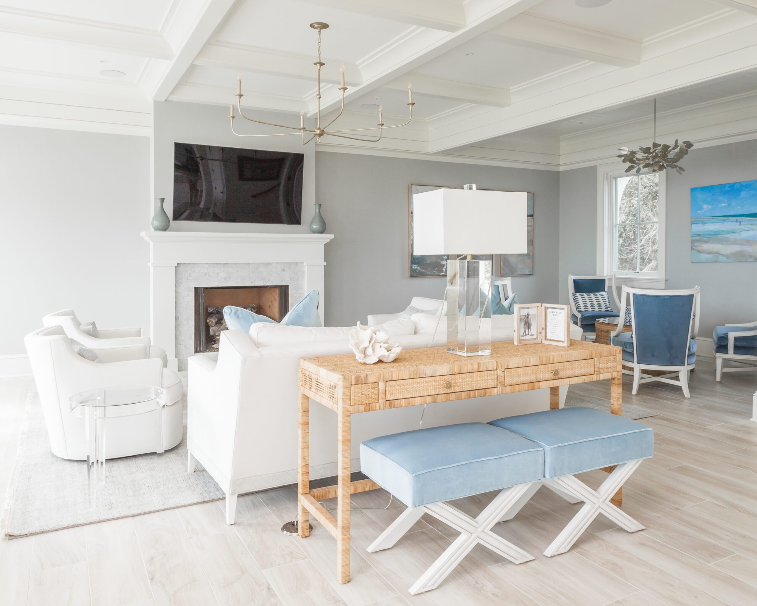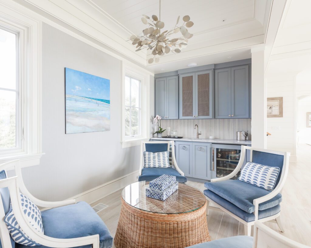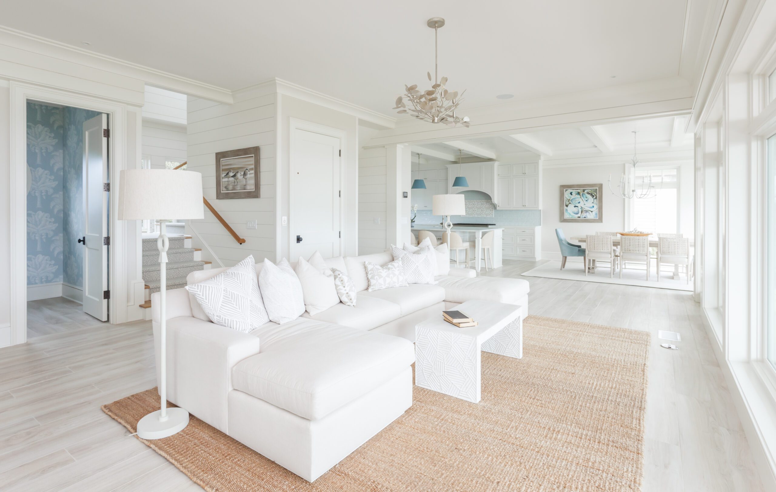 This beachfront home was designed around an open concept divided by strategic design to separate these zones for entertainment and relaxation. The phrase their clients used to describe their vision was “a nod to the sea” which informed the design selections and color palette throughout the rest of the home. The coastal feel was emphasized by a shiplap stairwell, trim painting Ben Moore White Dove, and walls awash in Ben Moore Wind’s Breath. Woven jute materials add warmth to the white performance fabric upholstery on the sectional sofa that sits upon tile floors laid to mimic the look of natural wood.