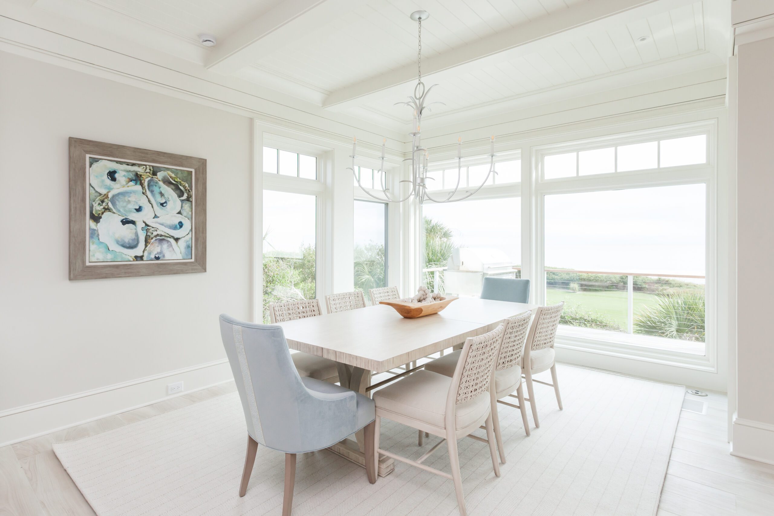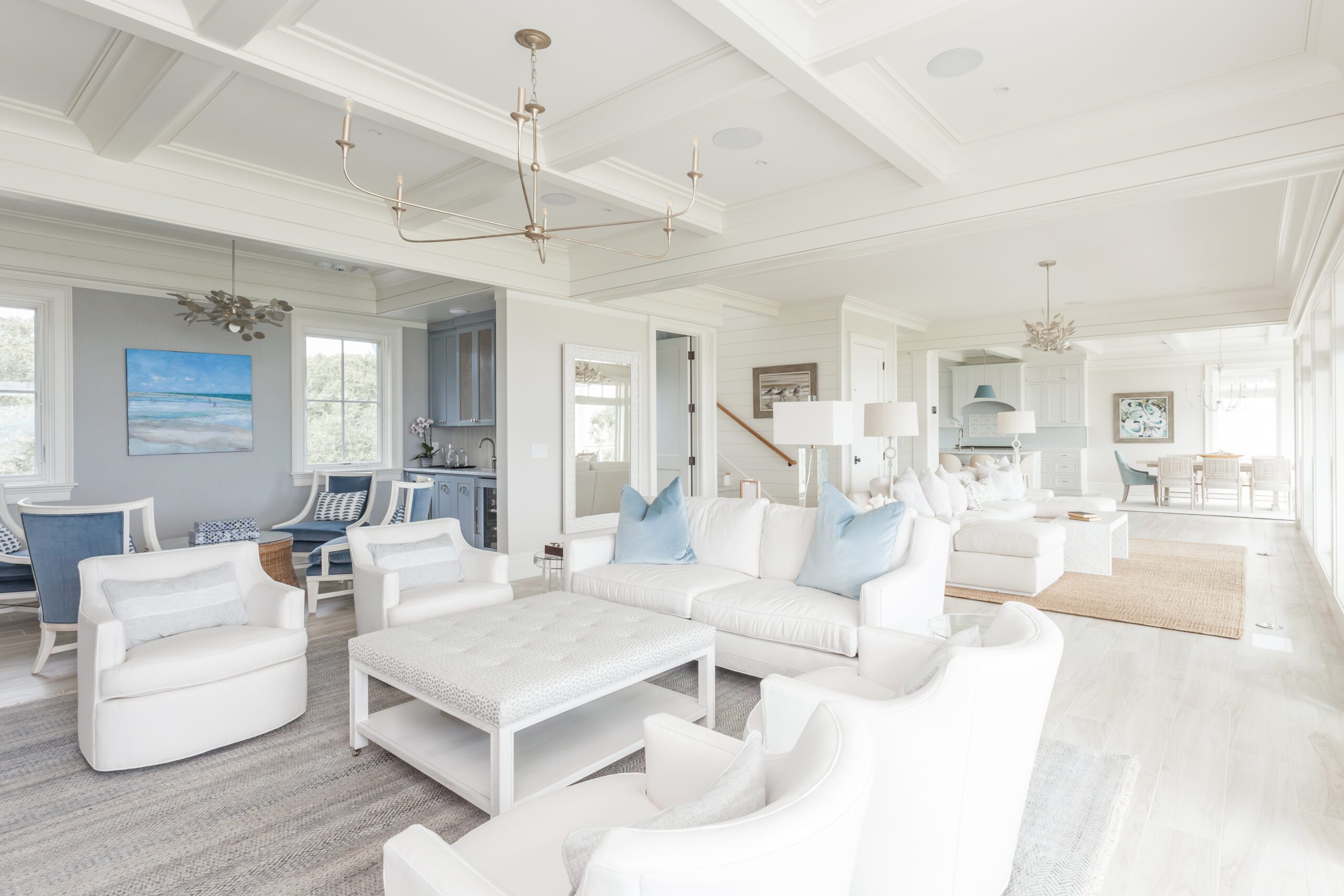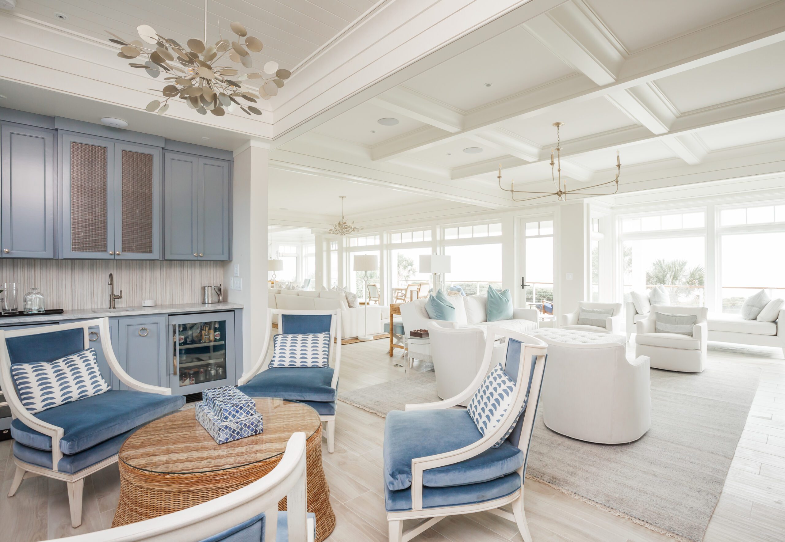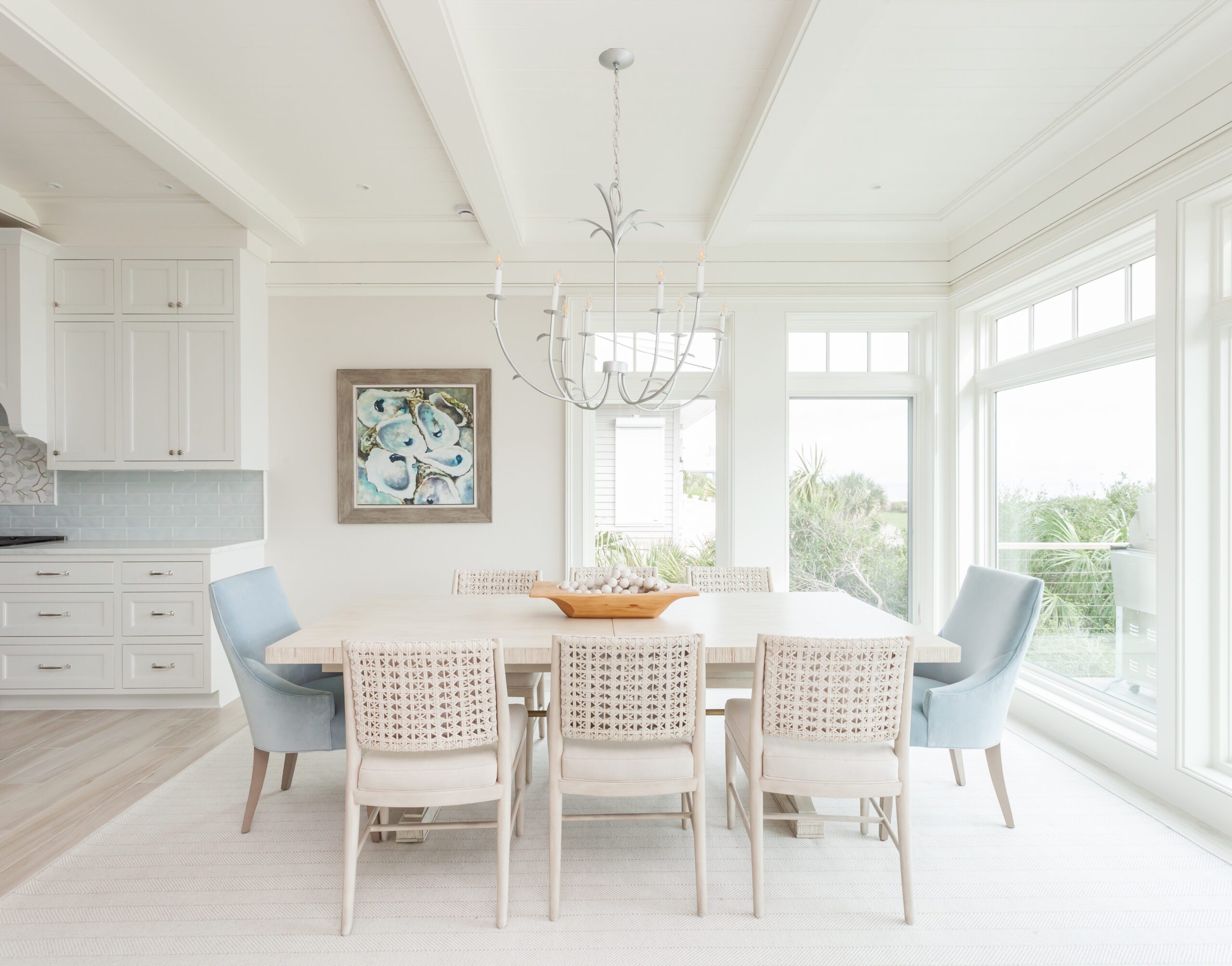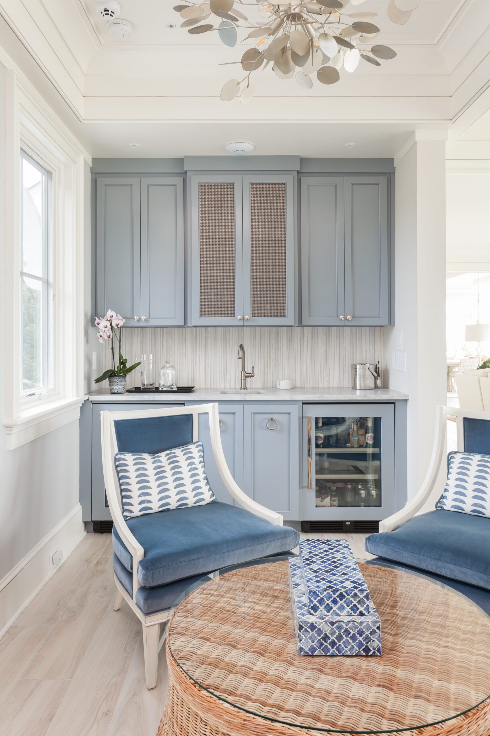 This beachfront home was designed around an open concept divided by strategic design to separate these zones for entertainment and relaxation. The phrase their clients used to describe their vision was “a nod to the sea” which informed the design selections and color palette throughout the rest of the home. The coastal feel was emphasized by a shiplap stairwell, trim painting Ben Moore White Dove, and walls awash in Ben Moore Wind’s Breath. Woven jute materials add warmth to the white performance fabric upholstery on the sectional sofa that sits upon tile floors laid to mimic the look of natural wood.
