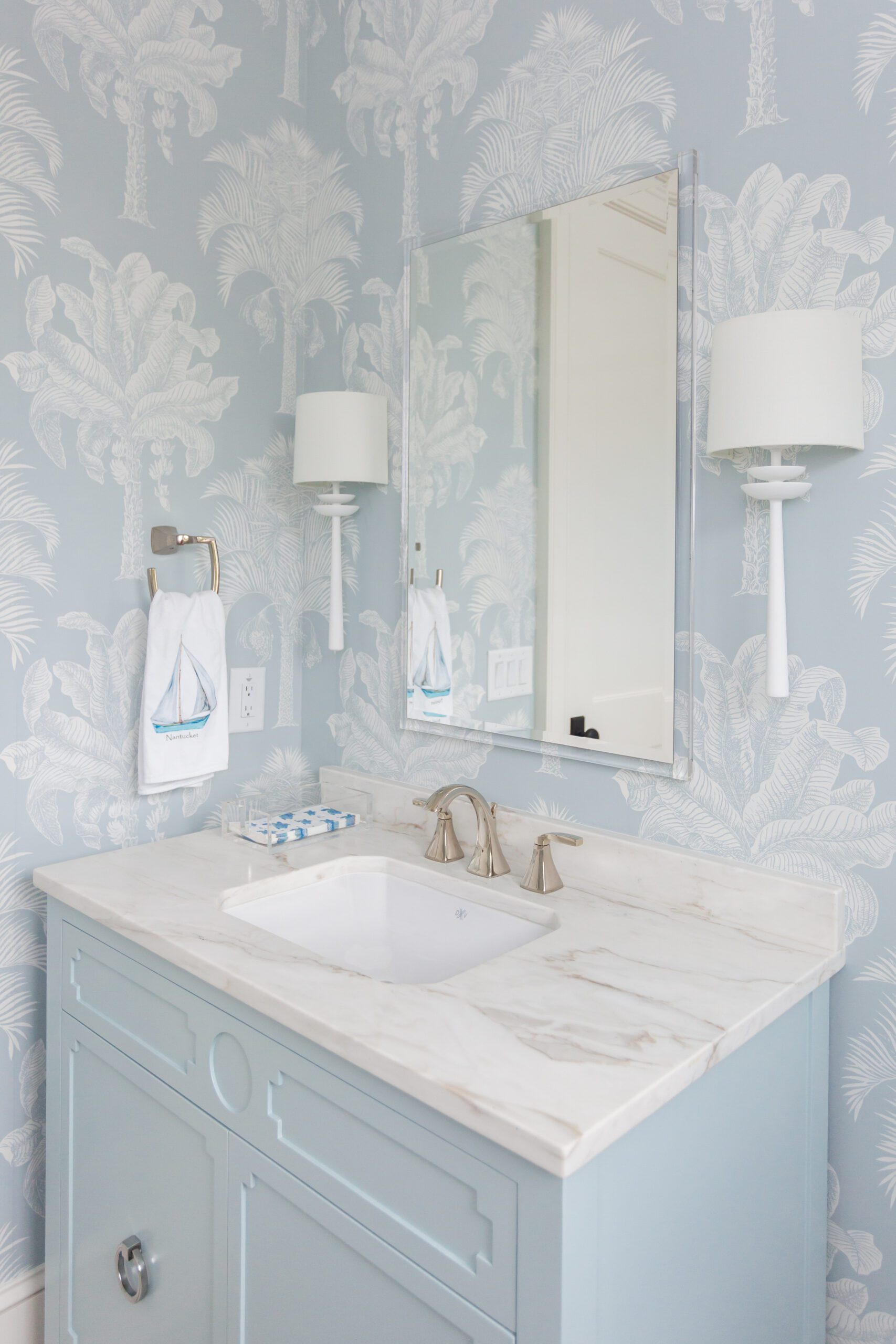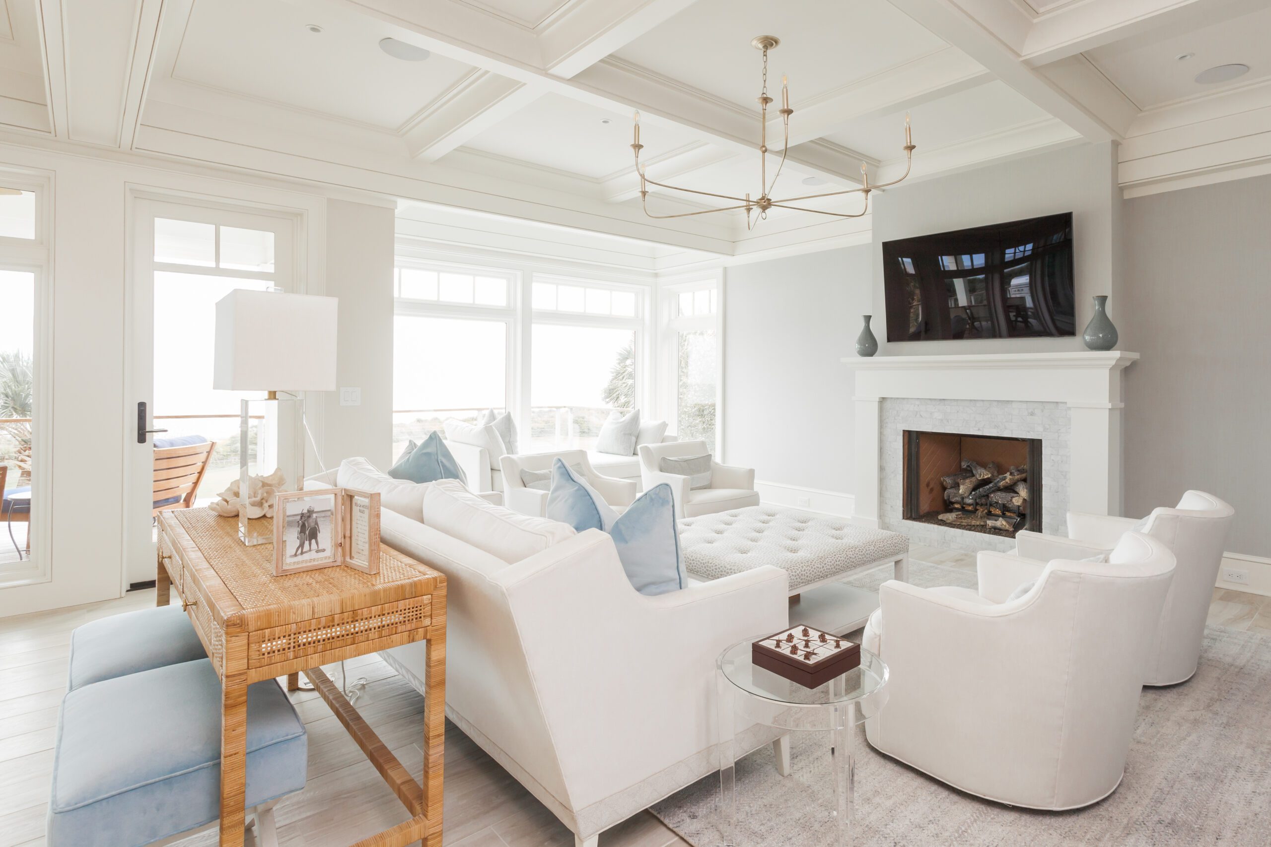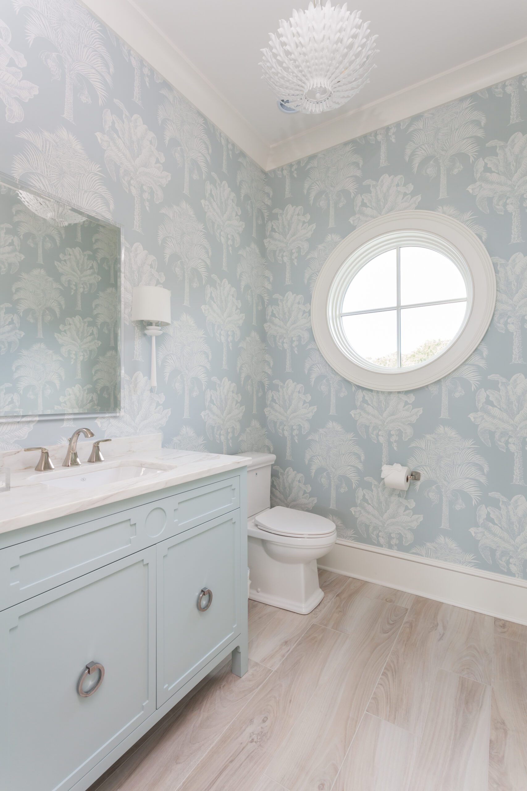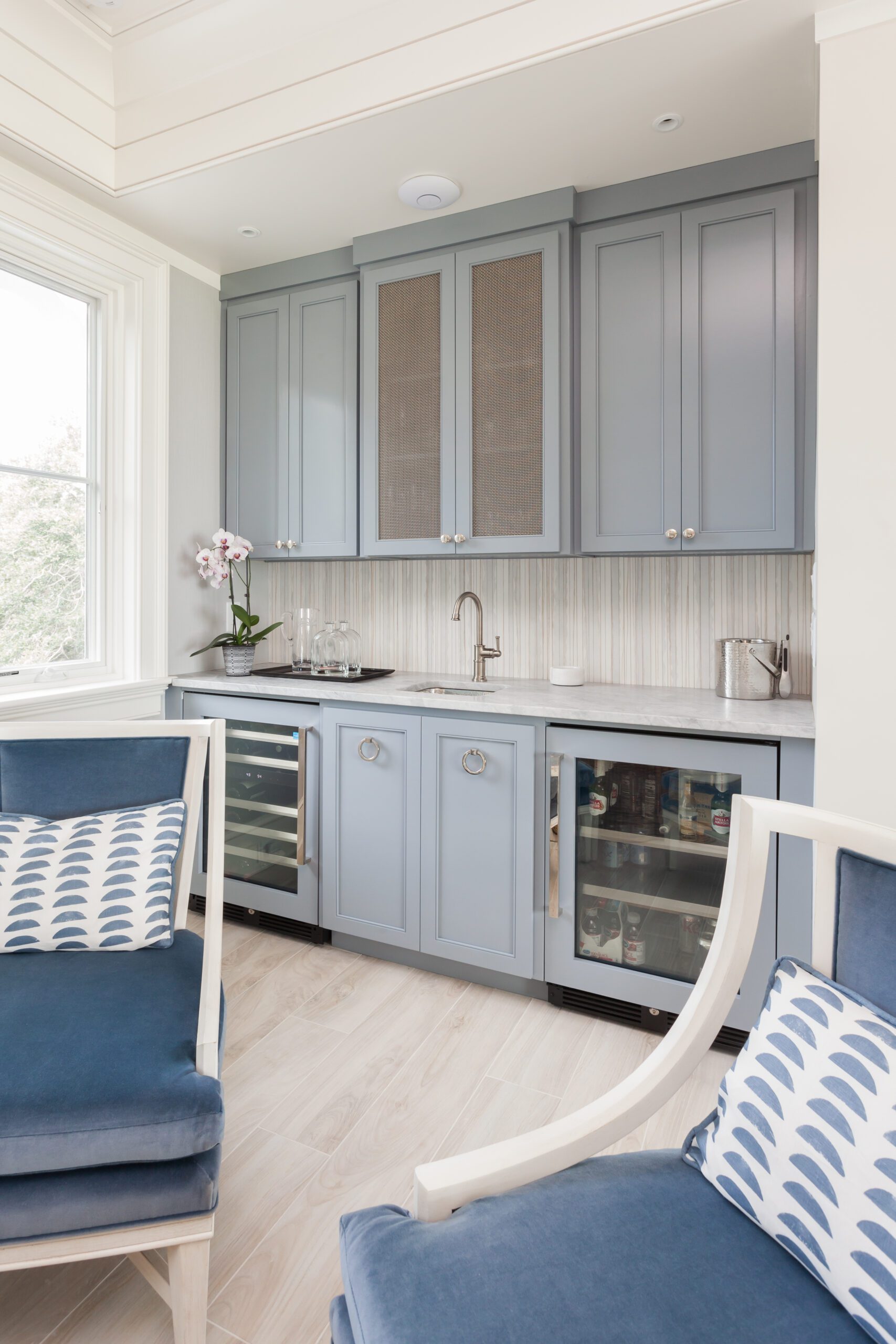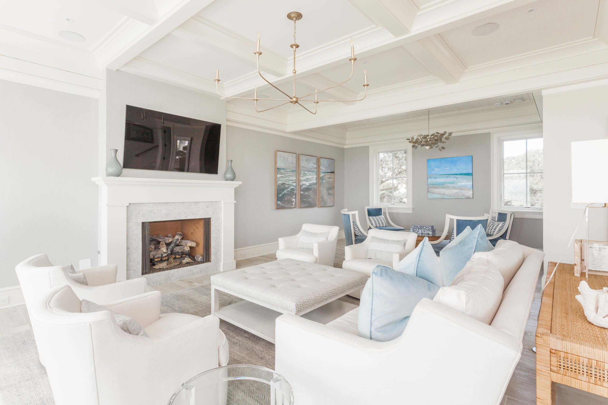 This beachfront home was designed around an open concept divided by strategic design to separate these zones for entertainment and relaxation. The phrase their clients used to describe their vision was “a nod to the sea” which informed the design selections and color palette throughout the rest of the home. The coastal feel was emphasized by a shiplap stairwell, trim painting Ben Moore White Dove, and walls awash in Ben Moore Wind’s Breath. Woven jute materials add warmth to the white performance fabric upholstery on the sectional sofa that sits upon tile floors laid to mimic the look of natural wood.