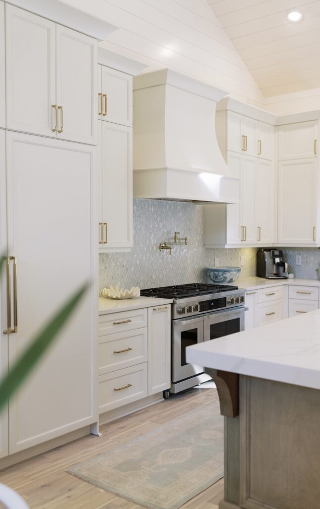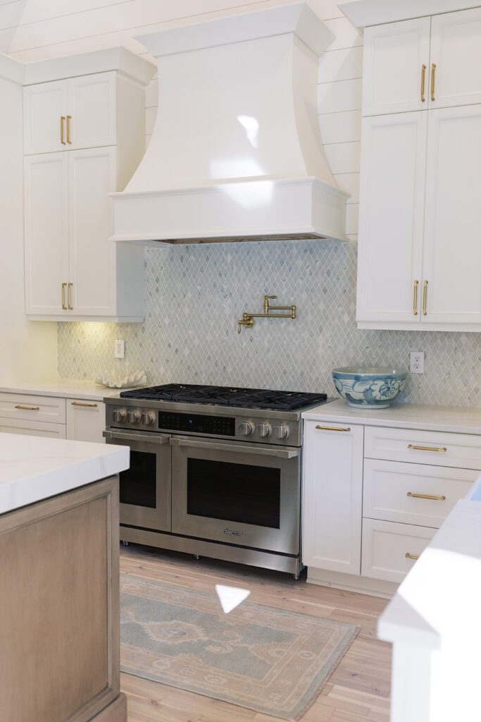 Kaitlyn Gentry, interior designer and co-owner of The Village Social was able to create a design scheme that embraced all of their wants and needs in a refreshing kitchen design. Kaitlyn’s material selections included wide plank white oak hardwoods, fresh white shaker-style cabinetry, and a decorative range hood to match. She chose to tile the backsplash halfway to meet the shiplap wall panels that cover the rest of the space. Brass linear pulls mirror the finish of the wall-mounted pot filler above the range. The vintage Turkish runner sourced from Zuma grounds the space with a gentle reflection of the surrounding color palette.
